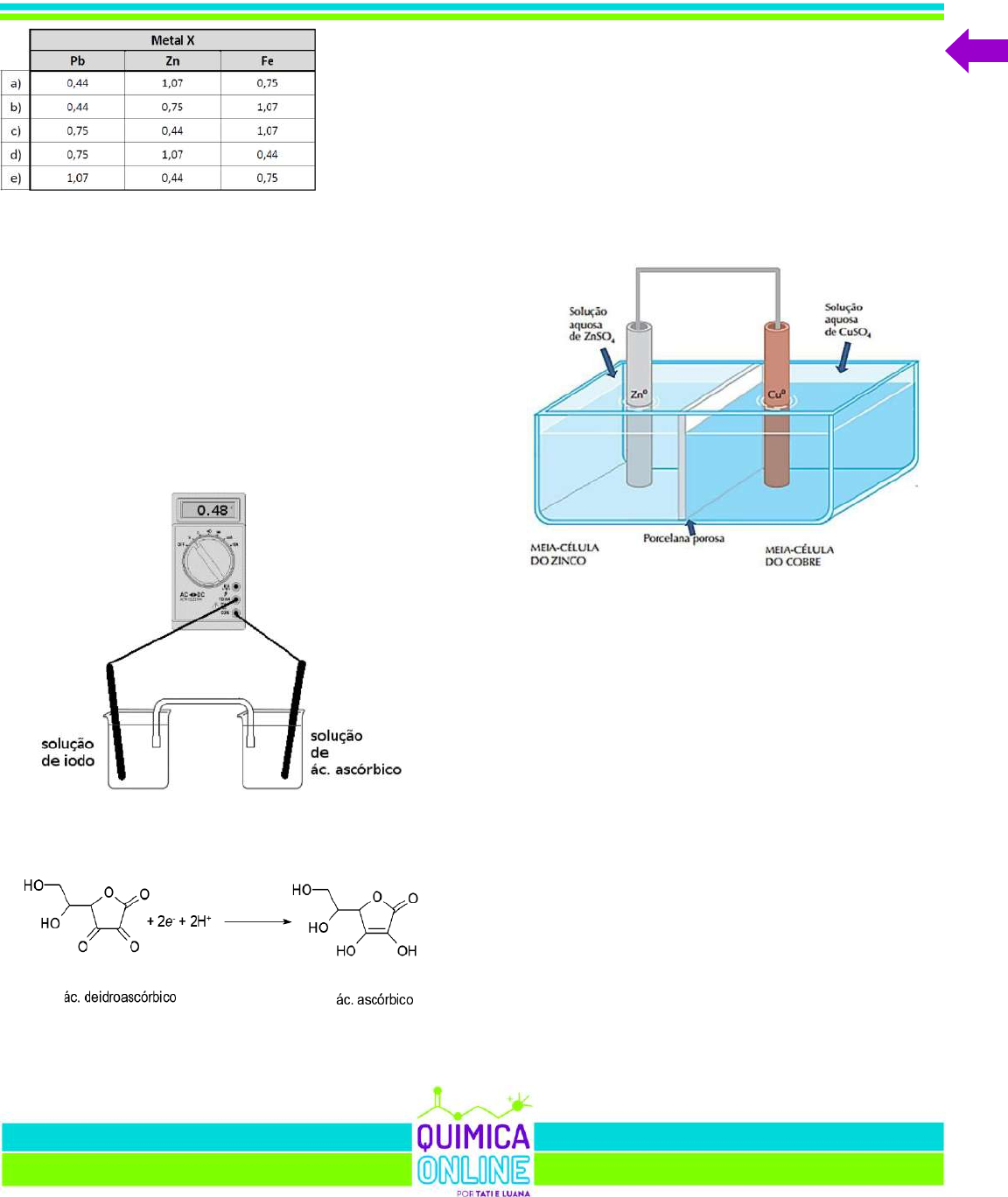 3000 QUESTÕES DE QUÍMICA 554 129 - (UFPR) O ácido ascórbico é uma das formas da vitamina C que apresenta propriedade antioxidante. Na indústria de alimentos, ele é largamente utilizado como aditivo para prevenir a oxidação. Uma maneira de analisar a quantidade de ácido ascórbico em bebidas é através de uma reação de oxirredução utilizando iodo. Com base nisso, foi montada uma pilha, conforme ilustração abaixo, contendo eletrodos inertes de platina ligados a um voltímetro. Foram mantidas condições padrão (298 K, 1 atm e 1 mol L–1) para o experimento, e no instante em que se fechou o circuito, conectando-se os fios ao voltímetro, o valor de potencial medido foi de 0,48 V. Sabendo que o potencial padrão de redução de iodo a iodeto é de E0 = 0,54 V, o potencial padrão da reação abaixo é: a) 0,03 V. b) 0,06 V. c) 0,24 V. d) 0,48 V. e) 1,02 V. 130 - (UDESC SC) A figura abaixo representa uma pilha formada por uma placa de zinco e outra de cobre, mergulhadas em soluções de seus respectivos sulfatos, conectadas por um fio metálico. Além disso, existe uma membrana porosa que separa os compartimentos das duas meias-células. (Fonte: Adaptado de Feltre, R. Química. v.2, 6 ed. São Paulo: Moderna, 2004.) Sabendo que o potencial padrão de redução a 25ºC, em relação ao eletrodo padrão de hidrogênio, é de +0,34 V para a semirreação Cu2+ (aq) + 2 e– Cu(s), e de –0,76 V para a semirreação Zn2+ + 2e– Zn (s), assinale a alternativa incorreta. a) Após certo tempo de funcionamento da pilha, haverá espessamento da placa de cobre e diminuição da massa da placa de zinco. b) No cátodo ocorrerá o processo de redução e no ânodo a oxidação. c) Haverá oxidação na meia-célula do zinco e redução na meia-célula do cobre. d) Durante o processo de oxirredução haverá mobilidade de íons por meio da porcelana porosa. e) Durante o processo de oxirredução haverá fluxo de elétrons da placa de zinco para a placa de cobre por meio da porcelana porosa. 131 - (FPS PE) → → 3000 QUESTÕES DE QUÍMICA 555 A tabela abaixo mostra os valores de potencial padrão de algumas semirreações. Considerando apenas as informações da tabela, indique a alternativa correta. a) A pilha de maior potencial padrão possui ânodo de prata e cátodo de zinco. b) Dentre os metais apresentados, o zinco é o melhor agente redutor. c) A pilha formada por eletrodos de cobre (Cu/Cu2+) e chumbo (Pb/Pb2+) possui potencial-padrão igual a 0,21V. d) O íon Zn2+ recebe elétrons mais facilmente que o íon Pb2+. e) A reação Cu (s) + Zn2+ (aq) Cu2+ (aq) + Zn (s) é espontânea. 132 - (FGV SP) Certas pilhas em formato de moeda ou botão, que são usadas em relógios de pulso e em pequenos aparelhos eletrônicos, empregam os metais zinco e prata em seu interior. Uma delas é representada no esquema da figura a seguir, e os potenciais padrão de redução são fornecidos para reações envolvendo os seus componentes. Zn2+(aq) + 2e– Zn(s) Eº = –0,76 V Ag2O(s) + H2O(l) + 2e– 2 Ag(s) + 2OH–(aq) Eo = +0,80 V Considerando-se a pilha representada no esquema, a substância I, o potencial padrão teórico e os produtos da reação global são, respectivamente: a) zinco metálico; + 0,04 V; prata metálica e hidróxido de zinco. b) zinco metálico; + 1,56 V; prata metálica e hidróxido de zinco. c) zinco metálico; + 1,56 V; óxido de prata e hidróxido de zinco. d) prata metálica; + 0,04 V; óxido de prata e zinco metálico. e) prata metálica; + 1,56 V; óxido de prata e zinco metálico. 133 - (Universidade Iguaçu RJ) As pilhas, nos dias atuais, têm mais aplicação devido aos avanços tecnológicos que estão em diversos aparelhos que são utilizados pela população, como os telefones celulares que se adequaram às baterias de lítio, mas que já usaram, pelo menos, três tipos de baterias, como as de níquel, de cádmio, de níquel-hidreto e de íon-lítio. Os automóveis usam baterias chumbo-ácidas e os ponteiros a laser dos conferencistas usam pilhas feitas de óxido de mercúrio ou de prata. Recentemente, foram desenvolvidas as pilhas de zinco e oxigênio do ar, usadas nos pequenos aparelhos de surdez com a finalidade de minimizar as agressões ambientais. Para confeccionar essas pilhas, partículas de zinco metálico são misturadas a um eletrólito solução de hidróxido de potássio e reagem com o O2, transformando energia química em energia elétrica. Considerando-se essas informações e os conhecimentos sobre Eletroquímica, é correto afirmar: 01) No ânodo da pilha, ocorre redução. 02) No cátodo, ocorre a redução do zinco. 03) A diferença de potencial da pilha é +1,65 V. 04) O agente oxidante nessa reação é o zinco. 05) Durante o funcionamento da pilha, haverá diminuição da quantidade de Zn(OH)2. → → → 3000 QUESTÕES DE QUÍMICA 556 134 - (UECE) As pilhas de marca-passo precisam ser pequenas, confiáveis e duráveis, evitando algumas cirurgias para sua troca. Como não formam gases, elas podem ser hermeticamente fechadas. Sua duração é de aproximadamente 10 anos. Essas pilhas são formadas por lítio metálico e iodo (LiI). Assinale a alternativa que mostra as semirreações que ocorrem corretamente para formar o produto LiI. a) cátodo: 2Lio 2Li+ + 2e–; ânodo: I2 + 2e– 2I–. b) cátodo: 2Lio + 2e– 2Li+; ânodo: I2 2I– + 2e–. c) ânodo: 2Lio 2Li+ + 2e–; cátodo: I2 + 2e– 2I–. d) ânodo: 2Lio + 2e– 2Li+; cátodo: I2 2I– + 2e–. 135 - (PUC RS) O funcionamento da pilha comumente utilizada em controles remotos de TV, também conhecida como pilha seca ou de Leclanché, é expresso pela equação química a seguir: Zn(s) + 2 MnO2(s) + 2 NH4 +(aq) Zn2+(aq) + Mn2O3(s) +2 NH3(g) + H2O(l) Um dos motivos de essa pilha não ser recarregável é porque a) a reação ocorre em meio ácido. b) a pilha é lacrada para evitar vazamentos. c) o processo inverso necessita de muita energia. d) a massa dos produtos é igual à massa 