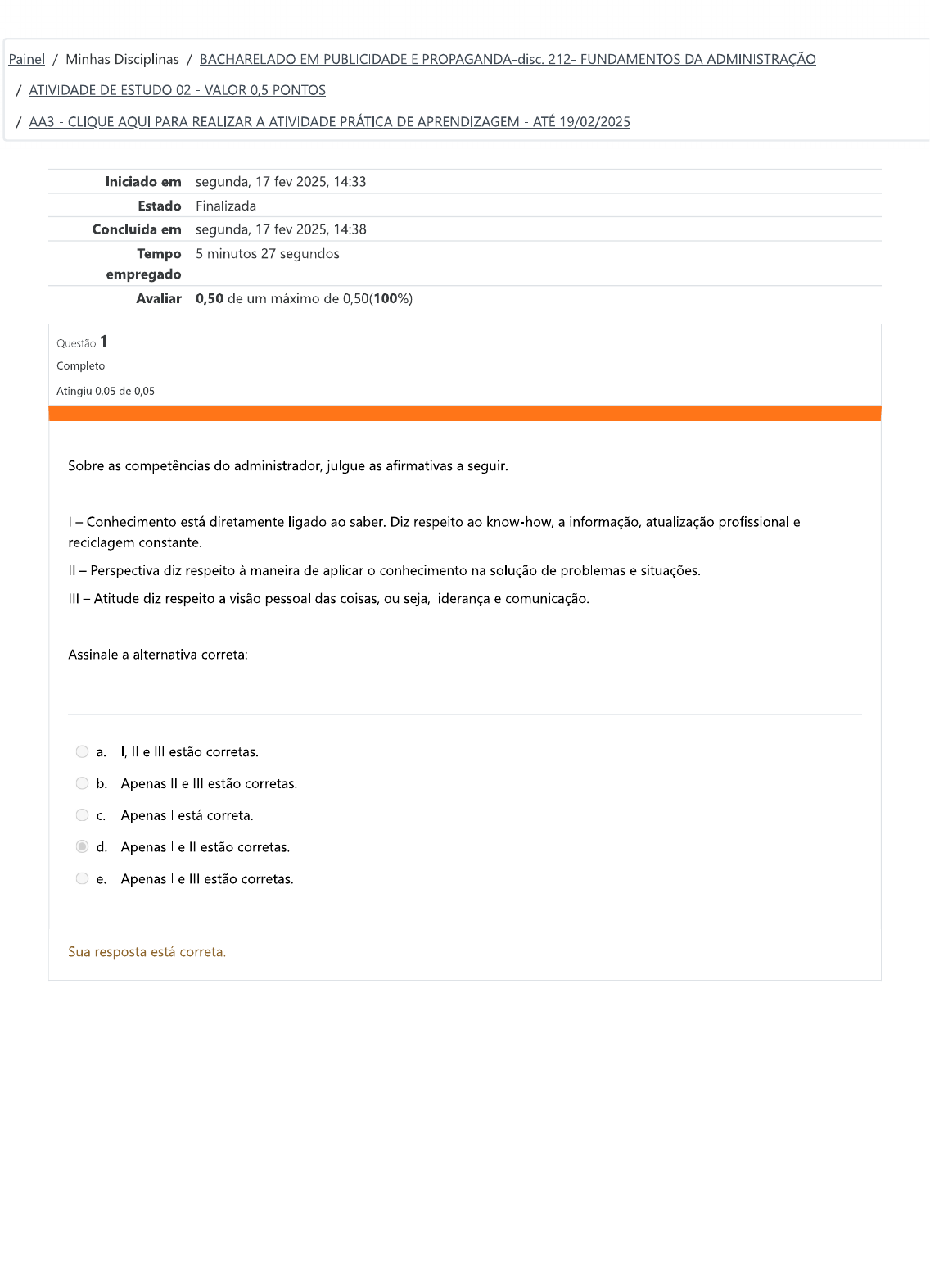Painel / Minhas Disciplinas / BACHARELADO EM PUBLICIDADE E PROPAGANDA-disc. 212- FUNDAMENTOS DA ADMINISTRAÇÃO / ATIVIDADE DE ESTUDO 02 - VALOR 0,5 PONTOS / AA3 - CLIQUE AQUI PARA REALIZAR A ATIVIDADE PRÁTICA DE APRENDIZAGEM - ATÉ 19/02/2025 Iniciado em segunda, 17 fev 2025, 14:33 Estado Finalizada Concluída em segunda, 17 fev 2025, 14:38 Tempo 5 minutos 27 segundos empregado Avaliar 0,50 de um máximo de 0,50(100%) Questão 1 Completo Atingiu 0,05 de 0,05 Sobre as competências do administrador, julgue as afirmativas a seguir. - Conhecimento está diretamente ligado ao saber. Diz respeito ao know-how, a informação, atualização profissional e reciclagem constante II - - Perspectiva diz respeito à maneira de aplicar o conhecimento na solução de problemas e situações. III - - Atitude diz respeito a visão pessoal das coisas, ou seja, liderança e comunicação. Assinale a alternativa correta: a. I, e III estão corretas. b. Apenas e III estão corretas. C. Apenas está correta. d. Apenas e estão corretas. e. Apenas e III estão corretas. Sua resposta está correta.Questão 2 Completo Atingiu 0,05 de 0,05 Acontece quando o receptor já tem uma imagem formada sobre o assunto em questão ou quando não simpatiza com o emissor. Nessas situações, é comum que o ouvinte se coloque nessa situação, rejeitando aquilo que é dito antes mesmo de compreender seu real significado. Assinale a alternativa correta: a. Credibilidade. b. Presunção. C. Distração. d. Confusão. e. Defensiva. Sua resposta está correta. Questão 3 Completo Atingiu 0,05 de 0,05 De acordo com Kuazaqui (2006), é função da liderança: a. Organizar setores internos da organização. b. Atuar fomentando uma cultura de competição interna estimulando o crescimento pessoal de cada empregado. C. Atuar estimulando e propiciando oportunidades para o aprimoramento das competências da força de trabalho. Esse tipo de comportamento gera vantagens, entre elas, por exemplo, a vantagem de aumentar a lealdade dos funcionários. d. Promover maior entendimento acerca de todas as atividades realizadas, principalmente aquelas de cunho operacional. e. Promover cultura organizacional ajustada as necessidades de mercado. Sua resposta está correta.Questão 4 Completo Atingiu 0,05 de 0,05 De acordo com os papéis administrativos, o líder tem como características. - - Tendência a comandar pessoas, impor ordens e ser autoritário. Também é conhecido por centralizar o poder e pensar apenas nos resultados e lucros. - Conduz as pessoas e as inspira. É conhecido por ser um motivador de sua equipe, mostrando a direção que deve seguir e, mais importante, vai junto. III - Tendência a serem muito respeitados por seus funcionários, e o respeito tem muito mais eficiência do que o temor. IV - Reter informações importantes para o desenvolvimento do trabalho Assinale a alternativa correta: a. Apenas e III estão corretas. b. Apenas III está correta. C. Apenas II, III e IV estão corretas. d. Apenas e estão corretas. e. Apenas está correta. Sua resposta está correta.Questão 5 Completo Atingiu 0,05 de 0,05 Com relação ao processo de comunicação assinale Verdadeiro (V) ou Falso (F): ( ) Chamamos de presunção, os fatores externos à mensagem que dificultam sua percepção. ( ) Etimologicamente, comunicação é uma palavra derivada do termo communicare, do latim, que poderia ser traduzido como partilhar ou tornar comum. ( ) Na busca de melhoria do processo da comunicação nas organizações a percepção do transmissor e do receptor pode funcionar como um filtro da informação, o que pode influenciar a comunicação. Assinale a alternativa correta: a. b. V-V-V. C. F-V-V. d. e. V-F-V. Sua resposta está correta. Questão 6 Completo Atingiu 0,05 de 0,05 As competências Comportamentais se referem aos padrões de comportamento e atitudes individuais. Capacitam o executivo a aliar o conhecimento técnico a um comportamento atual, moderno e correto no trato profissional e interpessoal. São consideradas como competências comportamentais. a. Flexibilidade e etiqueta empresarial. b. Ética e equilíbrio emocional. C. Processo de tomada de decisão e gestão de equipes. d. Liderança e relacionamento interpessoal. e. Empreendedorismo e trabalho em equipe. Sua resposta está correta.Questão 7 Completo Atingiu 0,05 de 0,05 A comunicação sempre foi reconhecida como sendo de extrema importância nas atividades das organizações ou das pessoas, e essa importância tende a cada vez mais aumentar sua influência nos resultados, pois a velocidade da comunicação aumenta a cada dia que passa. Sobre comunicação empresarial é correto o que se afirma em: a. A comunicação empresarial é a maneira com que uma organização se comunica com os stakeholders. b. Importante, porém não tem papel essencial na administração da empresa, pois as preocupações do administrador são outras, como custos de insumos por exemplo. C. Deve ser considerada como fundamental nos departamentos que possuem contato direto com o cliente, nos demais pode ter menor foco. d. processo da comunicação é simples: basta passar a informação adiante. e. Pode ocorrer a partir do envolvimento de apenas uma das partes. Sua resposta está correta. Questão 8 Completo Atingiu 0,05 de 0,05 A cultura organizacional tem a ver com um sistema de valores compartilhado pelos colaboradores de uma organização; é a sua marca distintiva, evidenciando como ela difere de outras organizações; é ainda "o jeito como fazemos as coisas", expressão muito ouvida em diversas empresas. A cultura organizacional tem como características: I. Cada organização desenvolve sua própria cultura. II. Não pode ser "tocada", porém pode ser percebida no âmbito geral da organização. III. Passa de funcionário para funcionário. Assinale a alternativa correta: a. III apenas. b. I, e III. C. e III apenas. d. apenas. e. e III apenas. Sua resposta está correta.Questão 9 Completo A