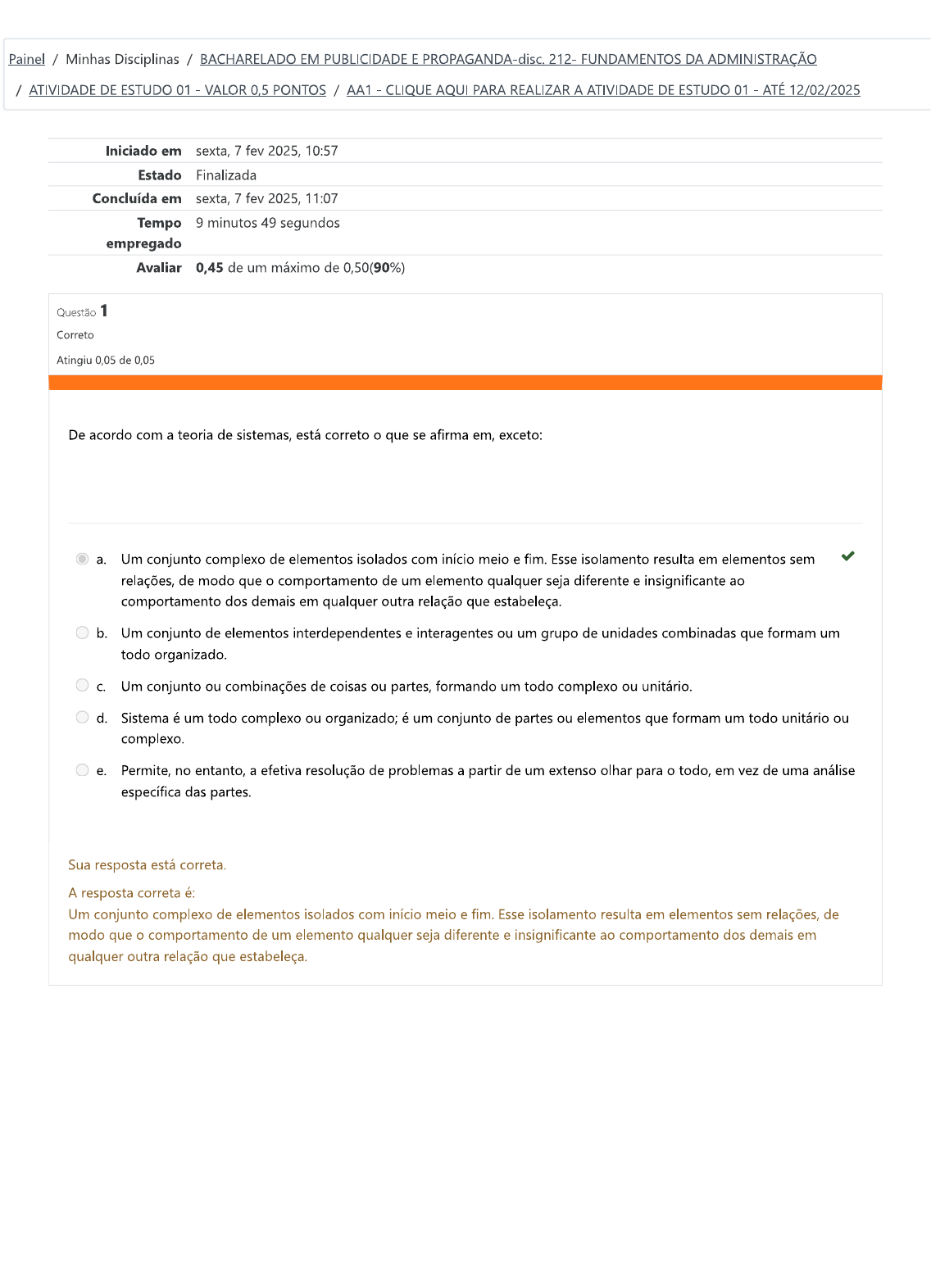 Painel / Minhas Disciplinas / BACHARELADO EM PUBLICIDADE E PROPAGANDA-disc. 212- FUNDAMENTOS DA ADMINISTRAÇÃO / ATIVIDADE DE ESTUDO 01 VALOR 0,5 PONTOS / AA1 - CLIQUE AOUI PARA REALIZAR A ATIVIDADE DE ESTUDO 01 ATÉ 12/02/2025 Iniciado em sexta, 7 fev 2025, 10:57 Estado Finalizada Concluída em sexta, 7 fev 2025, 11:07 Tempo 9 minutos 49 segundos empregado Avaliar 0,45 de um máximo de 0,50(90%) Questão 1 Correto Atingiu 0,05 de 0,05 De acordo com a teoria de sistemas, está correto o que se afirma em, exceto: a. Um conjunto complexo de elementos isolados com início meio e fim. Esse isolamento resulta em elementos sem relações, de modo que o comportamento de um elemento qualquer seja diferente e insignificante ao comportamento dos demais em qualquer outra relação que estabeleça. b. Um conjunto de elementos interdependentes e interagentes ou um grupo de unidades combinadas que formam um todo organizado. C. Um conjunto ou combinações de coisas ou partes, formando um todo complexo ou unitário. d. Sistema é um todo complexo ou organizado; é um conjunto de partes ou elementos que formam um todo unitário ou complexo. e. Permite, no entanto, a efetiva resolução de problemas a partir de um extenso olhar para o todo, em vez de uma análise específica das partes. Sua resposta está correta. A resposta correta é: Um conjunto complexo de elementos isolados com início meio e fim. Esse isolamento resulta em elementos sem relações, de modo que o comportamento de um elemento qualquer seja diferente e insignificante ao comportamento dos demais em qualquer outra relação que estabeleça.Questão 2 Correto Atingiu 0,05 de 0,05 São Características das Organizações como Sistemas Abertos: I. As organizações são sistemas abertos, são afetadas por mudanças em suas variáveis externas desconhecidas e incontroláveis em seu comportamento. II. As organizações são vistas como sistemas dentro de sistemas. III. A organização é um sistema social com partes independentes, mas inter-relacionadas. Está correto o que se afirma em: a. I, e III. b. e III apenas. C. apenas. d. le apenas. e. apenas. Sua resposta está correta. A resposta correta é: I, II III. Questão 3 Correto Atingiu 0,05 de 0,05 As organizações como partes de uma sociedade maior e constituída de partes menores. Assim elas: a. São sistemas sociais com partes independentes, mas inter-relacionadas. b. São sistemas abertos, são afetadas por mudanças em suas variáveis externas desconhecidas e incontroláveis em seu comportamento. C. Tem a capacidade de modificar a si próprio e a sua estrutura básica. d. Tem a capacidade de superar o distúrbio imposto por um fenômeno externo. e. São vistas como sistemas dentro de sistemas. Sua resposta está correta. A resposta correta é: São vistas como sistemas dentro de sistemas.Questão 4 Correto Atingiu 0,05 de 0,05 A administração passou a ser estudada como ciência a partir da Revolução Industrial, mas, não podemos no erro de achar que antes da Revolução Industrial não havia administração. E podemos dividir a história da administração em três etapas. - A primeira é a Fase Teocrática onde os administradores diziam-se profetas e administravam em nome e como mandatários de Deus. - A segunda é a Fase Empírico-prática na qual os administradores agiam de acordo com suas experiências. Procuravam repetir os atos e fatos que davam resultados positivos e rejeitavam os que davam resultados negativos. - A terceira é a Fase Científica na qual passou-se a estudar a relação de causa e efeito e conhecendo, até com antecedência, quais seriam os resultados que estavam diretamente relacionados com a aplicação dos princípios. Isso deu a eles a possibilidade de intervir no processo administrativo a fim de corrigi-lo. Disponível em: 19 jul. 2018. Sobre a evolução da administração e seus importantes aspectos, julgue as afirmativas a seguir. I - - A administração não é assunto recente, ela é praticada desde muitos e muitos séculos. A existência dos primeiros agrupamentos humanos é um forte indício da prática administrativa. II - Empresas cuja administração privada, em particular, está operando dentro de um contexto extremamente competitivo de redução de custos e aumento de eficiência operacional. Significa fazer muito mais com muito menos. Entregar mais e maiores resultados utilizando de estruturas enxutas com menos recursos. III - A administração é feita por pessoas e, estimulá-las ao comportamento empreendedor tem sido cada vez mais importante para o sucesso dos negócios, uma vez que esse movimento orienta para uma administração com visão de dono do negócio. Assinale a alternativa correta: a. Apenas II, III e IV estão corretas. b. As alternativas I, e III estão corretas. C. Apenas e estão corretas. d. Apenas e III estão corretas. e. Apenas está correta. Sua resposta está correta. A resposta correta é: As alternativas I, e III estão corretas.Questão 5 Correto Atingiu 0,05 de 0,05 Sobre as competências do administrador, julgue as afirmativas a seguir. - Conhecimento está diretamente ligado ao saber. Diz respeito ao know-how, a informação, atualização profissional e reciclagem constante. - Perspectiva diz respeito a maneira de aplicar o conhecimento na solução de problemas e situações. III - Atitude diz respeito a visão pessoal das coisas, ou seja, liderança e comunicação. Assinale a alternativa correta: a. Apenas está correta. b. Apenas I e estão corretas. C. Apenas I, e III estão corretas. d. Apenas e III estão corretas. e. Nenhuma das alternativas está correta. Sua resposta está correta. A resposta correta é: Apenas e II estão corretas.Questão 6 Correto Atingiu 0,05 de 0,05 Sobre as funções administrativas, avalie as afirmativas a seguir. - Planejamento - estabelecimento de planos, metodologias e processos que são fundamentais para guiar as ações e os objetivos da empresa. Deixa-se para trás o