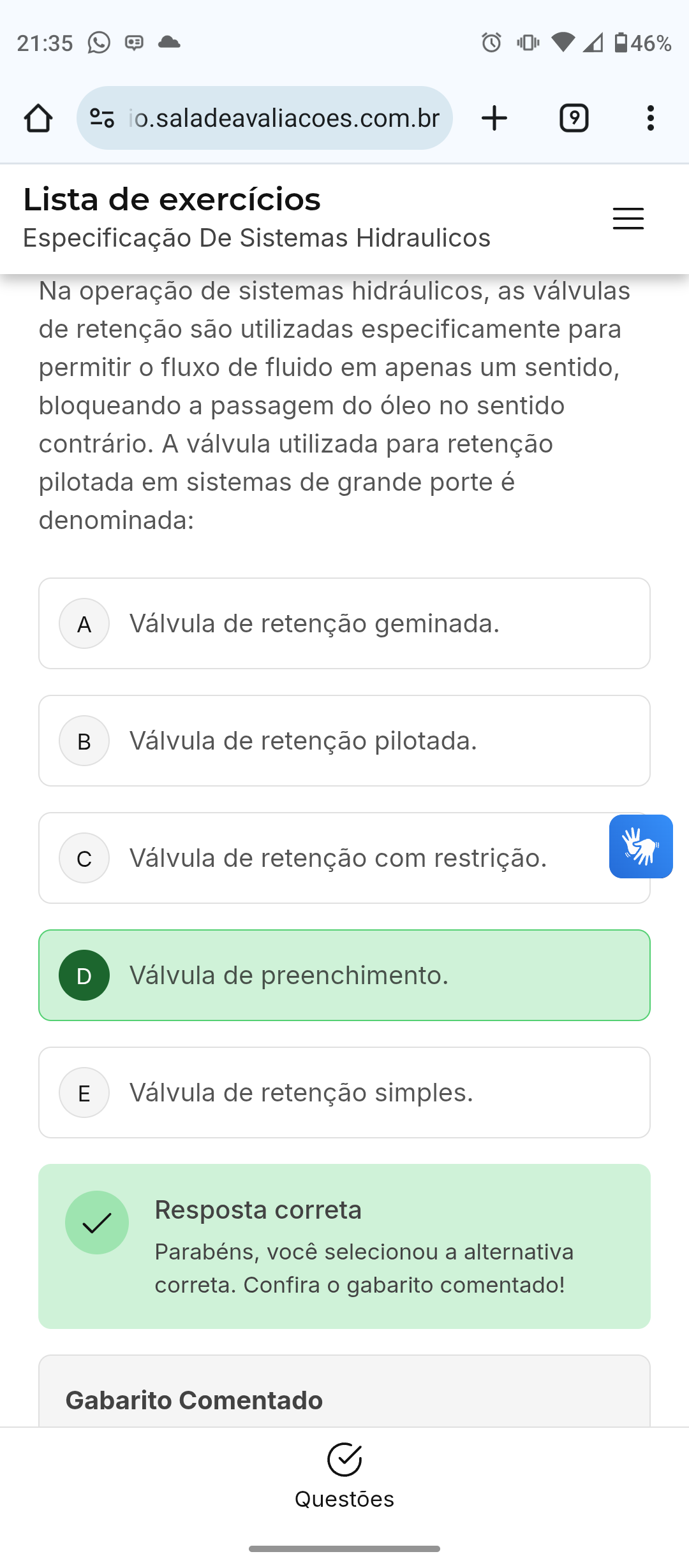 21:35 46% + 9 Lista de exercícios Especificação De Sistemas Hidraulicos Na operação de sistemas hidráulicos, as válvulas de retenção são utilizadas especificamente para permitir fluxo de fluido em apenas um sentido, bloqueando a passagem do óleo no sentido contrário. A válvula utilizada para retenção pilotada em sistemas de grande porte é denominada: A Válvula de retenção geminada. B Válvula de retenção pilotada. C Válvula de retenção com restrição. D Válvula de preenchimento. E Válvula de retenção simples. Resposta correta Parabéns, você selecionou a alternativa correta. Confira o gabarito comentado! Gabarito Comentado Questões