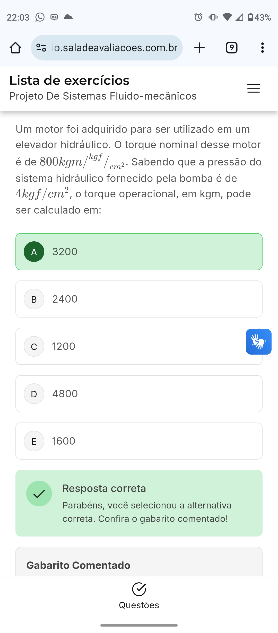 22:03 43% + 9 Lista de exercícios Projeto De Sistemas Um motor foi adquirido para ser utilizado em um elevador hidráulico. O torque nominal desse motor é de / Sabendo que a pressão do sistema hidráulico fornecido pela bomba é de 4kgf/cm2, o torque operacional, em kgm, pode ser calculado em: A 3200 B 2400 C 1200 D 4800 E 1600 Resposta correta Parabéns, você selecionou a alternativa correta. Confira o gabarito comentado! Gabarito Comentado Questões