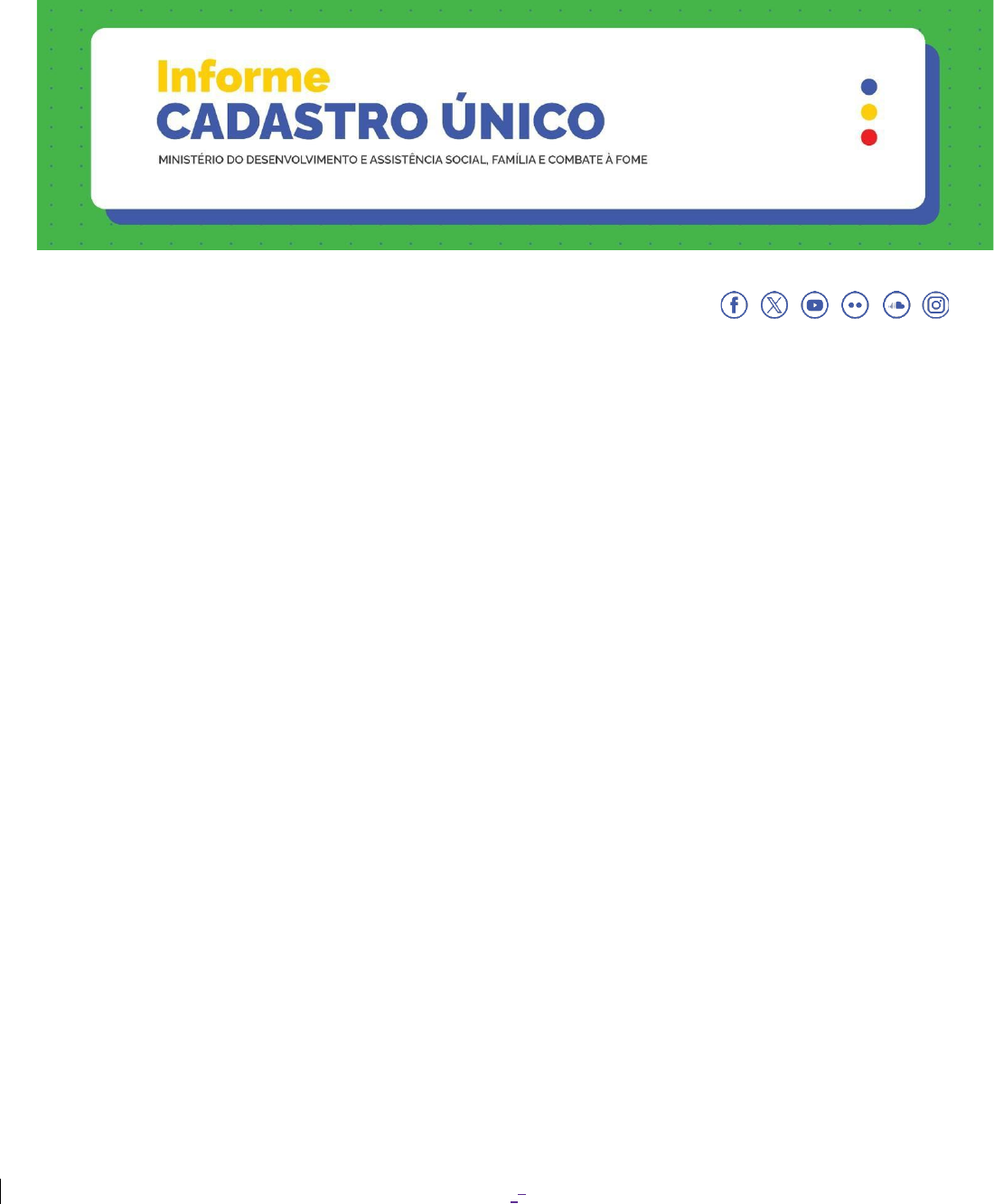 Informe nº 60 • 10 de janeiro de 2025 O Novo Cadastro Único vem aí Muito mais que um sistema, o novo Cadastro será lançado em março deste ano e vai aprimorar a qualificação dos dados das famílias, a capacitação e as possibilidades de uso pela gestão O novo Cadastro Único dará um passo essencial na gestão de políticas públicas no Brasil, oferecendo uma plataforma mais integrada, eficiente e alinhada às necessidades atuais de estados, municípios, Distrito Federal (DF), programas usuários e cidadãos. As informações do formulário seguem as mesmas, com as melhorias efetuadas ao longo de 2024. Mas, a partir de março, em vez de ser só um sistema em que os operadores incluem e atualizam as informações das famílias, o Cadastro terá toda uma plataforma integrada em seu Portal de Gestão, contando com: sistema de entrada e alimentação de dados, sistema de capacitação de operadores, sistema de gestão de riscos e monitoramento de fraudes, sistema de gestão de acessos e sistema de relatórios analíticos. Além disso, contará com o formulário do Cadastro Único disponibilizado de forma offline para dispositivos móveis para a coleta de dados que pode ser usado em tablets ou celulares. O novo Cadastro permitirá evoluções contantes e desenvolvimentos modulares. Assim, em fevereiro, será aberto o sistema de capacitação para os operadores. Em março, o sistema de entrada e alimentação de dados. A partir de março, os sistemas de gestão de riscos e de relatórios analíticos iniciarão seus desenvolvimentos. Com o sistema de gestão de riscos, ferramentas de inteligência de dados e de inteligência artificial poderão ser usadas para monitorar movimentos atípicos e evitar erros de cadastramento ou fraudes. Com os relatórios analíticos, os municípios poderão transformar as informações do Cadastro em conhecimentos úteis a seu planejamento e gestão. Seu desenvolvimento foi feito pela Empresa de Tecnologia e Informações da Previdência (Dataprev) que passa a ser o agente operador do Cadastro Único. A partir de 28 de fevereiro, a base de dados que hoje está na CAIXA será migrada para a Dataprev. Nesta fase de migração, a V7 terá de ser indisponibilizada, para evitar erros e descompassos com os dados do novo sistema. Na semana de 20 de março, o novo sistema on- line de inclusões e atualizações estará aberto aos municípios. Mas as ações de inclusão e atualização cadastral não precisarão ficar paradas nesta fase de migração e indisponibilidade da V7, pois, em 01 de março, já estará disponível o aplicativo off line. Os municípios poderão usá-lo neste período, ou os próprios formulários em papel, para manter suas ações. Os principais programas federais que usam o Cadastro Único, Bolsa Família e Benefício de Prestação Continuada (BPC), farão apenas ações pontuais de benefícios para cumprimento das regras, justamente para evitar qualquer sobrecarga aos municípios nesse período de migração. Plataforma de capacitação dos operadores Disponível na semana de 20 de fevereiro, a plataforma de capacitação terá trilhas formativas online para todos os profissionais dos municípios e DF. São trilhas formativas que vão do nível básico ao avançado e este novo modelo garantirá que 100% dos operadores estejam sempre com os conhecimentos em dia. Somente usuários capacitados poderão operar o novo Sistema e a entrada no sistema será feita via a plataforma GOV.BR. Vale a pena, desde já, que as gestões municipais garantam que seus operadores criem perfis de acesso no GOV.BR, caso não tenham. E que iniciem a etapa de capacitação assim que ela for lançada. Substituição da Versão 7 pelo novo Sistema de Cadastro Único O processo de migração do Sistema de Cadastro Único (Versão 7), operado pela CAIXA, para o novo Sistema, operado pela Dataprev, ocorrerá ao longo dos meses de fevereiro e março de 2025. Confira o cronograma: • Semana de 17 de fevereiro - disponibilização do novo ambiente de capacitação no Portal do Cadastro Único; • 28 de fevereiro - indisponibilização do Sistema (Versão 7) e do Portal do Cadastro Único para fins de adequação e atualização dos ambientes para o processo de migração; • 01 de março - disponibilização do APP dos formulários do Cadastro Único de forma off-line para dispositivos móveis, como celular ou tablets eletrônico; • 05 de março - disponibilização do Sistema de Cadastro Único (Versão 7) exclusivamente para a realização de consultas a dados legados, ou seja, dados de famílias e pessoas cadastradas na base até 28 de fevereiro de 2025; • Semana de 17 de março - implantação do novo Sistema de Cadastro Único, no Portal do Cadastro Único. Obrigatoriedade do CPF A partir da implantação do novo Sistema, o número de inscrição no Cadastro de Pessoa Física (CPF) passará a ser a chave de identificação de todas as pessoas para o Cadastro Único. Ou seja, o CPF passará a ser obrigatório para a inclusão e atualização cadastral. Assim, o Número de Identificação Social (NIS) deixará de ser o código de identificação das pessoas cadastradas, sendo substituído pelo número de CPF. Entretanto, a base do Cadastro Único permanecerá registrando o NIS das pessoas. Essa medida visa atender à Lei n° 14.534/2023, que altera a legislação nacional para adotar número único e estabelecer o CPF como número suficiente para identificação do cidadão nos bancos de dados de serviços públicos. Tal medida permite a identificação das informações das pessoas em diferentes registros administrativos, facilitando o processo de interoperabilidade de dados. Com isso, garante-se a melhoria da qualidade das informações do Cadastro Único, além de agilizar o processo de cadastramento pelos municípios e possibilitar o acesso das famílias cadastradas a benefícios e serviços sociais usuários do Cadastro Único que já exigem o CPF com