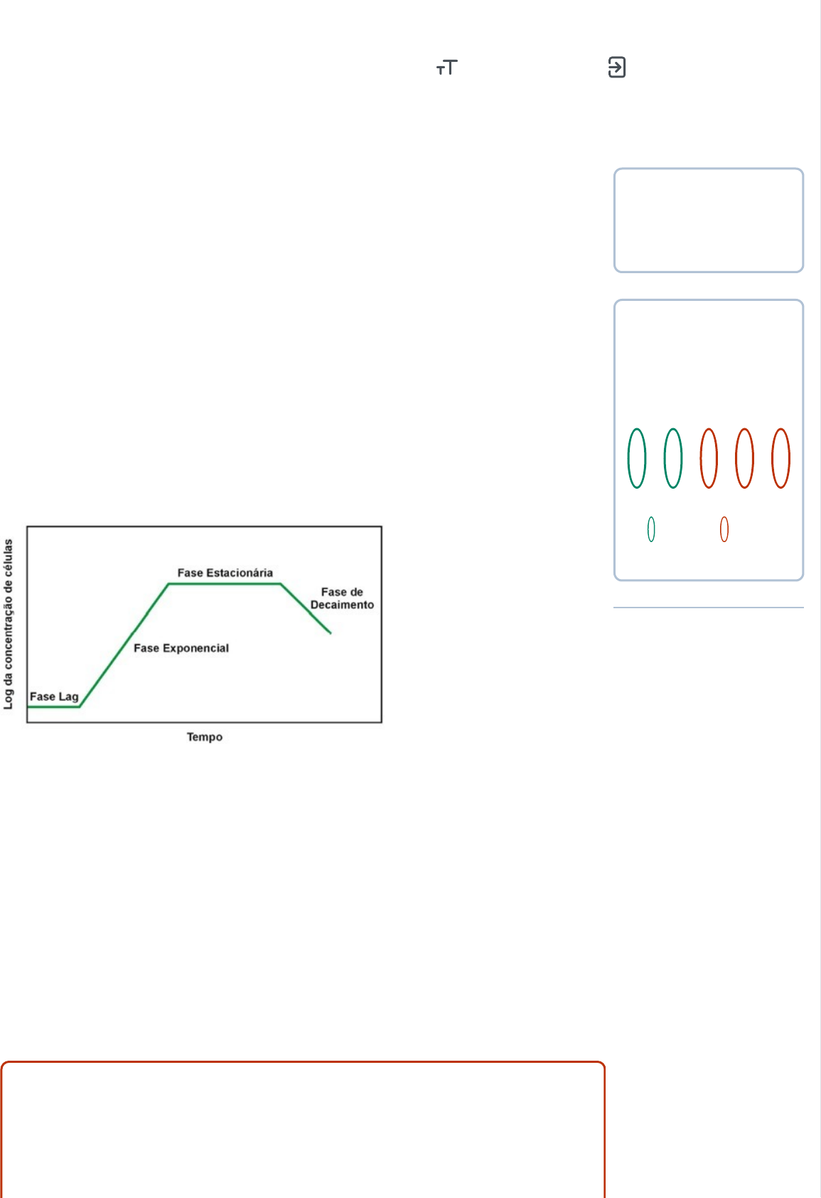 Questão 3 Incorreta O tempo necessário para que a célula se divida ou para que a população bacteriana se duplique é conhecido como tempo de geração. Cada bactéria tem seu tempo de geração, e este muda conforme o aporte de nutrientes e condições físicas do meio ambiente. Sob condições ótimas, pode-se determinar o tempo de geração de uma cultura bacteriana e analisar seu crescimento. A curva de crescimento bacteriano demonstra o aumento do número de células bacterianas e é dividida em quatro fases, conforme a figura a seguir: Fonte:https://www.google.com/searchq=curva+de+crescimento+bacteriano&rl z=1C5CHFA_enBR780BR780&tbm=isch&source=iu&ictx=1&fir=KE0gXqb YQtbtHM%253A%252C4U_wdLskiJcjiM%252C_&vet=1&usg=AI4_- kSW9jN6LoCXia0rK_WhaNKA7C3xrQ&sa=X&ved=2ahUKEwiSyLnl- fziAhV2QEEAHbZVCSMQ9QEwAXoECAYQBg&biw=1146&bih=701#im grc=KE0gXqbYQtbtHM:&vet=1. Acesso em 22 Jun 2019. Com base nas informações sobre as fases de crescimento bacteriano, avalie as alternativas a seguir e assinale a alternativa correta Sua resposta Incorreta Pontuação 1/2.5 Questões realizadas: 3 de 5 1 2 3 4 5 Acertou Errou Anterior Próximo Correção do exercício da unidade Tamanho da fonte Sair da correção A primeira fase é a de crescimento exponencial. Solução esperada Na fase logarítmica, o número de bactérias viáveis é maior que as inviáveis. Comentário A resposta correta é: Na fase logarítmica, o número de bactérias viáveis é maior que as inviáveis. - Fase de lag: não ocorre divisão celular nem aumento de massa. Geralmente porque as condições ambientais não são favoráveis. - Fase log ou logarítmica (exponencial): ocorre divisão regular numa velocidade máxima e constante. - Fase estacionária: redução gradual da velocidade de multiplicação, equilíbrio entre as bactérias que nascem e as que morrem. - Fase de declínio ou decaimento: redução do número de bactérias até a extinção completa no meio de cultura. Os microrganismos não crescem nessa fase.