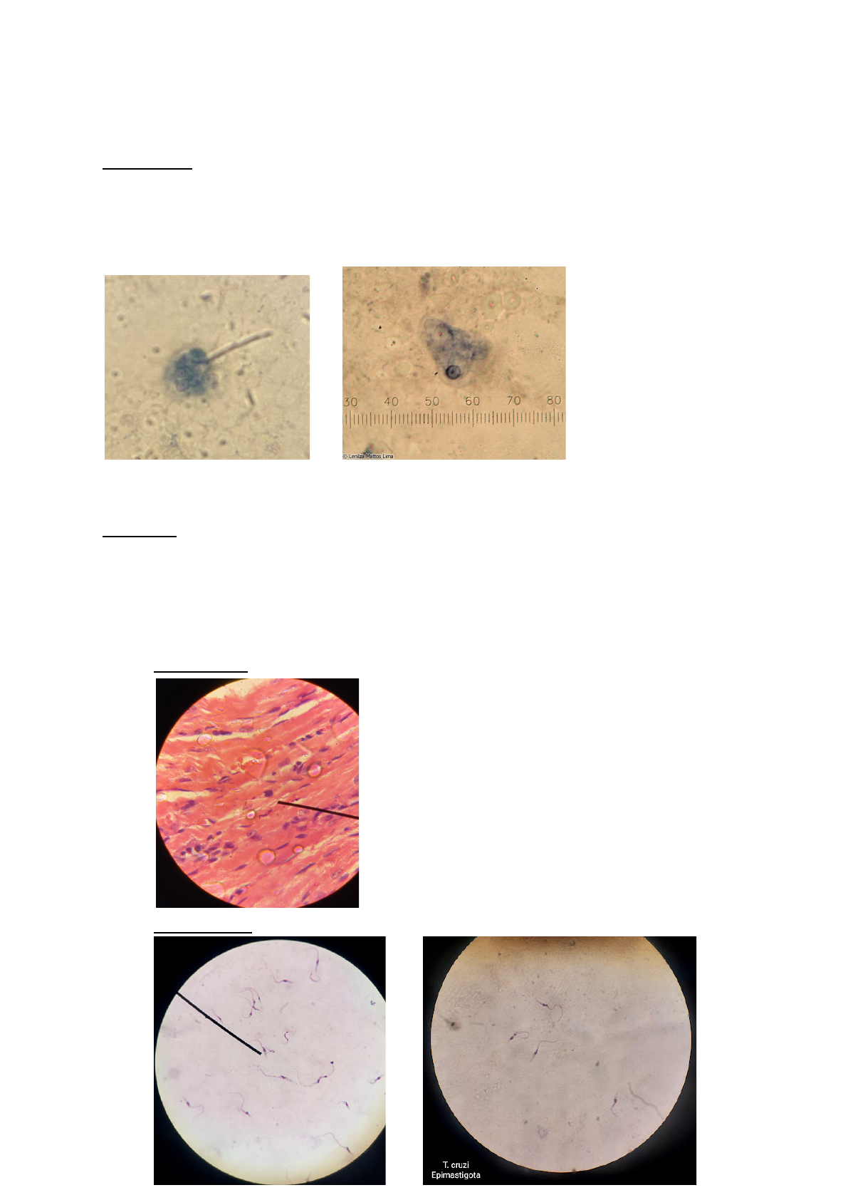 RESUMO PRÁTICA PARASITO PRIMEIRA PROVA AMEBÍASE Entamoeba histolytica Morfologias: cisto e trofozoíto Transmissão: Ingestão de cistos maduros em água ou alimentos contaminados 1. Cisto 2. Trofozoíto Foto 1: Lâmina Parasitologia UFSJ-CCO Foto 2: https://parasitologiaclinica.ufsc.br/index.php/info/conteudo/fotografias/trofozoitos-ehysto/ CHAGAS Trypanosoma cruzi Morfologia: Amastigota, epimastigota, tripomastigota Transmissão: Penetração de tripomastigotas metacíclicos (eliminados nas fezes ou urina dos artrópodes durante o hematofagismo) em solução de continuidade da pele ou mucosa íntegra. Vetores: Triatoma infestans, Rhodnius prolixus e Panstrongylus megistus 1. Amastigotas 2. Epimastigota 4. Vetores https://www.researchgate.net/figure/Figura-23-Diferenciacao-dos-generos-Panstrongylus-Rhodnius-e-Triatoma-A_fig2_265847256 Panstrongylus megistus Rhodnius prolixus Foto: https://www2.fcfar.unesp.br/#!/triatominae Foto: https://www2.fcfar.unesp.br/#!/triatominae /subfamilia-triatominae/panstrongylus/panstrongylus-megistus/ /subfamilia-triatominae/rhodnius/rhodnius-prolixus/ https://www.researchgate.net/figure/Figura-23-Diferenciacao-dos-generos-Panstrongylus-Rhodnius-e-Triatoma-A_fig2_265847256 https://www2.fcfar.unesp.br/#!/triatominae Triatoma infestans Foto 1: https://www2.fcfar.unesp.br/#!/triatominae /subfamilia-triatominae/triatoma/triatoma-infestans/ GIARDIA Giardia duodenalis Morfologia: cisto e trofozoíto Transmissão: Ingestão de cistos maduros em água ou alimentos contaminados 1. Trofozoíto (parece um fantasma) Foto 1: https://parasitologiaclinica.ufsc.br/index.php/info/conteudo/ Foto 2: Lâmina Parasitologia UFSJ-CCO 2. Cisto Foto 1: https://parasitologiaclinica.ufsc.br/index.php/info/conteudo/fotografias/cistos-glamblia/ https://www2.fcfar.unesp.br/#!/triatominae LEISHMANIOSE Leishmania sp. Morfologia: Amastigota e promastigota Transmissão: Mamífero picado por mosquito hematófogo infectado (Lutzomya sp.) 1. Amastigota 2. Promastigota Lutzomyia sp.: fêmea (à esquerda): macho (à direita) Foto 1, 2, 3 e 4: Lâmina Parasitologia UFSJ-CCO Obs.: Ambos os parasitas do gênero Trypanosoma quanto Leishmania são da classe Kinetoplastea, que indica a presença de um tipo de mitocôndria modificada chamada cinetoplasto. Como diferenciar tripomastigotas de Trypanosoma cruzi e promastigotas de Leishmania? Trypanosoma: Cinetoplasto localizado oposto ao flagelo, formato de C ou S. Leishmania: Cinetoplasto localizado próximo ao flagelo, formato mais “reto”. MALÁRIA Plasmodium sp. (falciparum, vivax, malaria e ovale) Morfologia: Esporozoíto e merozoíto Transmissão: Picada mosquito fêmea infectado com esporozoítos (Anopheles) TOXOPLASMOSE Toxoplasma gondii Morfologia: Oocisto, taquizoíto e bradizoíto Transmissão: Ingestão de oocistos em água, verduras mal lavadas ou solo, disseminadas mecanicamente por moscas, baratas, etc. Esses oocistos são eliminados nas fezes de felídeos contaminados.Também pode ocorrer a ingestão de cistos em carne crua ou mal cozida. Também pode ser transmitido verticalmente. https://www.researchgate.net/figure/Figura-32-Imagens-das-formas-evolutivas-do-Toxoplasma-gondii-1-Oocisto-1000x-2_fig8_ 259532883 https://www.researchgate.net/figure/Figura-32-Imagens-das-formas-evolutivas-do-Toxoplasma-gondii-1-Oocisto-1000x-2_fig8_259532883 https://www.researchgate.net/figure/Figura-32-Imagens-das-formas-evolutivas-do-Toxoplasma-gondii-1-Oocisto-1000x-2_fig8_259532883 Foto 1 e 2: Lâmina Parasitologia UFSJ-CCO TRICOMONÍASE Trichomonas vaginalis Não forma cistos Transmissão: Contato sexual Foto 1: Lâmina Parasitologia UFSJ-CCO Obs.: Lâminas que podem cair tecido 1. Trypanosoma cruzi 2. Toxoplasma gondii 3. Leishmaniose (forma amastigota) 4. Plasmodium (dentro de macrófagos)