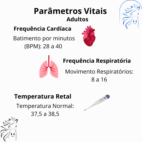 Parâmetros Vitais Adultos Frequência Cardíaca Batimento por minutos (BPM): 28 a 40 Frequência Respiratória Movimento Respiratórios: 8 a 16 Temperatura Retal Temperatura Normal: 37,5 a 38,5