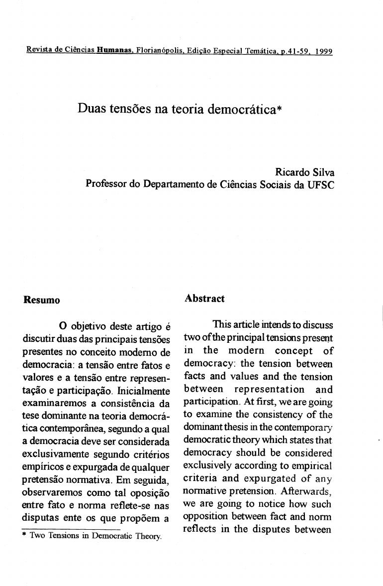 Revista de Ciências Humanas, Florianópolis, Edição Especial Temática, p.41-59, 1999 Duas tensões na teoria democrática* Ricardo Silva Professor do Departamento de Ciências Sociais da UFSC Resumo O objetivo deste artigo é discutir duas das principais tensões presentes no conceito moderno de democracia: a tensão entre fatos e valores e a tensão entre represen- tação e participação. Inicialmente examinaremos a consistência da tese dominante na teoria democrá- tica contemporânea, segundo a qual a democracia deve ser considerada exclusivamente segundo critérios empíricos e expurgada de qualquer pretensão normativa. Em seguida, observaremos como tal oposição entre fato e norma reflete-se nas disputas ente os que propõem a * Two Tensions in Democratic Theory. Abstract This article intends to discuss two ofthe principal tensions present in the modern concept of democracy: the tension between facts and values and the tension between representation and participation, At first, we are going to examine the consistency of the dominant thesis in the contemporary democratic theory which states that democracy should be considered exclusively according to empirical criteria and expurgated of any normative pretension. Afterwards, we are going to notice how such opposition between fact and norm reflects in the disputes between 42 representação politico como funda- mento institucional da democracia e os que acreditam que tal funda- mento reside na participação ampliada dos cidadãos no processo politico. Objetiva-se esclarecer o modo como tensões complexas, que sio constitutivas do próprio conceito moderno de democracia, sio apre- sentadas em termos de oposições simples entre as quais suposta- mente dever-se-ia optar. Duas tensões na teoria democrática those who propose a political representation as the institutional foundation of democracy and the others who believe that such foundation resides in the broader participation of the citizens in the political process. The goal is to examine how complex tensions that are inherent in the modern concept of democracy are presented in terms of simple oppositions between one is supposed to choose. Palavras-chave: democracia; Keywords: Democracy; represen- representação; participação; des- tation; participation; description; crição; prescrição. prescription. *************** Introdução Os debates internos à teoria democrática contemporânea põem em evidencia um conjunto de dificuldades que também encontram expressão na prática politico dos mais diferentes atores. Embora estejamos a experimentar uma situação em que todos insistem em afirmar sua profissão de fé democrática, encontramo-nos ainda muito distantes de um consenso em torno do significado da democracia. Parecemos estar, de fato, como sugeriu SARTORI (1994), em plena "era da democracia confusa". Seria tão fácil quanto inútil atribuir tal confusão à ação de demagogos e de outros inimigos da democracia, cujo recurso sistemático a este termo seria apenas de caráter instrumental, com vistas pavimentação de seu caminho para o poder. E bastante evidente que isso acontece, e sabemos em que magnitude. Mas o fato é que tal instrumentalização retórica do termo democracia não seria possível se não houvesse um profundo desacordo em torno de seu significado. Parece claro que esta relativa indeterminação do conceito de democracia repousa sobretudo na multiplicidade de fontes nas quais fundamenta-se a democracia moderna. Segundo DAHL (1989:2): "an Revista de Ciencias Humanas, Florianópolis, Edição Especial Temática, p.41-59, 1999 43 important cause of the confusion over what democracy means in our present world is that it has developed over several thousand years and stems from a variety of sources". De fato, as instituições e os ideais democráticos remontam h. antigüidade clássica e atravessam toda a história ocidental, até os dias atuais, experimentando um continuo processo de transformações. Assim, a teoria democrática contemporânea é tributária de fontes múltiplas, próximas ou remotas, o que dota o conceito de democracia de uma inevitável polissemia e de um certo número de tensões internas que são constitutivas do próprio conceito e não meras impurezas analíticas quaisquer que devam ser extirpadas. Todavia, como veremos neste artigo, nos debates teóricos sobre o significado da democracia esta visão que considera a complexidade das tensões entre os elementos constitutivos do conceito de democracia tem sido freqüentemente abandonada em favor de uma visão mais simplificada, porém enganosa, que ressalta a oposição e a polarização entre tais elementos. Fatos e valores Um problema recorrente nos debates sobre a teoria democrática contemporânea consiste na pretensa oposição entre uma função descritiva e uma função normativa da teoria democrática. O marco contemporâneo desta oposição pode ser encontrado na obra "Capitalismo, Socialismo e Democracia" de Joseph Schumpeter. A influência desta obra — publicada na década de quarenta.— sobre a teoria democrática atual é a maior que pode ser atribuida a um único autor. SCHUMPETER procurou estabelecer as bases de uma teoria democrática "realista e descritiva". Seu ponto de partida consiste numa critica demolidora do que denomina de "doutrina clássica da democracia". A doutrina clássica é definida como "o arranjo institucional para se chegar a decisões políticas que realiza o bem comum fazendo o próprio povo decidir as questões através das eleições de indivíduos que devem reunir- se para realizar a vontade desse povo" (SCHUMPETER, 1984:313). A maior debilidade da teoria clássica, segundo SCHUMPETER, consiste em sua absoluta dependência de mitos que não apresentam qualquer substância na realidade contemporânea: o "bem comum" e a "vontade do povo". O embasamento da teoria sobre esses conceitos conferiu-lhe um viés acentuadamente normativo, vi
