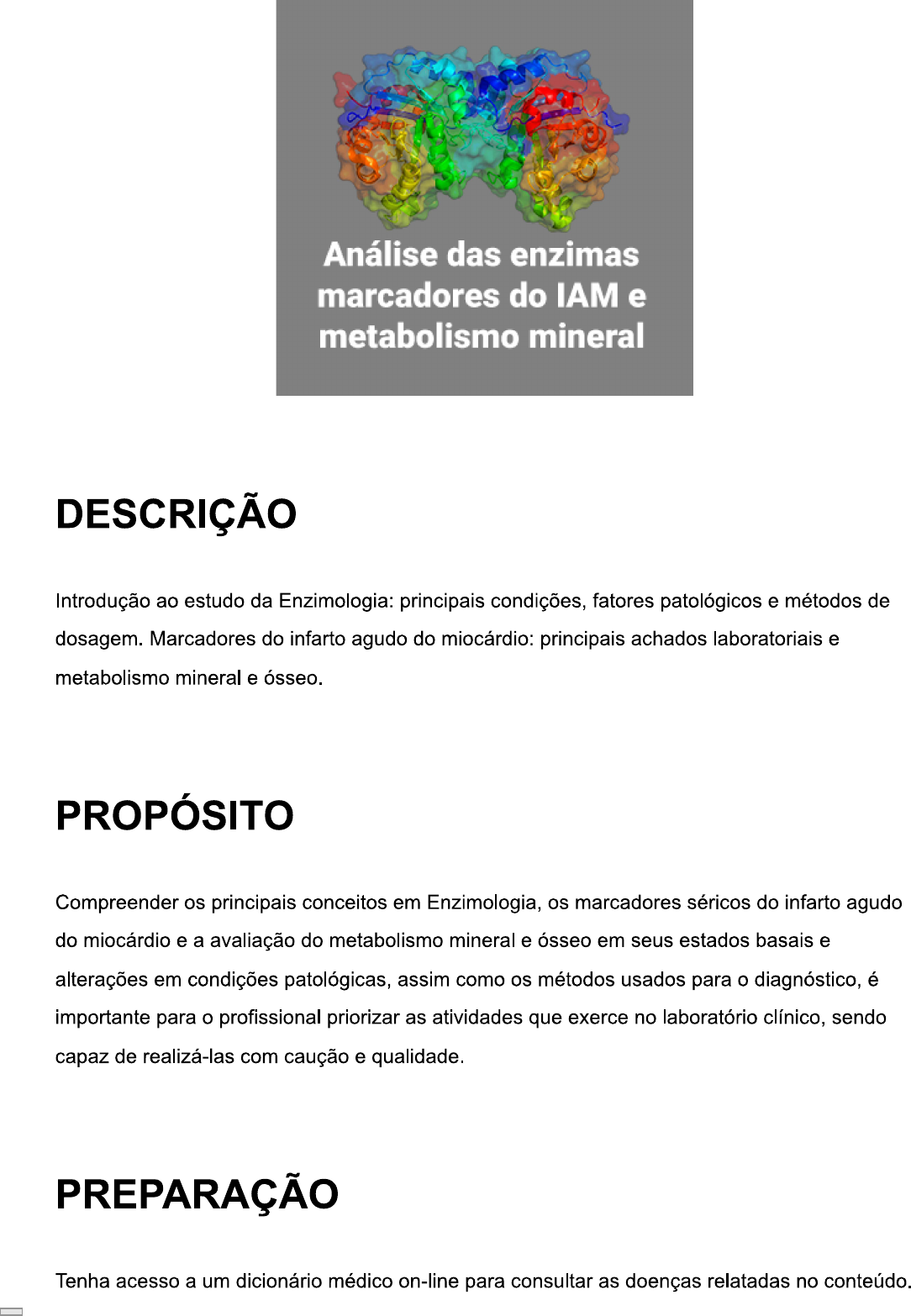 Análise das enzimas marcadores do IAM e metabolismo mineral DESCRIÇÃO Introdução ao estudo da Enzimologia: principais condições, fatores patológicos e métodos de dosagem. Marcadores do infarto agudo do miocárdio: principais achados laboratoriais e metabolismo mineral e ósseo. PROPÓSITO Compreender os principais conceitos em Enzimologia, os marcadores séricos do infarto agudo do miocárdio e a avaliação do metabolismo mineral e ósseo em seus estados basais e alterações em condições patológicas, assim como os métodos usados para o diagnóstico, é importante para o profissional priorizar as atividades que exerce no laboratório clínico, sendo capaz de realizá-las com caução e qualidade. PREPARAÇÃO Tenha acesso a um dicionário médico on-line para consultar as doenças relatadas no conteúdo.OBJETIVOS MÓDULO 1 Descrever as principais enzimas, as condições patológicas que alteram sua concentração e os métodos de diagnóstico laboratorial MÓDULO 2 Identificar os marcadores cardíacos laboratoriais do infarto agudo do miocárdio MÓDULO 3 Reconhecer os marcadores séricos que permitem a identificação das doenças relacionadas ao metabolismo mineral e ósseo INTRODUÇÃO Neste conteúdo, você vai identificar os principais conceitos em Enzimologia, aprender a interpretar os resultados séricos de enzimas relacionadas ao infarto agudo do miocárdio (IAM) e monitorar os marcadores do metabolismo mineral e ósseo em condições basais e patológicas, e aplicando corretamente o método de detecção dos metabólitos associados a cada condição proposta. Você vai também relacionar as alterações detectadas pelos testes bioquímicos no soro com as condições patológicas, estudando o comportamento fisiológico e as correlações com a doença clínica. Vamos juntos?MÓDULO 1 Descrever as principais enzimas, as condições patológicas que alteram sua concentração e os métodos de diagnóstico laboratorial ENZIMOLOGIA E NÍVEIS DE ENZIMAS NO PLASMA Enzimologia é a ciência que estuda as enzimas e sua natureza química, as funções biológicas e as alterações, bem como o seu significado como biomarcador. Enzimas são proteínas que atuam acelerando reações químicas, agindo como catalisadores; portanto, sob determinadas condições. Esses compostos proteicos globulares têm alto poder catalítico, grau elevado de especificidade ao seu substrato, não sendo consumidos após as reações químicas nas quais estão envolvidos. É parte da sua atividade não influenciar ou alterar o equilíbrio químico das reações, sendo reguladas por via genética ou pelas condições metabólicas. A atuação como enzima não é função exclusiva de proteínas, pois já foram descritas moléculas de RNA, denominadas ribozimas, que também executam a mesma função. A especificidade de cada enzima é determinada por características de uma cavidade ou sítio de ligação ao substrato, alocado na sua superfície. Essa denomina-se sítio ativo, uma ordenação de grupos presentes em cadeias laterais de alguns aminoácidos que se acoplam ao substrato a partir de ligações não covalentes. A ligação enzima-substrato ocorre pela complementaridade, em um modelo chave e fechadura ou sítio-específica.Substrato Produto Quebra de ligação sob estresse 1 2 Ligação Sítio ativo Complexo enzima-substrato Enzima Enzima Substrato Produto 1 Sítio ativo Complexo enzima-substrato Enzima Enzima Imagem: Shutterstock.com adaptada por Angelo Souza. Enzima e sua estrutura. É bastante comum que as enzimas demandem a ação conjunta de moléculas orgânicas ou inorgânicas de tamanho diminuto, essenciais à sua atividade, são elas: COENZIMAS orgânicas, frequentemente, derivadas de vitaminas, a exemplo do FAD e do NAD. COFATORES metálicos de transição, já que os metais são essenciais à catálise, como Zn2+ e Um sistema de nomenclatura e categorização enzimática foi acatado pela União Internacional de Bioquímica e Biologia Molecular (IUBMB) e nos permite identificá-las em seis classes, combinadas com a natureza da reação química que catalisam:OXIDORREDUTASES Atuam nas reações de removendo átomos de hidrogênio ou adicionando átomos de oxigênio. TRANSFERASES Agem fazendo as transferências de grupos funcionais, a exemplo dos grupos metil (-CH3). HIDROLASES Catalisam reações de hidrólises como a quebra de lipídeos e de proteínas. LIASES Quebra de ligações químicas duplas, removendo CO2 de alguns substratos (descarboxilação). ISOMERASES Catalisam reações de isomerizações, convertendo moléculas às suas formas cis ou trans. LIGASES Atuam na formação de ligações químicas, como as sintetases. Certos fatores podem perturbar a atividade enzimática, dentre os principais, temos: temperatura, pH, concentração do substrato, tempo e produto da reação. Além dos já citados,vale ressaltar a importância da integração das enzimas nas vias metabólicas e a interrelação dos produtos de uma via com outras. As vias metabólicas não operam em capacidade máxima o tempo todo. Diversos processos celulares podem ser interrompidos, inibidos ou ativados, durante certas fases do ciclo vital, por influência enzimática; entre eles estão aqueles que permitem um crescimento celular controlado e econômico. Em se tratando das concentrações e atividades de certas enzimas, podemos observar que o mecanismo de controle é mediado por: Controle genético - Controla indução ou repressão enzimáticas. Modificação enzimática covalente - São reações químicas reversíveis, catalisadas por outras enzimas, o que resulta na ativação ou inibição. Regulação alostérica - Quando as enzimas são reguladas por moduladores ligados a outro(s) sítio(s), sofrendo modificações conformacionais não covalentes. Compartimentalização - A síntese de algumas enzimas como moléculas precursoras, denominadas de início inativas, e que são ativadas em seguida pela cl