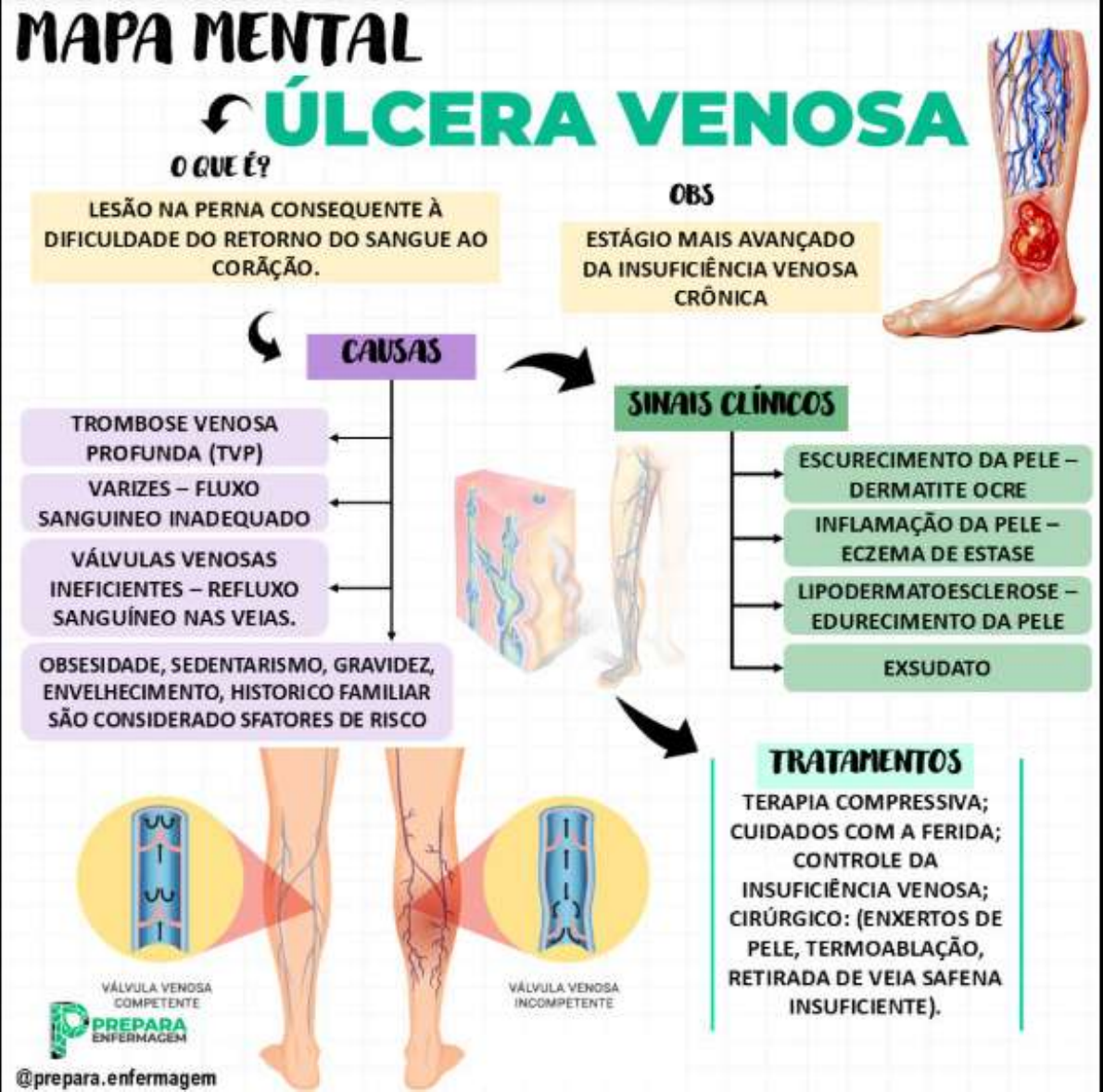 MAPA MENTAL ÚLCERA VENOSA OBS LESÃO NA PERNA CONSEQUENTE À DIFICULDADE DO RETORNO DO SANGUE AO ESTÁGIO MAIS AVANÇADO DA INSUFICIÊNCIA VENOSA CRÔNICA CAUSAS SINAIS CLÍNICOS TROMBOSE VENOSA PROFUNDA (TVP) ESCURECIMENTO DA PELE - VARIZES - FLUXO DERMATITE OCRE SANGUINEO INADEQUADO INFLAMAÇÃO DA PELE VÁLVULAS VENOSAS ECZEMA DE ESTASE INEFICIENTES - REFLUXO LIPODERMATOESCLEROSE - SANGUÍNEO NAS VEIAS. EDURECIMENTO DA PELE OBSESIDADE, SEDENTARISMO, GRAVIDEZ, EXSUDATO ENVELHECIMENTO, HISTORICO FAMILIAR SÃO CONSIDERADO SFATORES DE RISCO TRATAMENTOS TERAPIA COMPRESSIVA; CUIDADOS COM A FERIDA; CONTROLE DA INSUFICIÊNCIA VENOSA; (ENXERTOS DE PELE, TERMOABLAÇÃO, VÁLVULA VENOSA RETIRADA DE VEIA SAFENA VÁLVULA VENOSA COMPETENTE INCOMPETENTE INSUFICIENTE). PREPARA @prepara.enfermagem