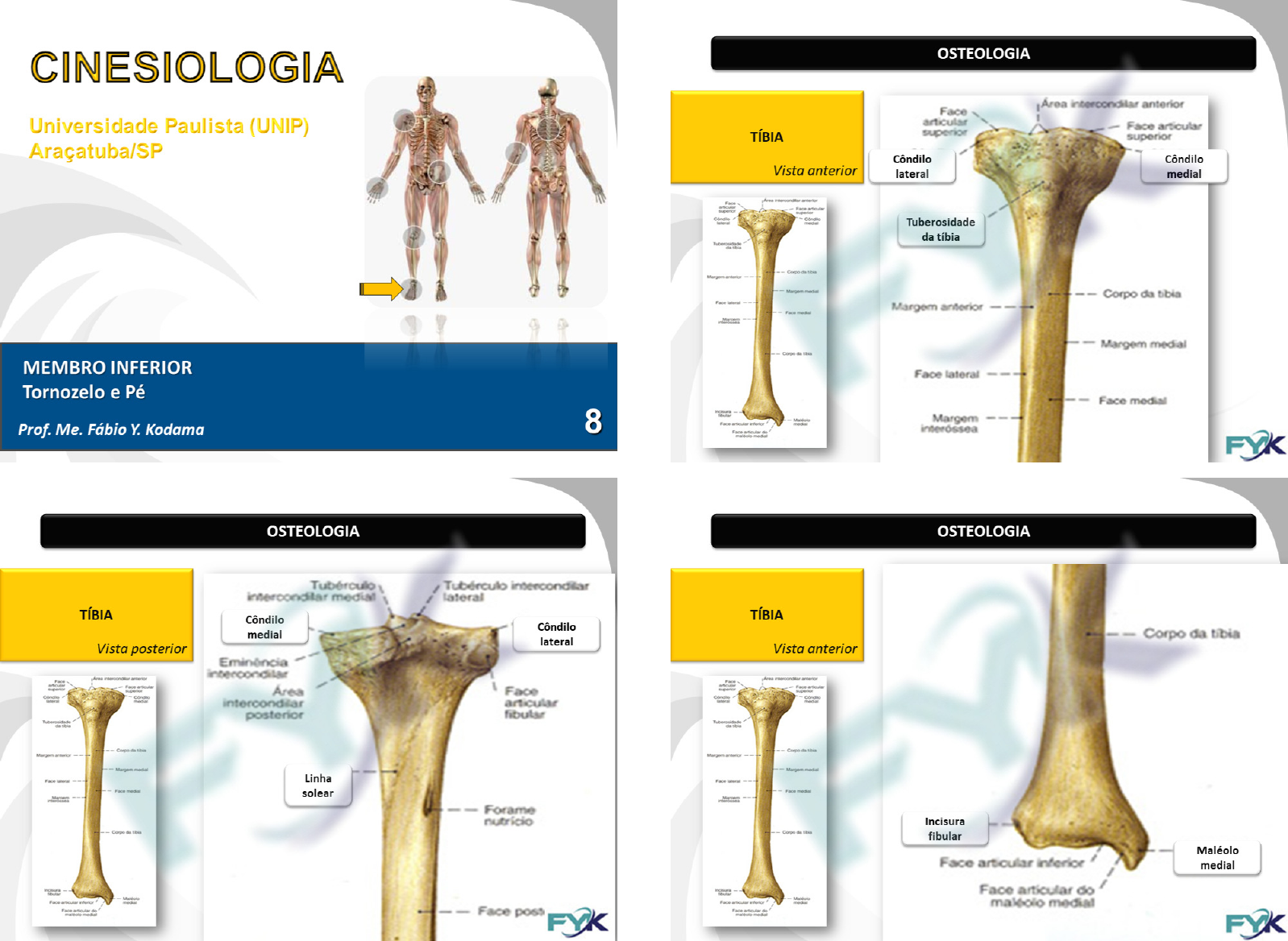 OSTEOLOGIA CINESIOLOGIA Área anterior Face Universidade Paulista (UNIP) articular Face articular TÍBIA superior superior Araçatuba/SP Côndilo Côndilo Vista anterior lateral medial Tuberosidade da tíbia Corpo da tibia anterior Margem medial MEMBRO INFERIOR Face lateral Tornozelo e Pé Face medial Prof. Me. Fábio Y. Kodama 8 Margem FYK OSTEOLOGIA OSTEOLOGIA Tuberculo intercondilar medial lateral TÍBIA TÍBIA Côndilo Côndilo medial Corpo da tibia lateral Vista posterior Vista anterior Eminência intercondilar Área Face articular posterior fibular Linha solear Forame Incisura fibular Face articular inferior medial Face articular do medial Face poste FYK FYKOSTEOLOGIA OSTEOLOGIA Ápice da Face cabeça da Cabeça da fíbula lateral fibula Corpo da fibula FÍBULA FÍBULA Vista lateral Colo da fibula Margem posterior Margem anterior Face lateral Sulco lateral maleolar Corpo da fibula FYK FYK OSTEOLOGIA OSTEOLOGIA ossos DO TARSO METATARSOS E FALANGES São em número de 7 divididos em METATARSO É constituído por 5 ossos metatarsianos que são numerados no sentido medial para duas fileiras: proximal e distal. lateral em I, II, III, IV e V Fileira Proximal: Calcâneo e Tálus Fileira Distal: Navicular, Cubóide, FALANGES Cuneiforme Medial, Cuneiforme Apresentam 14 falanges: Intermédio e Cuneiforme Lateral Do ao dedos: falange (Proximal) falange (Média) falange (Distal) CUNEIFORMES Hálux: falange (Proximal) falange (Distal) NAVICULAR CUBÓIDE TARSO TÁLUS CALCÂNEO FYK FYKOSTEOLOGIA OSTEOLOGIA Falanges distais Observações ossos DO PÉ As extremidades distais da tíbia e fíbula se alargam, dando origem a Falanges proximais Visão superior Falanges médias saliências ósseas conhecidas como maléolos, que servem como uma polia, oferecendo uma vantagem mecânica para os músculos na execução de suas ações de inversão e Metatarso Metatarsos A superfície posterior do calcâneo é muito saliente e serve de ponto Cuneiforme medial de fixação para o tendão de Aquiles do complexo gastrocnêmio-sóleo. Cuneiforme intermédio Cuneiforme lateral Navicular Cubóide Calcâneo FYK FYK OSTEOLOGIA MOVIMENTOS DORSIFLEXÃO FLEXÃO PLANTAR DIVISÃO CLÍNICA DO ESQUELETO DO PÉ Clinicamente o pé é dividido em três porções: retropé, mediopé e Movimento do pé em direção à face anterior da Movimento de afastamento do pé em relação à antepé. tibia. face anterior da tibia. Retropé: formado pelos ossos tálus e calcâneo. Mediopé: formado pelos ossos navicular, cubóide e cuneiformes medial, intermédio e lateral. Antepé: constituído pelos metatarsos e falanges. FYK FYKMOVIMENTOS MOVIMENTOS INVERSÃO EVERSÃO FLEXÃO DOS DEDOS EXTENSÃO DOS DEDOS Virar o tornozelo e pé em adução, em direção à Virar o tornozelo e pé em abdução, afastando-os Movimento dos dedos em direção à superficie Movimento de afastamento dos dedos em relação linha média. da linha média. plantar do à superficie plantar do FYK FYK ARTROLOGIA - TORNOZELO ARTROLOGIA - TORNOZELO Tibiofibular proximal Ligamento cruzado posterior cruzado anterior Ligamento colateral fibular Ligamento tibiot alar posterior (parte do ligamento Ligamento colateral medial Tibia Tendão do biceps da coxa Trato iliotibial Ligamento tibioc (parte do ligamento Ligamento anterior da cabeça da medial Cabeça da Ligamento tibionavicular (parte do ligamento Ligamento patelar Ligamento anterior (parte do ligamento Processo posterior do Margem anterior da Ligamento talonavicular Ligamento Osso navicular Tuberosidade da Ligamentos dorsais posterior Margem anterior da tíbia Osso cuneiforme médio Ligamento dorsal Tendão Ligamentos Margem (de Margem interóssea dorsais metatarsal Membrana interóssea Face lateral da Tibiofibular distal Tuberosidade do do tibial anterior osso metatarsal do talus do calcâneo ateral da tíbia Tendão do tibial posterior Ligamento plantar longo Ligamento calcaneanonavicular (espiral) Ligamento tibiofibular anterior Maleolo medial Maleolo lateral Tornozelo (Talocrural) Tibiofibular distal Ligamento Ligamento calcâneo fibular Ligamento talofibular anteriorARTROLOGIA - PÉ ARTROLOGIA - Falanges distais Falanges distais Falanges proximais Falanges proximais Falanges médias Falang Metatarso Metatarso Metatars Metatarsos Cuneiforme medial Cuneiforme medial intermédio Cuneiforme intermédio Cuneiforme lateral Cuneiforme lateral Navicular Navicular Cubóide Cubóide FYK FYK Calcâneo Calcâneo Tarsometatarsais Metatarsofalangianas ARTROLOGIA - PÉ ARTROLOGIA - TORNOZELO Falanges distais ARTICULAÇÃO DO TORNOZELO (TALOCRURAL) Interfalangiana distal A) Estrutura Falanges proximais Falanges médias Formada pelo tálus, tíbia distal e fíbula distal. B) Considerações estruturais Metatarso Interfalangiana proximal Cápsula articular Ligamento tibiotalar posterior (parte do ligamento Metatarsos Muitos ligamentos Tibia Ligamento (parte do ligamento Ligamento talocalcaneano Cuneiforme medial Ligamento tibionavicula (parte do ligamento Ligamento anterior (parte do ligamento Processo posterior do Cuneiforme intermédio Cuneiforme lateral Ligamento talonavicular dorsal Ligamento Osso navicular posterior Navicular Ligamentos cuneonaviculares dorsais Cubóide Osso cuneiforme médio Ligamento dorsal Ligamentos dorsais metatarsal Calcâneo Tuberosidade do Tendão do tibial anterior Interfalangianas osso metatarsal do Ligamento plantar Ligamento plantar (espiral)ARTROLOGIA TORNOZELO ARTROLOGIA TORNOZELO C) Ligamentos C) Ligamentos Ligamento Deltóide - É um feixe triangular, robusto e achatado. Sua principal função é Ligamento Talofibular Anterior Lig. Talofibular posterior estabilizar a região medial do tornozelo e impedir o movimento de eversão. Formado pelos Ligamento Talofibular Posterior ligamentos: Ligamento Calcaneofibular Lig. Calcâneofibular Lig. Tibiotalar Posterior Lig. Tibionavicular Lig. Talofibular anterior Tibia Ligamento Lig. Tibiocalcâneo Lig. Tibiocalcâneo tibiofibular anterior Ligamento t