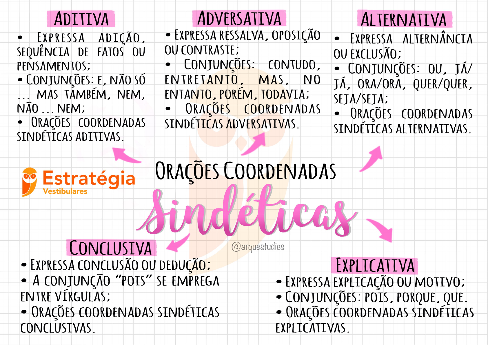 ADITIVA ADVERSATIVA ALTERNATIVA EXPRESSA EXPRESSA RESSALVA, OPOSIÇÃO EXPRESSA ALTERNÂNCIA SEQUÊNCIA DE FATOS OU OU CONTRASTE; OU EXCLUSÃO; CONJUNÇÕES: CONTUDO, CONJUNÇÕES: OU, JÁ/ CONJUNÇÕES: E, NÃO ENTRETANTO, MAS, NO JÁ, ORA/ORA, QUER/QUER, MAS NEM, ENTANTO, PORÉM, TODAVIA; SEJA/SEJA; ORAÇÕES COORDENADAS ORAÇÕES COORDENADAS ORAÇÕES COORDENADAS SINDÉTICAS ADVERSATIVAS. SINDÉTICAS ALTERNATIVAS. SINDÉTICAS ADITIVAS. Estratégia ORAÇÕES COORDENADAS Vestibulares CONCLUSIVA @arquestudies EXPRESSA CONCLUSÃO OU EXPLICATIVA A CONJUNÇÃO "POIS" SE EMPREGA EXPRESSA EXPLICAÇÃO OU MOTIVO; ENTRE CONJUNÇÕES: POIS, PORQUE, QUE. ORAÇÕES COORDENADAS SINDÉTICAS ORAÇÕES COORDENADAS CONCLUSIVAS. EXPLICATIVAS.
