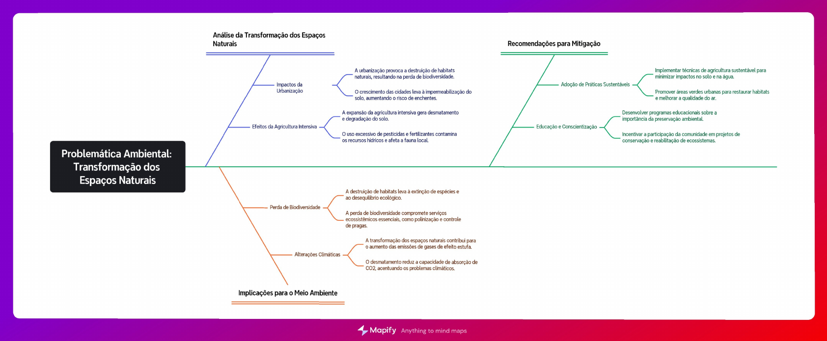 Análise da Transformação dos Espaços Naturais Recomendações para Mitigação A urbanização provoca a destruição de habitats Implementar técnicas de agricultura sustentável para naturais, resultando na perda de biodiversidade. minimizar impactos no solo e na água. Impactos da Adoção de Práticas Sustentáveis Urbanização o crescimento das cidades leva à impermeabilização do Promover áreas verdes urbanas para restaurar habitats solo, aumentando o risco de e melhorar qualidade do ar. A expansão da agricultura intensiva gera desmatamento Desenvolver programas educacionais sobre a e degradação do solo. importância da preservação Efeitos da Agricultura Intensiva Educação Conscientização o USO excessivo de pesticidas e fertilizantes contamina Incentivar a participação da comunidade em projetos de os recursos e afeta a fauna local. conservação e reabilitação de ecossistemas. Problemática Ambiental: Transformação dos Espaços Naturais A destruição de habitats leva à extinção de espécies e ao desequilibrio ecológico. Perda de Biodiversidade A perda de biodiversidade compromete serviços ecossistêmicos essenciais, como polinização e controle de pragas. A transformação dos espaços naturais contribui para o aumento das emissões de gases de efeito estufa. Alterações Climáticas o desmatamento reduz a capacidade de absorção de CO2, acentuando os problemas Implicações para o Meio Ambiente Mapify Anything to mind mapsResistência política e falta de recursos financeiros podem dificultar a implementação de soluções sustentáveis. Barreiras para a Sustentabilidade A urbanização rápida e desordenada pode agravar a problemática Refere-se aos desafios relacionados à uso de tecnologias inteligentes e Desafios e Oportunidades degradação do meio que inovação em planejamento urbano pode podem incluir poluição, desmatamento e transformar as cidades em lugares mais mudanças Definição de Problemática Impacta diretamente a qualidade de vida Parcerias entre o setor público e privado Potencial para Inovação Ambiental nas cidades e a sustentabilidade dos podem facilitar investimentos em ecossistemas infraestrutura Princípios Básicos A infraestrutura urbana abrange sistemas de transporte, saneamento, habitação e Implementação de políticas de transporte energia, que são afetados por questões como ciclovias e transporte público eficiente. Relação com a Infraestrutura Urbana Estratégias de Mitigação Problemática A integração de soluções sustentáveis é Criação de áreas de preservação e parques essencial para mitigar impactos negativos. urbanos para promover a biodiversidade. Ambiental: Programas de educação ambiental nas Abordagens Sustentáveis Conceitos e Projetos de infraestrutura verde, como escolas e comunidades para sensibilizar Impactos na telhados e paredes verdes, que ajudam a sobre a importância da conservação. reduzir a temperatura urbana e melhorar a Iniciativas de coleta seletiva e reciclagem Educação e Conscientização Infraestrutura qualidade do ar. que envolvem a participação ativa dos Urbana Exemplos Práticos Implementação de sistemas de drenagem sustentável para evitar enchentes e poluição das águas Aplicações Promover uso de materiais sustentáveis e A poluição do e da água em áreas urbanas pode causar problemas técnicas de construção ecológica nas obras urbanas. respiratórios e outras doenças. o aumento da temperatura e a falta Consequências da Poluição Diretrizes de Implementação Incentivar a participação da comunidade nas decisões sobre desenvolvimento de áreas verdes contribuem para doenças relacionadas ao calor. urbano e conservação Impactos na Saúde Pública Ambientes urbanos saudáveis são fundamentais para o bem-estar da Importância da Saúde Ambiental A promoção de espaços verdes e acesso a serviços de saúde adequados é Mapify Anything to mind mapsImplicações Sociais Causas da Extração Irracional As comunidades que dependem diretamente dos recursos naturais muitas A exploração excessiva dos recursos vezes enfrentam deslocamento e perda de naturais está frequentemente ligada sustento. à pobreza à desigualdade Impacto nas Comunidades Desigualdade Econômica Locais A degradação ambiental afeta acesso a Comunidades vulneráveis são pressionadas água limpa alimentos, aumentando a a explorar seus recursos de maneira insegurança insustentável para sobreviver. A competição por recursos escassos pode A ausência de leis rigorosas e fiscalização gerar conflitos entre comunidades e adequada facilita práticas empresas. Falta de Regulamentação Conflitos Sociais Muitas vezes, empresas operam sem Essa tensão pode levar a protestos e considerar os impactos ambientais, violência, complicando ainda mais a priorizando lucro imediato. situação. o aumento da população e do consumo gera A extração irracional pode levar à erosão uma demanda alta por recursos. das práticas culturais relacionadas à terra e ao meio Demanda Crescente Indústrias como a mineração e a Perda Cultural agropecuária são impulsionadas por essa Comunidades e tradicionais Problemática necessidade, levando à exploração podem sua identidade cultural excessiva. devido degradação Ambiental: Contextualização da Extração Irracional dos Recursos Naturais A atividade de extração gera poluição do Fomentar tecnologias e práticas que solo, água promovam a recuperação e reutilização Poluição de recursos. Substâncias tóxicas e industriais Incentivo à Economia Circular impactam a saúde humana e a qualidade de Estimular desenvolvimento de vida das alternativas sustentáveis que reduzam a pressão sobre os recursos A exploração de recursos naturais, como combustíveis contribui para o Promover programas de educação ambiental aumento das emissões de gases de para conscientizar a população sobre a efeito estufa Mudanças Climáticas import