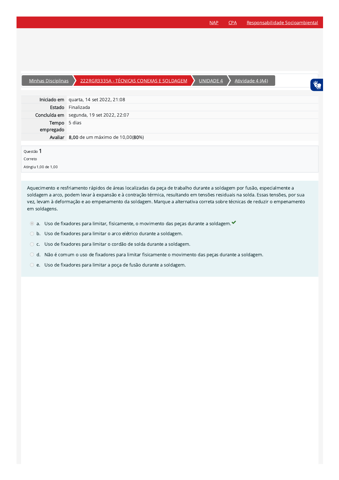 NAP CPA Responsabilidade Socioambiental Minhas Disciplinas 222RGR3335A - TÉCNICAS CONEXAS E SOLDAGEM UNIDADE 4 Atividade 4 (A4) Iniciado em quarta, 14 set 2022, 21:08 Estado Finalizada Concluída em segunda, 19 set 2022, 22:07 Tempo 5 dias empregado Avalian 8,00 de um máximo de 10,00(80%) Questão 1 Correto Atingiu 1,00 de 1,00 Aquecimento e resfriamento rápidos de áreas localizadas da peça de trabalho durante a soldagem por fusão, especialmente a soldagem a arco, podem levar à expansão e à contração térmica, resultando em tensões residuais na solda. Essas tensões, por sua vez, levam à deformação e ao empenamento da soldagem. Marque a alternativa correta sobre técnicas de reduzir empenamento em soldagens. a. Uso de fixadores para limitar, fisicamente, movimento das peças durante a soldagem. b. Uso de fixadores para limitar arco elétrico durante a soldagem. C. Uso de fixadores para limitar cordão de solda durante a soldagem. d. Não é comum uso de fixadores para limitar fisicamente movimento das peças durante a soldagem. e. Uso de fixadores para limitar a poça de fusão durante a soldagem.