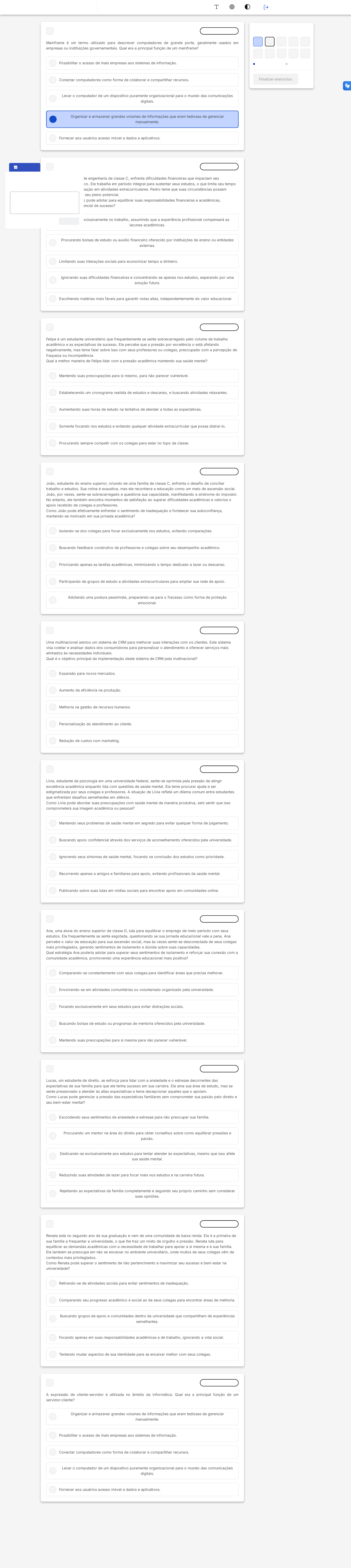 A B C D E A B C D E A B C D E A B C D E A B C D E A B C D E A B C D E A B C D E A B C D E A B C D E 1 Marcar para revisão Mainframe é um termo utilizado para descrever computadores de grande porte, geralmente usados em empresas ou instituições governamentais. Qual era a principal função de um mainframe? Possibilitar o acesso de mais empresas aos sistemas de informação. Conectar computadores como forma de colaborar e compartilhar recursos. Levar o computador de um dispositivo puramente organizacional para o mundo das comunicações digitais. Organizar e armazenar grandes volumes de informações que eram tediosas de gerenciar manualmente. Fornecer aos usuários acesso móvel a dados e aplicativos. 2 Marcar para revisão Pedro, um estudante de engenharia de classe C, enfrenta dificuldades financeiras que impactam seu desempenho acadêmico. Ele trabalha em período integral para sustentar seus estudos, o que limita seu tempo para revisão e participação em atividades extracurriculares. Pedro teme que suas circunstâncias possam impedi-lo de alcançar seu pleno potencial. Que abordagem Pedro pode adotar para equilibrar suas responsabilidades financeiras e acadêmicas, maximizando seu potencial de sucesso? Focando exclusivamente no trabalho, assumindo que a experiência profissional compensará as lacunas acadêmicas. Procurando bolsas de estudo ou auxílio financeiro oferecido por instituições de ensino ou entidades externas. Limitando suas interações sociais para economizar tempo e dinheiro. Ignorando suas dificuldades financeiras e concentrando-se apenas nos estudos, esperando por uma solução futura. Escolhendo matérias mais fáceis para garantir notas altas, independentemente do valor educacional. 3 Marcar para revisão Felipe é um estudante universitário que frequentemente se sente sobrecarregado pelo volume de trabalho acadêmico e as expectativas de sucesso. Ele percebe que a pressão por excelência o está afetando negativamente, mas teme falar sobre isso com seus professores ou colegas, preocupado com a percepção de fraqueza ou incompetência. Qual a melhor maneira de Felipe lidar com a pressão acadêmica mantendo sua saúde mental? Mantendo suas preocupações para si mesmo, para não parecer vulnerável. Estabelecendo um cronograma realista de estudos e descanso, e buscando atividades relaxantes. Aumentando suas horas de estudo na tentativa de atender a todas as expectativas. Somente focando nos estudos e evitando qualquer atividade extracurricular que possa distraí-lo. Procurando sempre competir com os colegas para estar no topo da classe. 4 Marcar para revisão João, estudante do ensino superior, oriundo de uma família de classe C, enfrenta o desafio de conciliar trabalho e estudos. Sua rotina é exaustiva, mas ele reconhece a educação como um meio de ascensão social. João, por vezes, sente-se sobrecarregado e questiona sua capacidade, manifestando a síndrome do impostor. No entanto, ele também encontra momentos de satisfação ao superar dificuldades acadêmicas e valoriza o apoio recebido de colegas e professores. Como João pode efetivamente enfrentar o sentimento de inadequação e fortalecer sua autoconfiança, mantendo-se motivado em sua jornada acadêmica? Isolando-se dos colegas para focar exclusivamente nos estudos, evitando comparações. Buscando feedback construtivo de professores e colegas sobre seu desempenho acadêmico. Priorizando apenas as tarefas acadêmicas, minimizando o tempo dedicado a lazer ou descanso. Participando de grupos de estudo e atividades extracurriculares para ampliar sua rede de apoio. Adotando uma postura pessimista, preparando-se para o fracasso como forma de proteção emocional. 5 Marcar para revisão Uma multinacional adotou um sistema de CRM para melhorar suas interações com os clientes. Este sistema visa coletar e analisar dados dos consumidores para personalizar o atendimento e oferecer serviços mais alinhados às necessidades individuais. Qual é o objetivo principal da implementação deste sistema de CRM pela multinacional? Expansão para novos mercados. Aumento da eficiência na produção. Melhoria na gestão de recursos humanos. Personalização do atendimento ao cliente. Redução de custos com marketing. 6 Marcar para revisão Lívia, estudante de psicologia em uma universidade federal, sente-se oprimida pela pressão de atingir excelência acadêmica enquanto lida com questões de saúde mental. Ela teme procurar ajuda e ser estigmatizada por seus colegas e professores. A situação de Lívia reflete um dilema comum entre estudantes que enfrentam desafios semelhantes em silêncio. Como Lívia pode abordar suas preocupações com saúde mental de maneira produtiva, sem sentir que isso comprometerá sua imagem acadêmica ou pessoal? Mantendo seus problemas de saúde mental em segredo para evitar qualquer forma de julgamento. Buscando apoio confidencial através dos serviços de aconselhamento oferecidos pela universidade. Ignorando seus sintomas de saúde mental, focando na conclusão dos estudos como prioridade. Recorrendo apenas a amigos e familiares para apoio, evitando profissionais da saúde mental. Publicando sobre suas lutas em mídias sociais para encontrar apoio em comunidades online. 7 Marcar para revisão Ana, uma aluna do ensino superior de classe D, luta para equilibrar o emprego de meio período com seus estudos. Ela frequentemente se sente esgotada, questionando se sua jornada educacional vale a pena. Ana percebe o valor da educação para sua ascensão social, mas às vezes sente-se desconectada de seus colegas mais privilegiados, gerando sentimentos de isolamento e dúvida sobre suas capacidades. Qual estratégia Ana poderia adotar para superar seus sentimentos de isolamento e reforçar sua conexão com a comunidade acadêmica, promovendo uma experiência educacional mais positiva? Comparando-se constantemente com seus colegas para identificar áreas que precisa melhorar. Envolve