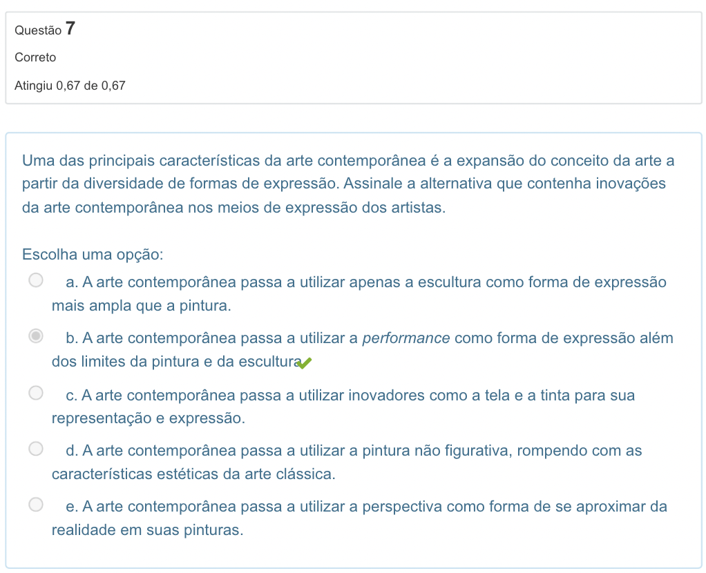 Questão 7 Correto Atingiu 0,67 de 0,67 Uma das principais características da arte contemporânea é a expansão do conceito da arte a partir da diversidade de formas de expressão. Assinale a alternativa que contenha inovações da arte contemporânea nos meios de expressão dos artistas. Escolha uma opção: a. A arte contemporânea passa a utilizar apenas a escultura como forma de expressão mais ampla que a pintura. b. A arte contemporânea passa a utilizar a performance como forma de expressão além dos limites da pintura e da escultura C. A arte contemporânea passa a utilizar inovadores como a tela e a tinta para sua representação e expressão. d. A arte contemporânea passa a utilizar a pintura não figurativa, rompendo com as características estéticas da arte clássica. e. A arte contemporânea passa a utilizar a perspectiva como forma de se aproximar da realidade em suas pinturas.