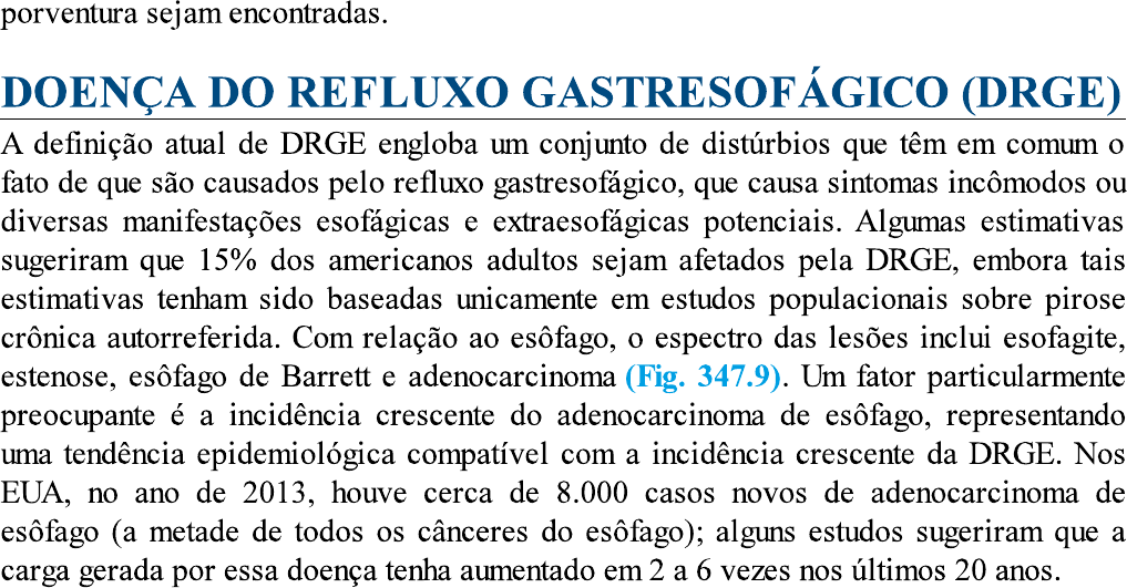 porventura sejam encontradas. DOENÇA DO REFLUXO GASTRESOFÁGICO (DRGE) A definição atual de DRGE engloba um conjunto de distúrbios que têm em comum o fato de que são causados pelo refluxo gastresofágico, que causa sintomas incômodos ou diversas manifestações esofágicas e extraesofágicas potenciais. Algumas estimativas sugeriram que 15% dos americanos adultos sejam afetados pela DRGE, embora tais estimativas tenham sido baseadas unicamente em estudos populacionais sobre pirose crônica autorreferida. Com relação ao esôfago, o espectro das lesões inclui esofagite, estenose, esôfago de Barrett e adenocarcinoma (Fig. 347.9). Um fator particularmente preocupante é a incidência crescente do adenocarcinoma de esôfago, representando uma tendência epidemiológica compatível com a incidência crescente da DRGE. Nos EUA, no ano de 2013, houve cerca de 8.000 casos novos de adenocarcinoma de esôfago (a metade de todos os cânceres do esôfago); alguns estudos sugeriram que a carga gerada por essa doença tenha aumentado em 2 a 6 vezes nos últimos 20 anos.A Esofagite erosiva B Estenose do com esofagite erosiva crônica C de Barrett D Adenocarcinoma esofágico com de Barrett FIGURA 347.9 Aspectos endoscópicos da esofagite péptica (A), da estenose péptica (B), da metaplasia de Barrett (C) e do adenocarcinoma desenvolvido em uma área do esôfago de Barrett (D). FISIOPATOLOGIA O subgrupo mais bem definido de pacientes com DRGE, embora represente a minoria dos casos totais, tem esofagite. A esofagite ocorre quando o ácido gástrico e a pepsina refluídos causam necrose da mucosa esofágica, que acarreta erosões e úlceras. É importante salientar que é normal encontrar algum grau de refluxo gastresofágico, que fisiologicamente está associado ao mecanismo da eructação (relaxamento transitório do EEI), mas a esofagite resulta do refluxo excessivo, em geral acompanhado de eliminação reduzida do suco gástrico refluído. A limitação do refluxo a um nível fisiologicamente desejável depende da integridade anatômica e fisiológica da junção esofagogástrica, um esfincter complexo formado pelo EEI e o diafragma cruralcircundante. Existem descritos três mecanismos principais responsáveis pela incompetência da junção esofagogástrica: (1) relaxamentos transitórios do EEI (reflexo vasovagal no qual o relaxamento do EEI é estimulado pela distensão do estômago); (2) hipotensão do EEI; ou (3) distorção anatômica da junção esofagogástrica, inclusive por hérnia de hiato. É importante ressaltar que o terceiro fator distorção anatômica da junção esofagogástrica é significativo por si mesmo e também porque interage com os dois primeiros mecanismos. Os relaxamentos transitórios do EEI são responsáveis por cerca de 90% do refluxo dos indivíduos normais ou dos pacientes com DRGE sem hérnia de hiato, mas os pacientes com hérnias de hiato têm um perfil de mecanismos mais heterogêneo. Entre os fatores que tendem a agravar o refluxo, independentemente do seu mecanismo, estão obesidade abdominal, gravidez, estados de hipersecreção gástrica, retardo do esvaziamento gástrico, supressão da peristalse esofágica e a glutonaria. Depois do refluxo ácido, a peristalse devolve o líquido refluído ao estômago e sua eliminação é concluída com a neutralização do ácido residual pelo bicarbonato existente na saliva deglutida. Desse modo, duas causas de eliminação ácida mais lenta são peristalse anormal e salivação reduzida. O esvaziamento peristáltico reduzido pode ser atribuído à peristalse anormal ou ao refluxo coexistente associado a uma hérnia de hiato. Quando há refluxo coexistente, o líquido retido dentro de uma hérnia de hiato por deslizamento reflui de volta para o esôfago durante o relaxamento do EEI induzido pela deglutição, um fenômeno que não ocorre normalmente. Um elemento intrínseco ao modelo fisiopatológico da DRGE é que o suco gástrico é deletério ao epitélio do esôfago. Contudo, a hipersecreção de ácido gástrico em geral não é o fator predominante da patogênese da esofagite. Uma exceção evidente é a síndrome de Zollinger-Ellison, que está associada à esofagite grave em cerca de 50% dos pacientes. Outra exceção é a gastrite crônica causada por Helicobacter pylori, que pode conferir um efeito protetor ao induzir gastrite atrófica com hipoacidez associada. A pepsina, a bile e as enzimas pancreáticas das secreções gástricas também podem lesar o epitélio esofágico, mas suas propriedades deletérias são atenuadas sem o meio ácido ou dependem da acidez para serem ativadas. A bile requer atenção porque persiste no material refluído, apesar do uso dos agentes supressores da acidez gástrica. A bile pode atravessar a membrana celular e causar lesão celular grave em um meio pouco ácido e também foi implicada como cofator da patogênese da metaplasia de Barrett e do adenocarcinoma. Por essa razão, a causticidade do material gástrico refluído é atribuída a outros fatores além do ácido clorídrico. SINTOMAS Pirose e regurgitação são os sintomas típicos da DRGE. Disfagia e dor torácica sãomanifestações clínicas um pouco menos comuns. Em cada caso, vários mecanismos potenciais atuam de forma a produzir os sintomas e estendem-se muito além dos conceitos básicos de erosão da mucosa e ativação dos nervos sensoriais aferentes. Especificamente, a hipersensibilidade e a dor funcional são cada vez mais reconhecidas como cofatores. No entanto, a abordagem clínica predominante é o tratamento empírico com inibidores da acidez, reservando-se os exames complementares aos casos que não respondem. Exceções importantes a essa regra são os pacientes com dor torácica ou disfagia persistente, que pode indicar a existência de distúrbios mais graves. Quando há dor torácica, é importante considerar cuidadosamente a existência de doença cardíaca. No caso da disfagia persistent