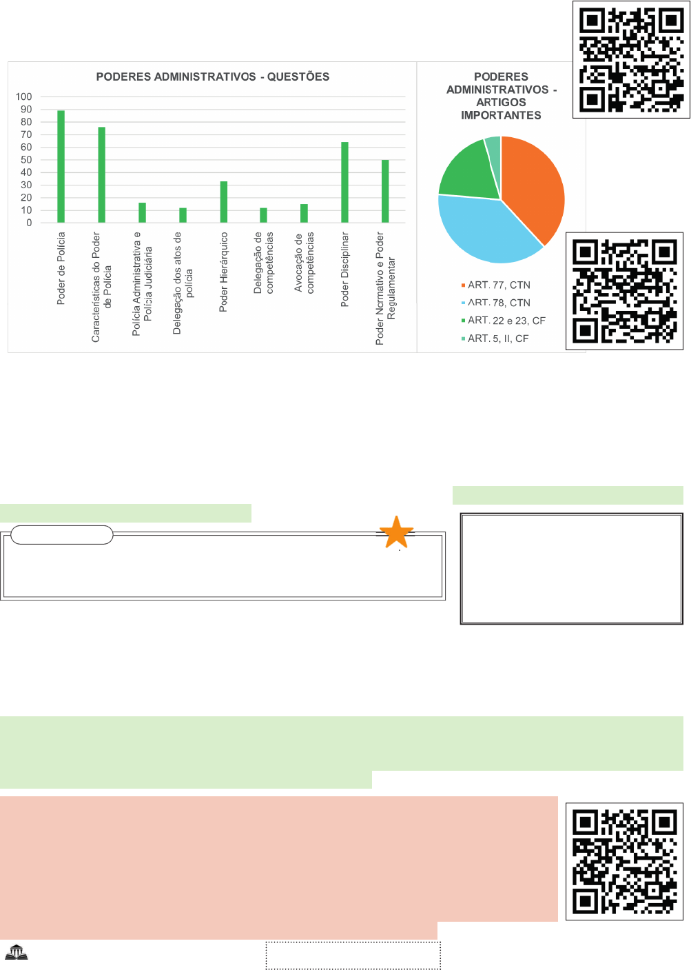 68 Número de acertos = ______ Questões resolvidas V. PODERES ADMINISTRATIVOS Indiscutivelmente o Poder de Polícia é o pod er mais cobrado nas provas de Concurso Público. 1. CONCEITO DE PODERES ADMINISTRATIVOS Os poderes administrativos podem ser conceituados como verdadeiros instrumentos que a Administração Pública dispõe para alcançar a fi nalidade pública. Nesse sentido, em razão do fato de que o Estado almeja alcançar o interesse público, ao ente estatal são conferidas algumas prerrogativas e poderes especiais que o particular não possui. Tais prerrogativas são denominados poderes-deveres, haja vista que o Estado deve fazer uso dessas ferramentas para alcançar o bem da coletividade, são esses: Poder Normativo, Poder de Polícia, Poder Hierárquico e Poder Disciplinar. 1.2. USO E ABUSO DE PODER Conforme estudado, os poderes administrativos são verdadeiros instrumentos conferidos ao Estado para fi ns de alcançar o interesse público. Portanto, essas ferramentas devem ser utilizadas estritamente para fi ns de alcançar o bem da coletividade, ou seja, caso os atos forem praticados além dos limites legais do necessário, estaremos diante do abuso de poder. A doutrina descreve o termo “abuso de poder” como as situações em que o agente público atua visando uma fi nalidade diversa daquela ligada ao interesse público e situações nas quais a autoridade pratica um ato que extrapola sua competência legal. Portanto, o termo abuso de poder é um gênero que contempla duas espécies, quais sejam: o desvio de fi nalidade e o excesso de poder. O excesso de poder se manifesta em todas as situações nas quais o agente público atua fora dos limites de sua competência legal. Trata-se de vício de competência que pode ensejar a anulação do ato administrativo. Ex: Técnico do INSS edita ato administrativo de competência do Analista do INSS. O desvio de poder, por sua vez, ocorre quando o agente público atua dentro dos limites da competência conferida a ele, contudo, visa alcançar fi nali- dade diversa daquela prevista em lei. Ex: o Governador edita Decreto para fi ns de desapro- priação de um imóvel com o intuito de prejudicar o proprietário. Nesse caso, a conduta não foi editada visando atender ao interesse público -> desvio de fi nalidade. QUESTÃO FGV Para o administrador público, a ação é um dever, não sendo possível a renún- cia de seus poderes administrativos. Correto FICA A DICA Esses poderes são irrenunciáveis, ou seja, o gestor público não pode dispor desses poderes livremente. Os poderes administrativos devem ser usados como meio da consecução do interesse público. Esses poderes são irrenunciáveis, ou seja, o gestor público não pode dispor desses Videoaula Questões Audioaula 69Número de acertos = ______ Questões resolvidas 2. PODER DE POLÍCIA Trata-se do poder que a Administração possui de restringir o exercício de liberdades individuais, o uso, gozo e a disposição da propriedade privada, sempre na busca do interesse público. O Poder de Polícia é fruto dos atos de supremacia geral do Poder Público em relação aos particulares, de modo que o uso dessa prerrogativa administrativa abrange toda a coletividade. O Código Tributário Nacional apresenta a seguinte conceituação do Poder de Polícia: Art. 77. As taxas cobradas pela União, pelos Estados, pelo Distrito Federal ou pelos Municípios, no âmbito de suas respectivas atribuições, têm como fato gerador o exercício regular do poder de polícia, ou a utili- zação, efetiva ou potencial, de serviço público específico e divisível, prestado ao contribuinte ou posto à sua disposição. “Art. 78. Considera-se Poder de Polícia atividade da administração pública que, limitando ou disciplinando direito, interesse ou liberdade, regula a prática de ato ou abstenção de fato, em razão de interesse público concernente à segurança, à higiene, à ordem, aos costumes, à disciplina da produção e do mercado, ao exercício de atividades econômicas dependentes de concessão ou autorização do Poder Público, à tranqui- lidade pública ou ao respeito à propriedade e aos direitos individuais ou coletivos.” O conceito do Poder de Polícia reúne os seguintes aspectos, são eles: a) atividade desempenhada pela Administração Pública que estabelece limitações à liberdade individual e à propriedade privada dos particulares em prol do interesse coletivo; b) regula a prática de ato ou a abstenção de fato, contudo, em regra manifesta-se por intermédio de deveres negativos, criando obrigações de não fazer; c) manifesta-se por meio de atos normativos gerais e abstratos (ex.: regras municipais acerca do direito de construir) e atos individuais (ex: licença e autorização); d) baseado na lei: a expedição de atos administrativos no exercício do Poder de Polícia deve encontrar-se em conformidade com a lei. Trata-se de poder que, assim como os demais, decorre da supremacia geral do Estado que se aplica frente a todos os particulares, sem a necessidade de demonstração de qualquer vínculo de natureza especial. 2.1. CARACTERÍSTICAS DO PODER DE POLÍCIA: a) Trata-se de atividade restritiva e preventiva – poder negativo; b) Possui, em regra, natureza discricionária. Contudo, alguns atos que decorrem do Poder de Polícia estão vinculados aos termos da lei, como o ato de concessão de licença; c) Possui caráter liberatório: o Poder de Polícia autoriza o exercício de uma atividade. Ex: autorização para dirigir; d) O Poder de Polícia é geral: destinado à generalidade dos indivíduos; e) Cria, em regra, obrigações de não fazer; • Desvio de finalidade: ocorre quando o agente público atua em conformidade com a sua competência, mas busca finalidade diversa daquela estabelecida em lei. • Excesso de poder: ocorre quando o gestor público edita um ato administrativo que ultrapassa os lim- ites de sua competência legal. Revisao de prova áu