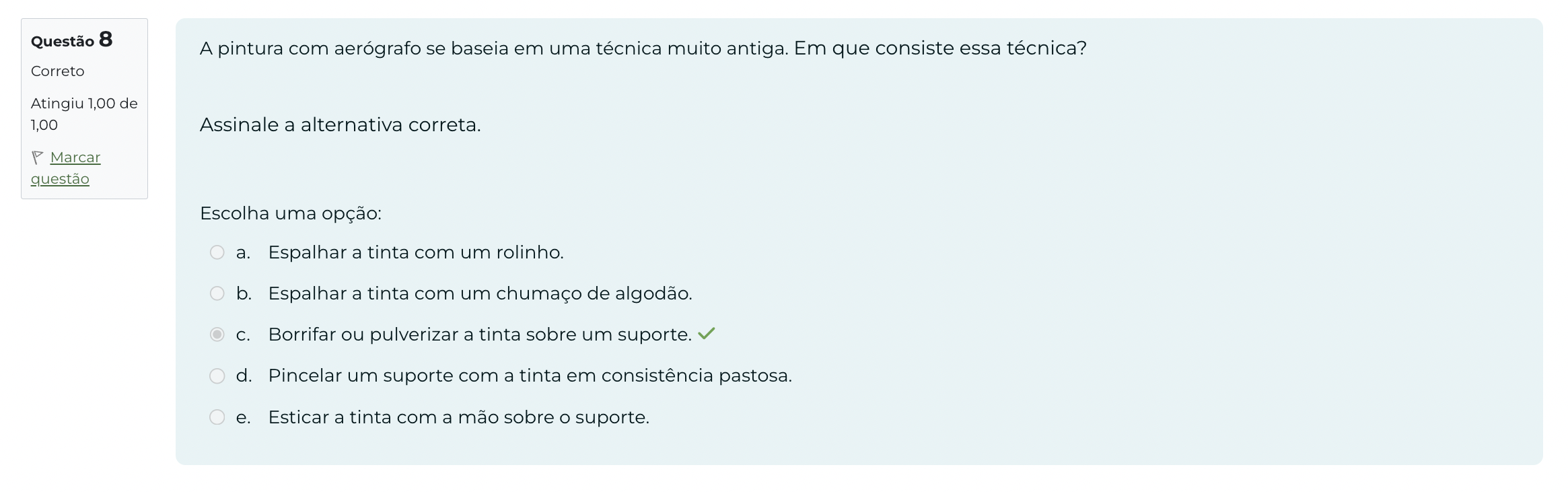 Questão 8 A pintura com aerógrafo se baseia em uma técnica muito antiga. Em que consiste essa técnica? Correto Atingiu 1,00 de 1,00 Assinale a alternativa correta. Marcar questão Escolha uma opção: a. Espalhar a tinta com um rolinho. b. Espalhar a tinta com um chumaço de algodão. C. Borrifar ou pulverizar a tinta sobre um suporte. d. Pincelar um suporte com a tinta em consistência pastosa. e. Esticar a tinta com a mão sobre o suporte.