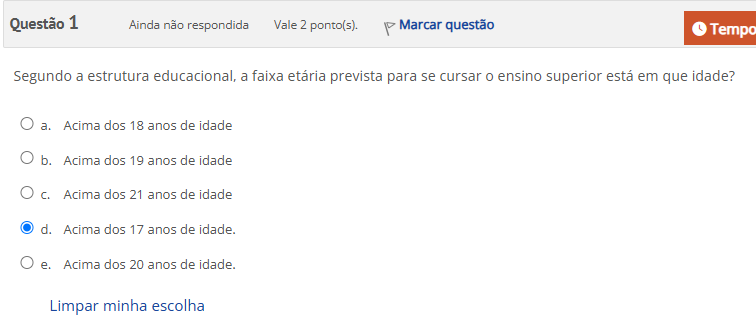 Questão 1 Ainda não respondida Vale 2 ponto(s). Marcar questão Tempo Segundo a estrutura educacional, a faixa etária prevista para se cursar ensino superior está em que idade? a. Acima dos 18 anos de idade b. Acima dos 19 anos de idade C. Acima dos 21 anos de idade d. Acima dos 17 anos de e. Acima dos 20 anos de idade. Limpar minha escolha