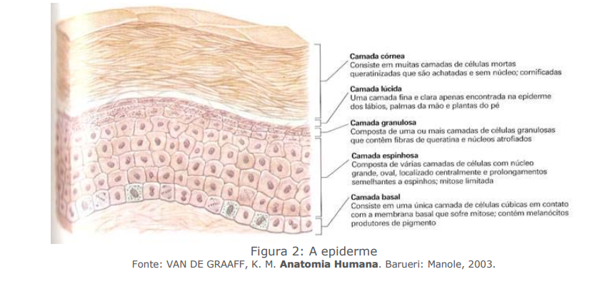 Camada Consiste em muitas camadas de células mortas queratinizadas que são achatadas e sem comificadas Camada Uma camada e clara apenas encontrada na epiderme dos palmas da mão e plantas do pé Camada granulosa Composta de uma ou mais camadas de células granulosas que contêm fibras de queratina e núcleos atrofiados Camada espinhosa Composta de várias camadas de células com núcleo grande, oval, localizado centralmente e prolongamentos semelhantes a mitose limitada Camada basal Consiste em uma única camada de células em contato com a membrana basal que sofre mitose; contém melanócitos produtores de pigmento Figura 2: A epiderme Fonte: VAN DE GRAAFF, K. M. Anatomia Humana. Barueri: Manole, 2003.