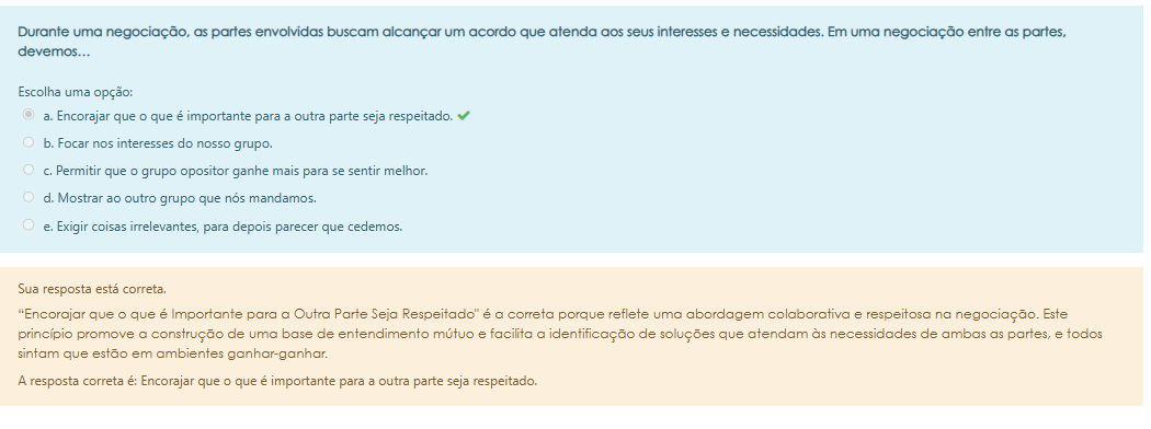 Durante uma as partes envolvidas buscam alcançar um acordo que atenda aos seus interesses e Em uma negociação entre as partes, devemos... Escolha uma opção: a. Encorajar que que é importante para a outra parte seja respeitado. b. Focar nos interesses do nosso grupo. Permitir que grupo opositor ganhe mais para se sentir melhor. d. Mostrar ao outro grupo que nós mandamos. e. Exigir coisas irrelevantes, para depois parecer que cedemos. Sua resposta está correta. "Encorajar que que é Importante para Outro Parte Seja é a correta porque reflete uma abordagem colaborativa e no negociação. Este princípio promove a construção de base de entendimento mútuo e facilita a identificação de soluções que atendam às necessidades de ambas as partes, e todos sintam que estão em ambientes ganhar-ganhar. A resposta correta é: Encorajar que que é importante para a outra parte seja respeitado.