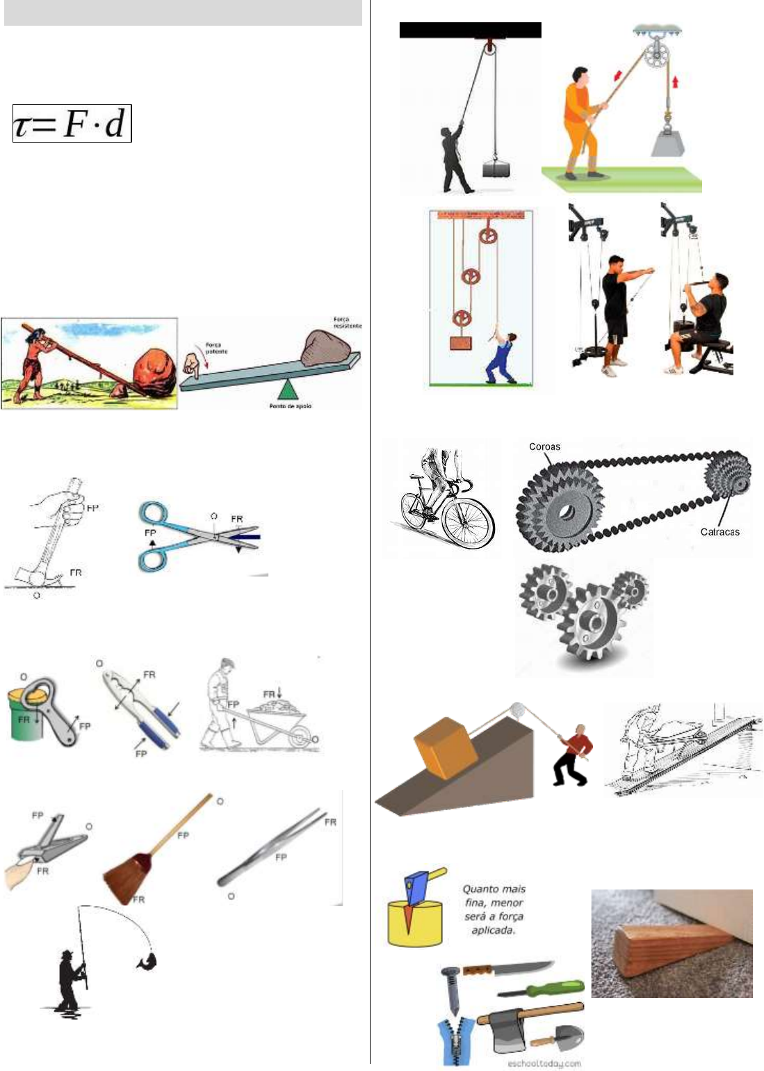 Cap 1 – maquinas no cotidiano Trabalho é uma grandeza física que resulta no produto entre a Força x deslocamento. Joule (J) = newton (N) . metros (m) Tipos de maquinas simples 1) Alavancas: objeto rígido utilizado em um ponto fixo, chamado de base ou fulcro, que serve para amplificar a força mecânica aplicada a outro objeto. Tipos de alavancas: • interfixas • Inter-resistentes • Interpotentes 2) Roldanas ou polias: 3) Engrenagem 4) Plano inclinado 5) cunha Exercício de Ciências – Cap 1 – maquinas 1) O que é trabalho? 2) O que é uma máquina? 3) De 3 exemplos de maquinas simples? 4) Para realizar ________________ existem duas grandezas físicas: Força e Deslocamento. a) Potência b) Trabalho c) Energia d) Deslocamento e) Gravidade 5) É um exemplo de máquina complexa? a) Tesoura b) Martelo c) Roldana d) Bicicleta e) Alavancas 6) A imagem a baixo é uma máquina simples do tipo? a) Tesoura b) Alavanca c) Roldana d) Plano inclinado e) Polia 7) Para suspender um balde com água do fundo de um poço é recomendado o uso de? a) Cunha b) Alavanca c) Parafuso d) Plano inclinado e) Polia 8) Uma faca ou machado bem afiado é um tipo de máquina simples, qual? a) Plano inclinado b) Cunha c) Alavanca d) Roldana e) Polia 9) É um exemplo de alavancas interfixas? a) Tesoura b) Martelo c) Roldana d) Pinça e) Carro de mão 10) A imagem é um exemplo de? 11) Esse tipo de máquina simples é composta por uma ou mais rodas, que giram em torno de um eixo central e possui um sulco por onde passa uma corda ou fio flexível. A descrição faz uma referência a um tipo de máquina simples chamada: a) Rampa b) Cunha c) Alavancas d) Roldanas e) Plano inclinado. 12) O sistema utilizado na bicicleta é um tipo de máquina simples. Que tipo é esse? a) Alavanca b) Rodas c) Engrenagens d) Plano inclinado e) polia 13) É um tipo de aparelho utilizado para minimizar o esforço quando se levanta um corpo de muita massa ou até mesmo de lugares altos. a) Martelo b) Alavanca c) Pinça d) Plano inclinado e) Roldana