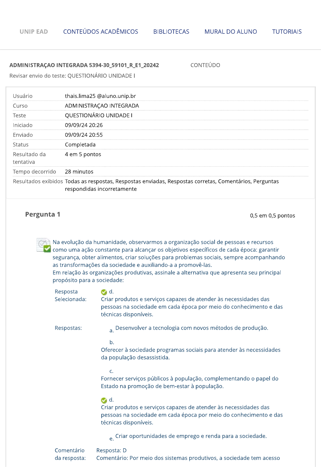 UNIP EAD CONTEÚDOS ACADÊMICOS BIBLIOTECAS MURAL DO ALUNO TUTORIAIS ADMINISTRAÇÃO INTEGRADA 5394-30_59101_R_E1_20242 CONTEÚDO Revisar envio do teste: QUESTIONÁRIO UNIDADE | Usuário Curso ADMINISTRAÇÃO INTEGRADA Teste QUESTIONÁRIO UNIDADE Iniciado 09/09/24 20:26 Enviado 09/09/24 20:55 Status Completada Resultado da 4 em 5 pontos tentativa Tempo decorrido 28 minutos Resultados exibidos Todas as respostas, Respostas enviadas, Respostas corretas, Comentários, Perguntas respondidas incorretamente Pergunta 1 0,5 em 0,5 pontos Na evolução da humanidade, observarmos a organização social de pessoas e recursos como uma ação constante para alcançar os objetivos específicos de cada época: garantir segurança, obter alimentos, criar soluções para problemas sociais, sempre acompanhando as transformações da sociedade e auxiliando-a a promovê-las. Em relação às organizações produtivas, assinale a alternativa que apresenta seu principal propósito para a sociedade: Resposta d. Selecionada: Criar produtos e serviços capazes de atender às necessidades das pessoas na sociedade em cada época por meio do conhecimento e das técnicas disponíveis. Respostas: a. Desenvolver a tecnologia com novos métodos de produção. b. Oferecer à sociedade programas sociais para atender às necessidades da população desassistida. C. Fornecer serviços públicos à população, complementando o papel do Estado na promoção de bem-estar à população. d. Criar produtos e serviços capazes de atender às necessidades das pessoas na sociedade em cada época por meio do conhecimento e das técnicas disponíveis. e. Criar oportunidades de emprego e renda para a sociedade. Comentário Resposta: D da resposta: Comentário: Por meio dos sistemas produtivos, a sociedade tem acessoaos produtos e serviços que necessita. Cabe às empresas organizar recursos e desenvolver métodos de produção para oferecer à população os produtos e serviços que esta demanda, e com isto obter contrapartida pela atividade produtiva. Pergunta 2 0,5 em 0,5 pontos Nas últimas décadas do século XX, podemos observar grandes transformações nas empresas, motivadas pela busca por melhores métodos para a produção e oferta de produtos e serviços. Esta transformação observada teve como principal elemento motivador: Resposta O aumento da competição entre empresas. a. Selecionada: Respostas: O aumento da competição entre empresas. a. b. O aumento da demanda por produtos e serviços. C. Estímulos oferecidos pelo governo para o crescimento das indústrias do país. d. A escassez de recursos naturais. e. A crise econômica observada nos anos 90 no cenário internacional. Comentário Resposta: A da resposta: Comentário: Ao final do século XX, diante da globalização e da expansão de empresas multinacionais, as empresas passam a buscar a melhoria de seus métodos de organização do trabalho e das próprias cadeias produtivas, que, motivadas pela competição, buscam melhorar continuamente a maneira como entregam valor para a sociedade. Pergunta 3 0,5 em 0,5 pontos Em relação ao conceito de excelência organizacional, analise as afirmações a seguir: I. Excelência representa para uma empresa a sua capacidade de interagir adequadamente no ambiente em que atua, oferecendo valor não só a seus clientes ou proprietários, mas a todas as partes interessadas em sua existência. II. O equilíbrio entre o resultado e os métodos e parcerias leva as empresas do modelo de busca de competitividade para o caminho da excelência, em que ser competitiva é uma consequência para as organizações engajadas nesse propósito. III. Excelência (com foco na gestão) é o alcance de resultados harmonizados para todas as partes interessadas, criando valor sustentável, de forma proativa e com constância de propósitos. Da análise das afirmações, são corretas somente as afirmações:Resposta Selecionada: e. I, e III. Respostas: a. lell. b. II e III. e. III. Comentário da Resposta: E resposta: Comentário: As três afirmações estão corretas. A excelência da gestão promove a oferta de valor sustentável para o conjunto de partes interessadas e não somente a clientes. Pergunta 4 0,5 em 0,5 pontos O MEG é um modelo de referência que ajuda as organizações a alcançarem um patamar de excelência. Desta forma, entendemos que a busca pela excelência é: I. Compreender que a organização é um sistema estático e bem definido por suas regras e procedimentos, integrante de um ecossistema complexo com o qual interage e do qual depende. II. Gerar valor para todos os integrantes da cadeia de valor, numa relação de interdependência e cooperação. III. Ter qualidade na interação com o seu ecossistema, velocidade de aprendizado e capacidade de adaptação diante de novos cenários imprevistos e incontroláveis. Da análise das afirmações, são corretas somente as afirmações: Resposta Selecionada: b. II III. Respostas: a. b. e. III. Comentário da Resposta: B resposta: Comentário: As afirmações e III são afirmações verdadeiras. A afirmação está incorreta, uma vez que as organizações são sistemas dinâmicos e adaptáveis, e não estáticos, especialmente diante da complexidade do ambiente organizacional. Pergunta 5 0,5 em 0,5 pontosuso do MEG por uma organização proporciona diversos benefícios apontados pela própria FNQ, entre os quais podemos destacar: I. Estimula o monitoramento dos resultados organizacionais e possível ações de correção de curso, em caso de resultados insuficientes. II. Estimula a competitividade e sustentabilidade pela adoção de práticas referenciadas em benchmarking e adaptadas ao contexto da organização. III. Promove o aprendizado organizacional por meio da melhoria contínua e da sistematização dos mecanismos de avaliação e aprendizado. Da análise das afirmações, são corretas somente as afirmações: Resposta Selecionada: I, e III. e. Respostas: a. II. b. II e
