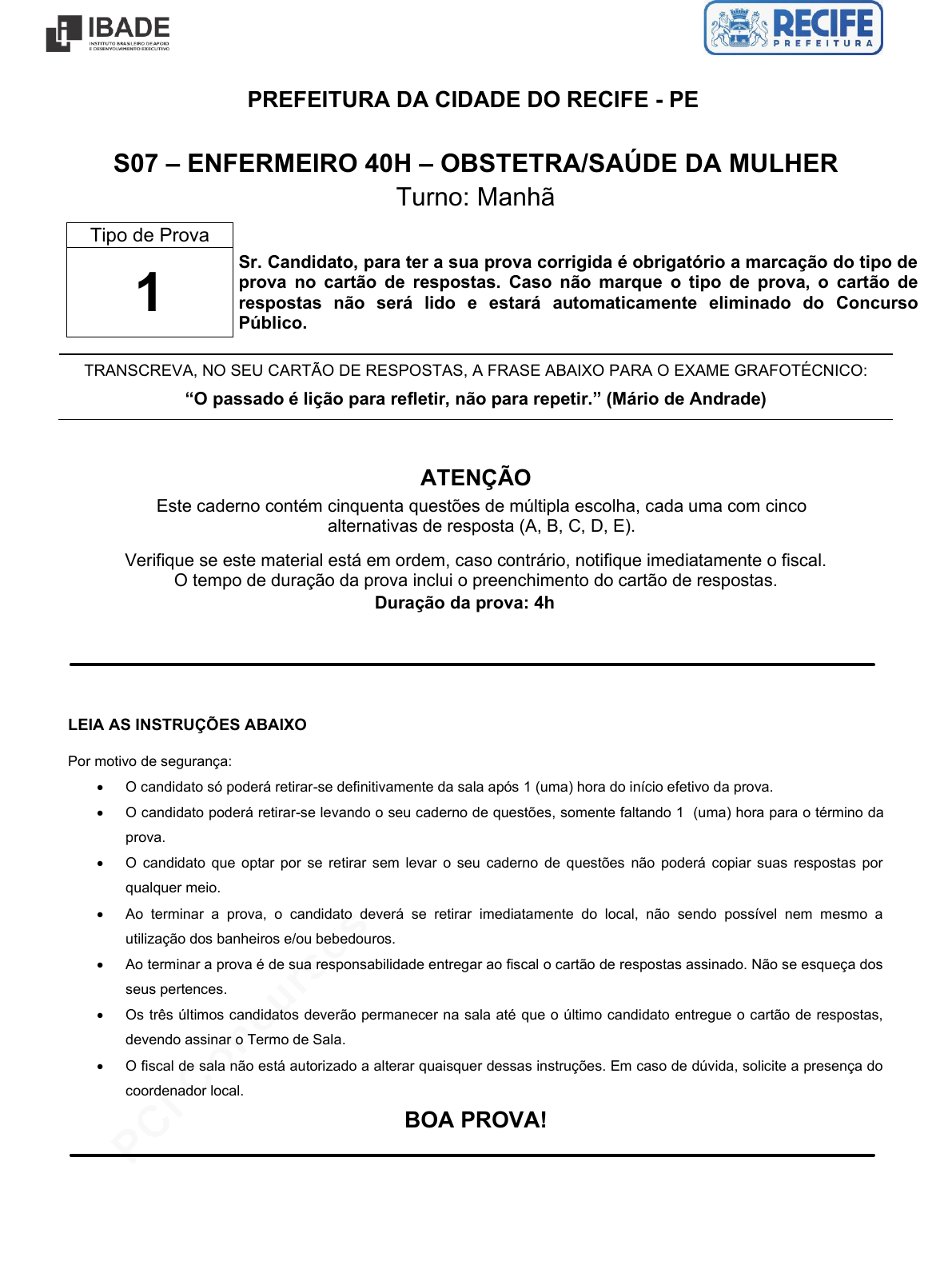 pcimarkpci MDAwMDowMDAwOjAwMDA6MDAwMDowMDAwOmZmZmY6YmFlMzozMGVh:VHVlLCAxNiBBcHIgMjAyNCAxODozNzozOSAtMDMwMA== www.pciconcursos.com.br PREFEITURA DA CIDADE DO RECIFE - PE S07 – ENFERMEIRO 40H – OBSTETRA/SAÚDE DA MULHER Turno: Manhã Tipo de Prova 1 Sr. Candidato, para ter a sua prova corrigida é obrigatório a marcação do tipo de prova no cartão de respostas. Caso não marque o tipo de prova, o cartão de respostas não será lido e estará automaticamente eliminado do Concurso Público. TRANSCREVA, NO SEU CARTÃO DE RESPOSTAS, A FRASE ABAIXO PARA O EXAME GRAFOTÉCNICO: “O passado é lição para refletir, não para repetir.” (Mário de Andrade) ATENÇÃO Este caderno contém cinquenta questões de múltipla escolha, cada uma com cinco alternativas de resposta (A, B, C, D, E). Verifique se este material está em ordem, caso contrário, notifique imediatamente o fiscal. O tempo de duração da prova inclui o preenchimento do cartão de respostas. Duração da prova: 4h LEIA AS INSTRUÇÕES ABAIXO Por motivo de segurança: • O candidato só poderá retirar-se definitivamente da sala após 1 (uma) hora do início efetivo da prova. • O candidato poderá retirar-se levando o seu caderno de questões, somente faltando 1 (uma) hora para o término da prova. • O candidato que optar por se retirar sem levar o seu caderno de questões não poderá copiar suas respostas por qualquer meio. • Ao terminar a prova, o candidato deverá se retirar imediatamente do local, não sendo possível nem mesmo a utilização dos banheiros e/ou bebedouros. • Ao terminar a prova é de sua responsabilidade entregar ao fiscal o cartão de respostas assinado. Não se esqueça dos seus pertences. • Os três últimos candidatos deverão permanecer na sala até que o último candidato entregue o cartão de respostas, devendo assinar o Termo de Sala. • O fiscal de sala não está autorizado a alterar quaisquer dessas instruções. Em caso de dúvida, solicite a presença do coordenador local. BOA PROVA! pcimarkpci MDAwMDowMDAwOjAwMDA6MDAwMDowMDAwOmZmZmY6YmFlMzozMGVh:VHVlLCAxNiBBcHIgMjAyNCAxODozNzozOSAtMDMwMA== www.pciconcursos.com.br PREFEITURA DA CIDADE DO RECIFE - PE IBADE ENFERMEIRO OBSTETRA/SAÚDE DA MULHER Tipo 1 – Página 2 LÍNGUA PORTUGUESA Leia o texto e responda às questões de 01 a 10. E na vida real... Independentemente de audiência e de repercussão, um programa de tevê como o Big Brother Brasil vai além do entretenimento. A desistência de uma participante, nos primeiros dias, trouxe um importante alerta sobre o comportamento social da atualidade. Patrick Selvatti | 05/02/2024 Embora seja um dos produtos televisivos mais assistidos e comentados, um reality show — seja qual for a sua temática — não é uma unanimidade. Há quem ame, há quem odeie e há quem ignore. Fato é que, independentemente dessa questão sobre audiência e REPERCUÇÃO/REPERCUSSÃO, um programa de tevê como o Big Brother Brasil vai além do entretenimento. Logo nos primeiros dias[,] por exemplo[,] a desistência de uma participante trouxe um importante alerta sobre o comportamento social da atualidade. Há uma simbologia importante no ato de se apertar um botão de desistência em um reality show. O que levaria[,] por exemplo[,] uma jovem influenciadora de 22 anos, com um total de 40 milhões de seguidores, acostumada a exposição pública, a1 abrir mão de uma experiência como essa? Repercutiu-se muito sobre as razões da participante Vanessa Lopes, que nitidamente vivenciou uma espécie de surto dentro do confinamento com outras 25 pessoas, longe da família e dos amigos e, principalmente, do acesso às2 redes sociais. A internet permeia as nossas vidas, e a juventude contemporânea é a primeira a ser criada em um ambiente ________ a conexão virtual supera a interação cara a3 cara. A tecnologia proporciona inúmeras oportunidades, mas há que se analisarem os potenciais danos que uma geração excessivamente conectada pode enfrentar, especialmente quando esse lugar se distancia da vida real. A perda do desenvolvimento de habilidades sociais INTER-PESSOAIS/INTERPESSOAIS é real. Jovens que passam grande parte do tempo on-line enfrentam dificuldades ao se comunicarem pessoalmente, ao expressarem emoções e ao interpretarem sutilezas na linguagem corporal. Essa falta de interação presencial pode inviabilizar a construção de relacionamentos sólidos. A exposição constante a padrões irreais nas redes sociais pode contribuir para a formação de uma AUTOIMAGEM/AUTO-IMAGEM distorcida. No caso de Vanessa Lopes, o principal drama foi se enxergar em um jogo em que todos os atores envolvidos estavam posicionados em volta da sua história. Essa busca incessante por validação on-line, muitas vezes baseada em likes e em comentários, pode levar os jovens à4 uma caça constante por aceitação que prejudica a AUTOESTIMA/AUTO-ESTIMA quando não são alcançados os padrões inatingíveis estabelecidos pelos ambientes virtuais que domina. Aos pais, cabe a orientação das crianças e dos adolescentes sobre como utilizar o smartphone de maneira responsável. Estabelecer limites de tempo on-line, incentivar a participação em atividades sociais e promover a comunicação aberta são estratégias essenciais para ajudar a juventude a5 encontrar um equilíbrio saudável entre as interações virtuais e reais. Enquanto a internet e a tecnologia continuam a moldar o mundo, é vital que as futuras gerações sejam estimuladas a navegar neste ambiente digital sem que se perca uma conexão significativa com a vida real. O desafio é esse. Fonte: SELVATTI, Patrick. E na vida real... Correio Braziliense, 05 de fevereiro de 2024. Disponível em: https://www.correiobraziliense.com.br/opiniao/2024/02/6 797902-e-na-vida-real.html. Acesso em: 06 fev. 2024. Adaptado. Questão 1 Qual é a tipologia que fundamenta o texto lido? (A) Dissertação expositiva. (B) Narração. (C) Dissertação argumentativa. (D) Descri