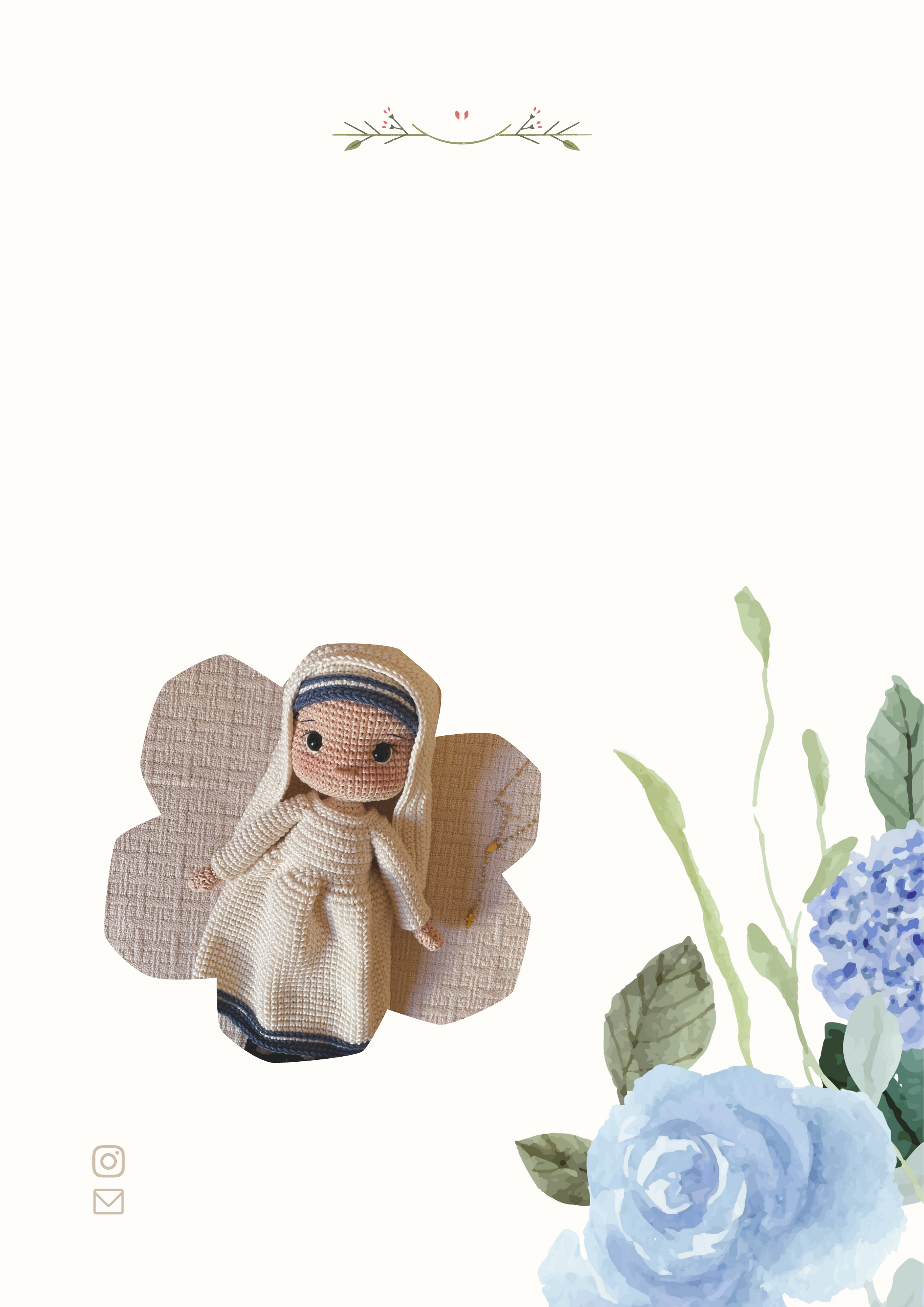 @tecendomaria tecendomaria@gmail.com PADRÕES BONEQUINHOS: Santa Madre Teresa Santa Madre Teresa @tecendomaria tecendomaria@gmail.com Este e-book e tudo o que ele contém (incluindo os vídeos) foi feito somente para uso pessoal e individual. Não é permitido o compartilhamento dele e de suas imagens com terceiros! Também não é permitida a venda e a distribuição deste e-book. Enfatizo que ele é somente de USO INDIVIDUAL. Em caso de distribuição, compartilhamento e venda indevida, a pessoa poderá ser penalizada juridicamente. Sobretudo, peço que seja respeitado o direito da designer (Larissa Ribeiro), uma vez que foi gastado tempo, dinheiro e muito cuidado na produção deste e-book. A melhor forma de combater a pirataria digital é a conscientização! Direitos Autorais Autora: Larissa Ribeiro Muito obrigada! Respeite os direitos autorais! Esse padrão é de minha autoria, portanto não é autorizado que você compartilhe, copie ou revenda este arquivo e imagens nele contidas, sob pena de denúncia e processo jurídico. Ele é de uso EXTRITAMENTE PESSOAL. Pense nisso como o seu trabalho: você gostaria que alguém o roubasse de você, ou o vendesse em seu nome, ganhando dinheiro sobre o seu esforço? Não seria certo, correto? Então vamos ajudar uns aos outros tendo a consciência de que o trabalho de todos deve ser respeitado e valorizado! Muito obrigada por adquirir este padrão tão especial e por apoiar essa pequena empreendedora! Saiba que tudo foi feito com carinho e cuidado para que você possa encantar os corações com suas artes. É muito especial saber que o meu trabalho te inspira e te ajuda de alguma forma. Espero que esse padrão seja de muito proveito e fonte de grandes aprendizados para você! E que Deus te abençoe infinitamente e te inspire a produzir peças lindas, cheias de significado e de Fé. Informações sobre o padrão A Santa Madre Teresa ficará com aproximadamente 30 cm de altura até a cabeça, tamanho que pode variar a depender do material, da agulha e da tensão do seu ponto. Foram utilizadas as agulhas 3,5 mm (na saia do vestido) e 1,75 mm (no restante) Soft da Círculo. Você pode usar a agulha que preferir, mas saiba que terá um resultado diferente (principalmente no tamanho). Você pode variar as cores, use sua criatividade e se inspire! Este padrão é de nível intermediário. Fio Amigurumi nas cores especificadas ou de sua preferência Linha fina de costura na cor preta ou marrom escuro Agulhas 1,75 mm e 3,5 mm Soft da Círculo (pode ser qualquer uma de sua preferência; só lembre-se de usar uma numeração maior na saia do vestido, para ela ficar mais solta e maleável) Agulha de tapeceiro grande (eu uso com ponta) Agulha de costura fina com ponta (de preferência mais comprida, para facilitar o bordado do rostinho) Cola Jeans da Acrilex ou outra cola de tecido à prova d’água 1 par de olhos com travas de segurança de 12 mm 1 canudo de espessura grossa (ou outra coisa que queira colocar para sustentar o pescoço, como vareta de balão) Arame galvanizado de espessura média/grossa Enchimento antialérgico Alfinetes Tesoura sem ponta Materiais Cores utilizadas Chantilly (7563) Off White (8176) Náutico (2931)Preto (8990) Dicas de confecção Faça pequenas pausas durante a confecção, para não se sobrecarregar. Faça os pontinhos mais apertados na parte do corpinho; assim, você garante mais firmeza. Porém, nas vestes, faça os pontos mais folgados, sem muita tensão, porque a veste precisa ficar maleável. Por esse motivo eu utilizo uma agulha maior (3,5 mm) na parte da saia do vestido. A agulha 3,5 mm também pode ser usada para fazer o sapatinho, se você perceber que ele ficou apertado com a agulha usada no corpinho (1,75 mm). Você pode usar um fio mais maleável no vestido, se preferir, como o Balloon Amigo (Pingouin) ou o Avelã (Círculo). Eu utilizo o ponto X em todo o padrão, pois acho que ele deixa a peça mais firme e mais bonita. Nas vestes você pode usar o ponto V se quiser uma roupinha mais leve. Cuidado com a quantidade de enchimento. Encontre um equilíbrio, nem muito e nem pouco. Pois, se colocar muito, os pontos irão abrir e você não conseguirá modelar o rostinho. E se colocar pouco, a peça ficará mole. Vá colocando aos poucos, até sentir que a peça está mais firme ao toque. Modele o rostinho com delicadeza, pressionando os olhos para trás e o queixinho para cima depois de pronto. Você pode usar cola para fixar as vestes, ou costurar. Se for usar cola, use uma à prova d´água e espere o tempo de secagem para conferir se realmente colou. Aviso A artesã por trás desse padrão é canhota… Por isso, pode ser que você note uma leve diferença entre as fotos de instrução do padrão e as fotos do trabalho final, pois as fotos foram invertidas de lado, para que você pudesse compreender melhor. Boa confecção! AM: anel mágico carr: carreira corr: correntinha pb: ponto baixo pbx: ponto baixíssimo aum: aumento com 2 pb no mesmo ponto aum triplo: aumento com 3 pb no mesmo ponto dim: diminuição BLO:na 3ª alça na carr 4 dos pés Formato das pernas Detalhe em ponto rendinha Lugar correto de fazer as correntinhas para juntar as pernas (bem no meio, para que os pés fiquem virados para a frente) Juntando as pernas com um pb Fazendo pb até o outro lado da primeira correntinha feita para juntar as pernas Pb onde se inicia a carr 1 do corpo pernas e corpo Formato do corpinho Quadril sem enchimento Juntando os braços na carr 19 do corpo Continuando a tecer os braços na carr 20 do corpo (pegando somente os pontos dos braços) Corpo pronto Cabeça Veja as fotos na próxima página. Essa etapa pode ser feita antes ou depois de iniciar a cabeça. Eu prefiro fazer quando já estou na metade da cabeça. Pegue um canudo grosso e corte uma das pontas em diagonal, num tamanho que seja grande para preencher todo o corpo e a cabeça. Insira o canudo no pescoço, girando, para que ele não empurre o enchimento