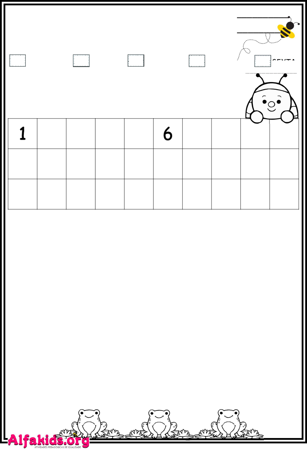 ESCOLA:_______________________________________________ NOME: ________________________________________________ DATA: ______/_____/________ SEGUNDA TERÇA QUARTA QUINTA SEXTA -------------------------------------------------------------------------- Educação Infantil e Ensino Fundamental I - Todos os direitos reservados© Matemática 1 - COMPLETE A SEQUÊNCIA NUMÉRICA ATÉ 30. 2 - COMPLETE. A) O NÚMERO QUE VEM ANTES DO 11 É ________. B) O NÚMERO QUE ESTÁ ENTRE O 27 E O 29 É _______. C) O ÚLTIMO NÚMERO DA 1ª LINHA É ______ . D) O 1º NÚMERO DA 3ª LINHA É ______ . E) O NÚMERO QUE VEM DEPOIS DO 19 É ______. F) ESTA SEQUÊNCIA VAI ATÉ O NÚMERO _______. G) QUANTAS DEZENAS TEM NA SEQUÊNCIA? _______. ESCOLA:_______________________________________________ NOME: ________________________________________________ DATA: ______/_____/________ SEGUNDA TERÇA QUARTA QUINTA SEXTA -------------------------------------------------------------------------- Educação Infantil e Ensino Fundamental I - Todos os direitos reservados© Matemática 1 - OBSERVE OS DESENHOS E COMPLETE. A) QUANTAS BORBOLETAS NA CENA? B) QUANTAS JOANINHAS? C) QUANTAS JOANINHAS DO LADO ESQUERDO DA JARDINEIRA? D) QUANTAS JOANINHAS DO LADO DIREITO DA JARDINEIRA? E) QUANTAS FLORES? F) QUANTAS JOANINHAS DO LADO DIREITO DA BORBOLETA? G) QUANTAS JOANINHAS EM CIMA DA FLOR?