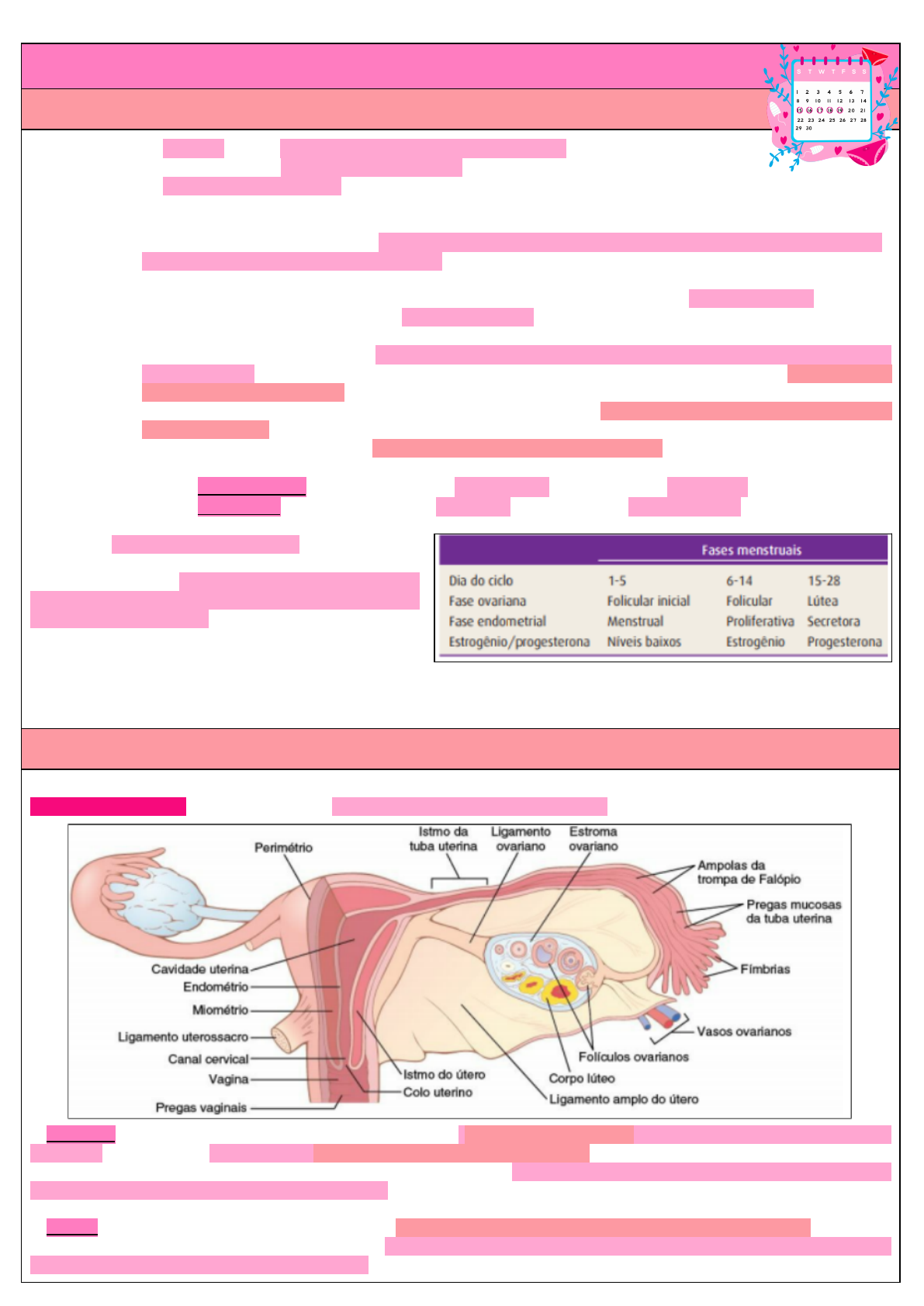 Karina Luiz -TUT 1 - MÓD 13 Tut 1 - ciclo menstrual Definição ● É definido normal aquele ciclo que tem duração de 28 ± 7 dias , com fluxo que dure 4 ± 2 dias, e perda média de 20 a 60mL de sangue ,a definição objetiva considera como normal o volume ≤ 80ml por cicl o. Se trata de um conjunto de alterações hormonais cíclicas que tem por objetivo a liberação de um óvulo maduro e o preparo do endométrio para a implantação embrionária. ○ O padrão considerado normal é 28 dias , mas pode ser 7 dias a mais (35 dias) ou 7 dias a menos (21 dias) sem ser considerado irregular. Se a menstruação ocorrer com menos de 21 dias entre um ciclo e outro, chamamos de polimenorreia . Se ocorrer com mais de 35 dias , chamamos de oligomenorreia . ○ O ciclo menstrual começa no primeiro dia da menstruação e termina no dia anterior à próxima menstruação . Estudos mostram que os ciclos menstruais são mais irregulares nos d ois primeiros anos após a menarca (O eixo hormonal ainda está em maturação, resultando em ciclos anovulatórios e variações na duração do ciclo.)e nos três anos antes da menopausa perimenopausa O declínio da função ovariana causa ciclos irregulares, com variações e mudanças no fluxo menstrual.) , variando menos entre os 20 e 40 anos de idad e(eixo esta bem ajustado ) . ○ Em perspectiva da função ovariana, as fases do ciclo são divididas em: ■ Fase folicular pré ovulatória (fase proliferativa do endométrio, estrogênio ) ■ Fase lútea pós ovulatória (fase secretora do endométrio, progesterona). →A fase lútea do ciclo é estável para a maioria das mulheres, durando entre 13 e 14 di as. Portanto, as variações no período do ciclo ocorrem principalmente de vido a alterações na duração da fase folicular, enquanto a fase lútea tende a permanecer constant e .Isso significa que ciclos mais curtos ou mais longos geralmente resultam de uma fase folicular mais curta ou prolongada, respectivamente. OBS: É importante conhecer a regularidade do ciclo, pois geralmente pacientes com ciclos menstruais irregulares não possuem ovulação. Anatomia O sistema reprodutor feminino é composto por dois grupos de órgãos: 1. Órgãos Internos: que são o útero, os ovários, as tubas uterinas e a vagina : ○ Ovários: são órgãos pares, sendo responsáveis pela origem dos oócitos ( células germinativas femininas ou gametas) e pela função endócrina de produção dos hormônios sexuais .São semelhantes a amêndoas, os dois ovários localizam-se lateralmente ao útero possuem uma parte interna, denominada porção medular, responsável pela nutrição e pela atividade endócrina ovari ana; e uma porção periférica, chamada cortical, em que ocorre a foliculogênese. ○ Útero: é um órgão oco, sendo o local onde o embrião é levado para ocorrer o desenvolvimento . O útero é composto de 3 camadas concêntricas sendo o endométrio a camada interna, o miometrio a camada muscular média e o perimétrio a camada mais externa . ⤷ O e ndométrio é o responsável por sofrer alterações durante o ciclo menstrual que permite o sangrament o. ⤷Normalmente se encontra em posição de a nteversão (inclinado ântero-superiormente em relação ao eixo da vagina) e anteflexão (corpo do útero fletido anteriormente em relação ao colo). Ligamento largo e redondo sustentam o útero. É dividido em três partes principais: ▪ Corpo: Parte principal do útero, conectada às t ubas uterinas através dos cornos uterinos. O corpo tem uma base (fundo) e uma câmara interna (cavidade uterina). ▪ Istmo: Parte estreita do útero, localizada entre o corpo e o colo d o útero. ▪ Colo: A porção inferior do útero. É constituído por d uas partes (supravaginal e vaginal), duas aberturas (orifício interno e orifício externo = abertura da vagina) e um canal cervical. Possui dois epitélios (ectocervice e endocervice). →O revestimento endometrial do útero prolifera a ca da mês em preparação para o implante de embriões. Se a fertilização ocorre, o útero atua abrigando o feto em crescimento e sua placenta. Se a gravidez não ocorrer, o revestimento endometrial é eliminado durante a menstruação. *Fundo Saco de Douglas: reflexão do períneo (entre reto e útero) (Escavação retrouterina) ○ Tubas uterinas: são órgãos pares, sendo responsáveis por fazer a l igação entre os ovários e o útero, permitindo a c ondução dos oócitos liberados pelo ovário para o interior da cavidade ute rina. Elas também transportam o zigoto resultante para o útero para implantação. As duas tubas uterinas possuem um ostio externo (ostio abdominal), que se abre na cavidade abdominal e é responsável pela captação do oócito; e um interno (óstio uterino), que se comunica com a cavidade uterina . 1-intramural 2-istimica(maior) 3-ampular(fecundação) 4-infundibular (fimbrias ⤷ É na tuba uterina que ocorre a fertilização. Na parte da ampola geralmente ○ Vagina é definida como um canal muscular que liga o colo do útero até a área externa do cor po, através do óstio da vagin a.Está localizada posteriormente à bexiga e à uretra e anteriormente ao reto. É o órgão copulador, o canal do parto e por onde o fluxo menstrual é atravessado. 2. Órgãos Externos : que são o m onte do púbis, os grandes lábios, os pequenos lábios e o cl ítoris. ○ Monte do púbis: é definido como uma região rica em tecido adiposo, sendo localizado em frente a sí nfise púbica. Após o amadurecimento puberal, ocorre o crescimento de pelos espessos com distribuição característica. Pelos Pubianos ○ Grandes lábios são pregas cutâneas responsáveis pela p roteção das estruturas externas , como o óstio da uretra, o clitoris e a entrada da vagina, sendo auxiliados pelos pequenos lábios que circundam o vestíbulo da vagina, atuando como fator de proteção auxiliar. Eles são a parte mais lateral (+externa) da vulva, estendendo-se desde