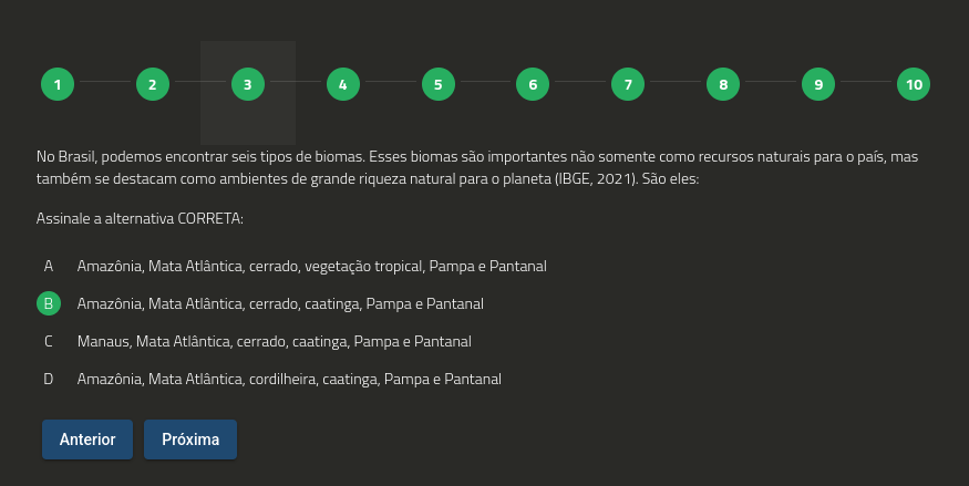 1 2 3 4 5 6 7 8 9 10 No Brasil, podemos encontrar seis tipos de biomas. Esses biomas são importantes não somente como recursos naturais para país, mas também se destacam como ambientes de grande riqueza natural para O planeta (IBGE, 2021). São eles: Assinale a alternativa CORRETA: A Amazônia, Mata Atlântica, cerrado, vegetação tropical, Pampa e Pantanal B Amazônia, Mata Atlântica, cerrado, caatinga, Pampa e Pantanal Manaus, Mata Atlântica, caatinga, Pampa e Pantanal D Amazônia, Mata Atlântica, cordilheira, caatinga, Pampa e Pantanal Anterior Próxima
