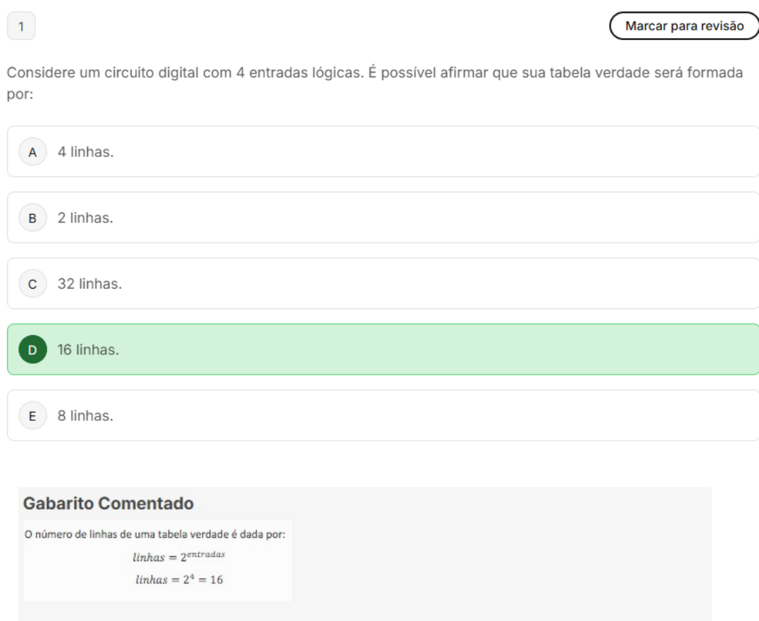 1 Marcar para revisão Considere um circuito digital com 4 entradas lógicas. É possível afirmar que sua tabela verdade será formada por: A 4 linhas. B 2 linhas. C 32 linhas. D 16 linhas. E 8 linhas. Gabarito Comentado o número de linhas de uma tabela verdade é dada por: linhas = linhas =2 Marcar para revisão Considere diagrama temporal da Figura abaixo. Sabendo que Temporizador está ajustado para operar no Modo 2 e com tempo de referência de 5 segundos, para que a saída seja acionada é possível afirmar que: OFF ON OFF ON OFF Habilitação t1=2s t2 Saída do Temporizador OFF ON OFF OFF ON OFF Reset A intervalo de tempo t2 seja igual a 3 segundos. B intervalo de tempo t2 seja igual a t1. C Que intervalo de tempo t2 seja menor que t1. Que intervalo de tempo t2 seja necessariamente maior ou igual a 5. D E Que intervalo de tempo t2 seja igual a 3 segundos e que a entrada reset seja acionada. Questão não respondida Opal A alternativa correta é a letra A. Confira o gabarito comentado! Gabarito Comentado De acordo com o programa temporizador operando no Modo 3 os dois intervalos de tempo (t1 e t2) precisam, juntos, atingirem tempo de referência (5 segundos) de acordo com a equação t=t1+t2.3 Marcar para revisão Um sistema industrial utiliza um controlador para controle de nível em um tanque de água. Para isso, uma bomba de água, um painel com 2 botões (1 normalmente aberto e 1 normalmente fechado) e uma chave de nível (normalmente fechada) são utilizados. É possível afirmar que a chave de nível a ser instalada para desligar a bomba quando um nível alto for atingido deve ser instalada: I01 i 02 Q01 001 Ligar Desligar Bomba M01 M01 002 Auxiliar Auxilia A Em paralelo com botão ligar. B Em série com o botão ligar e com botão desligar. C Substituindo o contato auxiliar. D Em paralelo com botão desligar. E Substituindo contato interno. Questão não respondida Opa! A alternativa correta é a letra B. Confira o gabarito comentado! Gabarito Comentado A chave de nível deverá ser conectada em série com os botões ligar e desligar, de maneira a cortar a alimentação da bomba quando o nível alto for atingido: I 01 i 02 i 03 Q01 001 Ligar Desligar Nivel Bomba M01 M01 002 Auxiliar Auxilia4 Marcar para revisão Observando programa em Ladder apresentado abaixo. Sobre código escrito pode-se afirmar que: I 01 M01 001 M02 M01 002 M01 02 M02 003 Q01 004 A Acionar apenas contato 101 não permite acionamento da saída Q01. B Acionar apenas o contato 102 permite acionamento da saída Q01. contato interno M01 pode ser removido por não apresentar utilidade para funcionamento do C programa. contato 101 permite acionar a saída Q01, através do contato interno M01, se 102 não estiver D acionado. E contato M02 permite desligar a carga Q01 colocando-a em condição de by-pass. Questão não respondida Opa! A alternativa correta é a letra D. Confira o gabarito comentado! Gabarito Comentado circuito apresentado no enunciado é uma alternativa ao contato por retenção. Nessa configuração, o contato 101 tem a capacidade de ligar a carga Q01 por meio do contato auxiliar M01. No entanto, isso só é possível se contato 102 não estiver acionado. Portanto, a alternativa D é a correta, pois descreve corretamente o funcionamento do programa em Ladder apresentado. contato M02, mencionado na alternativa E, não tem a função de desligar a carga Q01, mas sim de reter sistema, colocando 101 em by- pass.5 Marcar para revisão Considere a linha de programa da figura abaixo. Observando cuidadoamente programa, é possível afirmar que o contador utilizado foi parametrizado para operar no Modo: I01 C 01 0 C01 001 C01 Q01 002 A 1 B 2 C 0 D 3 E 4 Gabarito Comentado Observando com cuidado os parâmetros do bloco contador é possível afirmar que o mesmo está ajustado para operar no Modo 0.6 Marcar para revisão Considere diagrama elétrico da Figura abaixo. Uma expressão booleana que representa comportamento do circuito pode ser escrita como: A B C D E Gabarito Comentado Observando circuito elétrico da figura é possível perceber que as duas chaves apresentam um comportamento interdependente, ou seja, uma exerce influência na outra, devendo ser associadas em série. Contudo, seus comportamentos são opostos, devendo uma ser normalmente aberta e outra fechada.7 Marcar para revisão Um programa em Ladder foi elaborado com uso de um comparador. Nesse programa todas as vezes que uma entrada analógica Ax é inferior a uma entrada de referência, a saída é ligada. Assim, pode-se dizer que o comparador atua no Modo: G01 4 A01 U G01 001 G01 Q01 002 A 7 B 6 C 0 D 2 E 4 i Questão não respondida Opa! A alternativa correta é a letra E. Confira o gabarito comentado! Gabarito Comentado No Modo 4 a comparação entre uma entrada Ax e um valor de referência é realizado de acordo com a equação Re f> Ax. Sendo assim, quando o valor da entrada analógica fica abaixo do valor de referência a entrada é ligada8 Marcar para revisão Observe a linha de programa abaixo. De acordo com os parâmetros do bloco, pode-se afirmar que a base de tempo desse temporizador é igual a: I 01 T 01 1 3 0000 0010 T01 001 T 01 Q01 002 A 0,1s B 0,01s C 1min D 1s E 0,001s Gabarito Comentado Observando o bloco temporizador da linha de programa da Figura é possível verificar que a base de tempo é a 3, ou seja, 1 segundo.9 Marcar para revisão Observando circuito da figura abaixo, um programa em Ladder capaz de reproduzir esse comportamento seria: Q0 I1 I 01 I 02 Q01 A i 01 i 02 Q01 B i 01 Q01 C i 02 I 01 Q01 D I 01 i 02 Q01 E i Questão não respondida Opa! A alternativa correta é a letra E. Confira o gabarito comentado! Gabarito Comentado circuito da Questão anterior permite determinar a expressão booleana que leva ao programa em Ladder:10 Marcar para revisão Observe código desenvolvido em Ladder abaixo. É possível afirmar que resultado, quando bloco for habilitado, será igual a: I AS 01 00000 [ 00015 Nop 00035 00