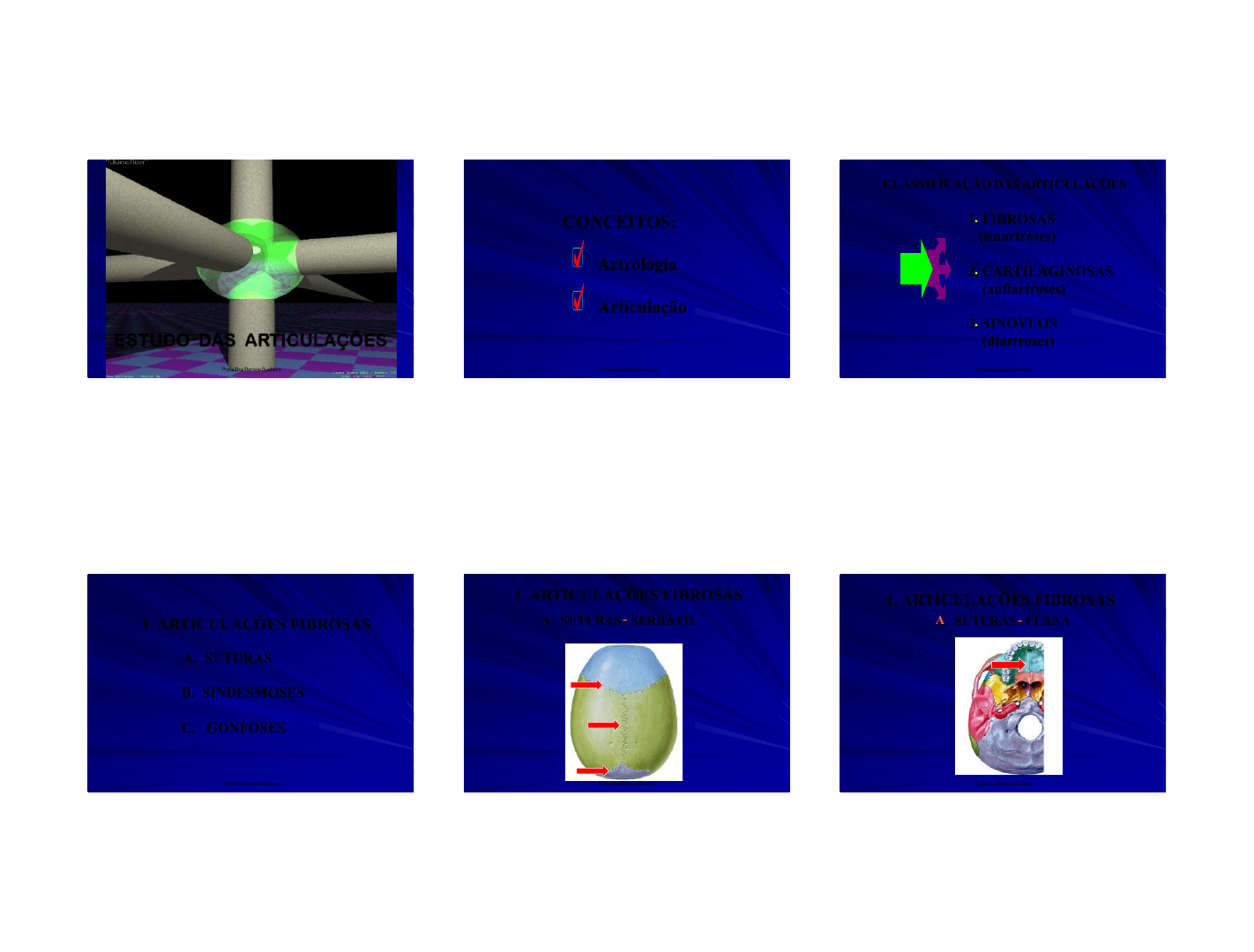 1 ESTUDO DAS ARTICULAÇÕES Profa.Dra.Daniela Buchaim CONCEITOS: Artrologia Articulação Profa.Dra.Daniela Buchaim CLASSIFICAÇÃO DAS ARTICULAÇÕES 1. FIBROSAS (sinartroses) 2. CARTILAGINOSAS (anfiartroses) 3. SINOVIAIS (diartroses) Profa.Dra.Daniela Buchaim 1. ARTICULAÇÕES FIBROSAS A. SUTURAS B. SINDESMOSES C. GONFOSES Profa.Dra.Daniela Buchaim 1. ARTICULAÇÕES FIBROSAS A. SUTURAS - SERRÁTIL Profa.Dra.Daniela Buchaim 1. ARTICULAÇÕES FIBROSAS A. SUTURAS - PLANA Profa.Dra.Daniela Buchaim 2 1. ARTICULAÇÕES FIBROSAS A. SUTURAS - ESCAMOSA Profa.Dra.Daniela Buchaim SINOSTOSE FONTANELA Profa.Dra.Daniela Buchaim 1. ARTICULAÇÕES FIBROSAS B. SINDESMOSES SUPERFÍCIES ÓSSEAS AFASTADAS TECIDO CONJUNTIVO Profa.Dra.Daniela Buchaim 1. ARTICULAÇÕES FIBROSAS C. GONFOSE Profa.Dra.Daniela Buchaim SINCONDROSE 2. ARTICULAÇÕES CARTILAGÍNEAS CARTILAGEM HIALINA COLÁGENO TIPO II Profa.Dra.Daniela Buchaim 2. ARTICULAÇÕES CARTILAGÍNEAS SÍNFISE FIBROCARTILAGEM COLÁGENO TIPO I Profa.Dra.Daniela Buchaim 3 3. ARTICULAÇÕES SINOVIAIS ELEMENTOS DE UMA ARTICULAÇÃO SINOVIAL Cápsula articular Superfície articular Cavidade articular Membrana sinovial Líquido sinovial Discos e Meniscos Ligamentos Profa.Dra.Daniela Buchaim MOVIMENTO DAS ARTICULAÇÕES SINOVIAIS Flexão e extensão Adução e abdução Rotação lateral (supinação) e medial (pronação) Circundação Profa.Dra.Daniela Buchaim ARTICULAÇÕES SINOVIAIS CLASSIFICAÇÃO QUANTO AOS EIXOS DE MOVIMENTO Monoaxiais Biaxiais Triaxiais Profa.Dra.Daniela Buchaim ARTICULAÇÕES SINOVIAIS PLANA GÍNGLIMO ou TROCLEAR TROCÓIDE Profa.Dra.Daniela Buchaim ARTICULAÇÕES SINOVIAIS SELAR CONDILAR COTÍLICA ou ESFERÓIDE Profa.Dra.Daniela Buchaim ARTICULAÇÕES SINOVIAIS PLANA SUPERFÍCIES PLANAS MOVIMENTO DESLIZAMENTO Profa.Dra.Daniela Buchaim 4 ARTICULAÇÕES SINOVIAIS GÍNGLIMO SUPERFÍCIES FORMA DE POLIA OU TRÓCLEA FLEXÃO E EXTENSÃO Profa.Dra.Daniela Buchaim ARTICULAÇÕES SINOVIAIS TROCÓIDE FORMA CILÍNDRICA ROTAÇÃO Profa.Dra.Daniela Buchaim ARTICULAÇÕES SINOVIAIS SELAR FORMA DE SELA BIAXIAL Profa.Dra.Daniela Buchaim ARTICULAÇÕES SINOVIAIS CONDILAR FORMA ELIPSÓIDE BIAXIAL Profa.Dra.Daniela Buchaim ARTICULAÇÕES SINOVIAIS ESFERÓIDE FORMA ESFÉRICA TRIAXIAL Profa.Dra.Daniela Buchaim Profa.Dra.Daniela Buchaim 5 Profa.Dra.Daniela Buchaim ARTICULAÇÃO SINOVIAL JOELHO Profa.Dra.Daniela Buchaim Referências: Profa.Dra.Daniela Buchaim 1.ANATOMIA HUMANA SISTÊMICA E SEGMENTAR Dangelo e Fattini Capítulo 3: Junturas Profa.Dra.Daniela Buchaim