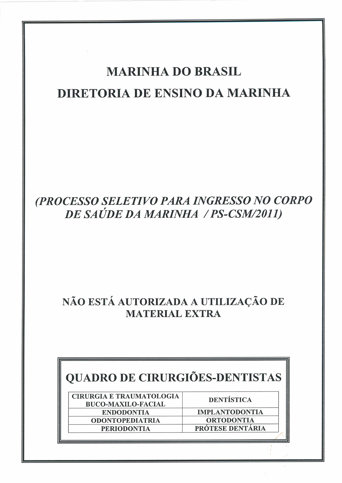 MARINHA DO BRASIL DIRETORIA DE ENSINO DA MARINHA (PROCESSO SELETIVO PARA INGRESSO NO CORPO DE SAÚDE DA MARINHA / PS-CSM/2011) NÃO ESTÁ AUTORIZADA A UTILIZAÇÃO DE MATERIAL EXTRA QUADRO DE CIRURGIA E TRAUMATOLOGIA DENTÍSTICA BUCO-MAXILO-FACIAL ENDODONTIA IMPLANTODONTIA ODONTOPEDIATRIA ORTODONTIA PERIODONTIA PRÓTESE DENTÁRIA1) Segundo Conceição et al. (2007) quais são os agentes indicados para tratamento de hipersensibilidade dentiná- ria? (A) Laser em alta potência, sistemas adesivos, oxalato de ferro e oxalato de potássio. (B) Oxalato de estanho, hidróxido de cálcio, sistemas ade- sivos e Laser em baixa potência. (C) Cloreto de cálcio, oxalato de potássio, Laser em alta potência e cimentos de ionômero de vidro. (D) Carbonato de potássio, verni- zes fluoretados e oxalato de estrôncio. (E) Laser em baixa potência, cloreto de estrôncio, bicarbo- nato de sódio e compostos fluoretados. 2) De acordo com Tetradis e Kantor, em White e Pharoah (2007) exame radiográfico extraoral em que uma subexposição é requerida para avaliar os arcos zigomáticos é a projeção (A) (B) Waters. (C) cefalométrica (D) Towne reversa. (E) Le Master. 3) Os sialolitos são estruturas calcificadas que se desenvolvem no interior do sistema ductal salivar. Seu prognóstico e forma de tratamento variam de acordo com tamanho e localização. Assinale a opção que NÃO corresponde à forma de tratamento empregada no quadro patológico em questão. (A) Os sialolitos pequenos das glândulas salivares maiores podem ser tratados de forma conservadora com massagem leves na glândula. (B) Os sialolitos pequenos não devem ser tratados com sialo- gogos e aumento da ingestão de líquidos. (C) O calor úmido pode ser utilizado como terapia adjuvante no tratamento de pequenos sialolitos. (D) Os grandes sialolitos requerem remoção cirúrgica. (E) A endoscopia da glândula salivar é um método útil na remoção de sialolitos das glândulas salivares maiores. Prova : Amarela Concurso : PS-CSM/11 Profissão : QUADRO DE 1/254) Segundo Anusavice em relação aos cimentos odontológicos, é correto afirmar que (A) material try-in que faz parte de alguns sistemas de cimentação adesiva, deve ser aplicado na superfície interna da restauração cerâmica imediatamente após condicionamento com ácido fluorídrico e tem a função de formar uma ligação química entre a cerâmica e cimento resinoso. (B) idealmente, a espessura máxima do filme de cimento em- pregado para cimentação de próteses é de 50 um (Especi- ficação n° 96 da (C) em relação aos cimentos de ionômero de vidro (CIV) tra- dicionais, os CIV modificados por resina (híbridos) apresentam maior translucidez, mesmo nível de liberação de fluoretos, maior resistência à tração diametral, menor módulo de elasticidade e maior contração após a presa. (D) os cimentos de óxido de zinco e eugenol do tipo IV apre- sentam menores partículas, que eleva a resistência e os indica para cimentação de longa duração, mente nos casos em que a sensibilidade dentinária é uma preocupação. (E) os Cermet são cimentos de ionômero de vidro que apresen- tam pó de vidro fundido às partículas de prata por meio de sinterização. A presença de metal implicou gran- de melhora das propriedades mecânicas, de modo que podem ser indicados para pequenas restaurações classe II em dentes permanentes, em função do baixo índice de fratu- ras. Prova : Amarela Concurso : PS-CSM/11 Profissão : QUADRO DE 2/255) De acordo com as normas do Ministério da Saúde (Brasil, 2006) sobre as condutas após acidente com material perfuro cortante, é correto afirmar que (A) nos acidentes de alto risco para HBV, a quimioprofilaxia pode ser iniciada até uma a duas semanas depois do aci- dente. (B) em casos extremos, as quimioprofilaxias contra HBV e HIV podem ser iniciadas até 48 horas após acidente. (C) uso tópico de anti-sépticos tópicos do tipo PVPI ou álcool 70% sobre local da ferida não deve ser adotado, sendo recomendada a utilização de agentes cáusticos ou de anti-sépticos. (D) se paciente-fonte for positivo para hepatite B (HbsAg positivo) e funcionário acidentado for vacinado, deve- se fazer imunoglobulina (Centro de Referência de Imuno- biológico) e realizar dose de reforço da vacinação. (E) profissional acidentado deverá se submeter à coleta de sangue para acompanhamento sorológico mesmo se paci- ente-fonte for negativo para HIV, Hepatite B e C. 6) Coloque falso (F) ou verdadeiro (V) em relação aos critérios que devem ser observados na administração de medicamentos por via parenteral, através de ou infusão. ( ) Os medicamentos devem ser estéreis. ( ) Os medicamentos devem ser apirogênicos. ( ) Os medicamentos devem ser isotônicos. ( ) Os medicamentos devem possuir compostos microparticu- lados. ( ) Os solutos e solventes devem apresentar elevada pureza química. Assinale a opção que apresenta a sequência correta. (A) (V) (F) (V) (V) (V) (B) (V) (F) (F) (V) (F) (C) (F) (V) (F) (V) (F) (D) (V) (V) (V) (F) (V) (E) (V) (V) (V) (V) (V) Prova : Amarela Concurso : PS-CSM/11 Profissão : QUADRO DE 3/257) regime indicado para profilaxia antibiótica para prevenção de endocardites bacterianas, em pacientes pediátricos com alergia à penicilina, segundo Ministério da Saúde (Brasil, 2006) é (A) cefalexina, 20 mg/kg de peso, via oral, 1 h antes do procedimento. (B) clindamicina, 50 mg/kg de peso, via oral, 1 h antes do procedimento. (C) ampicilina, 20 mg/kg de peso, via oral, 1 h antes do procedimento. (D) cefazolina, 50 mg/kg de peso, via oral, 1 h antes do procedimento. (E) azitromicina ou claritromicina, 15 mg/kg de peso, via oral, 1 h antes do procedimento. 8) De acordo com Quirynen, Teughels, Haake e Newman, em Carranza et al. (2007) dentre os inúmeros fatores de virulência do Actinobacillus actinomycetemcomitans qual, especialmente, possui um papel significativo na sua patoge- nicidade? (A) Endotoxina. (B) Leu