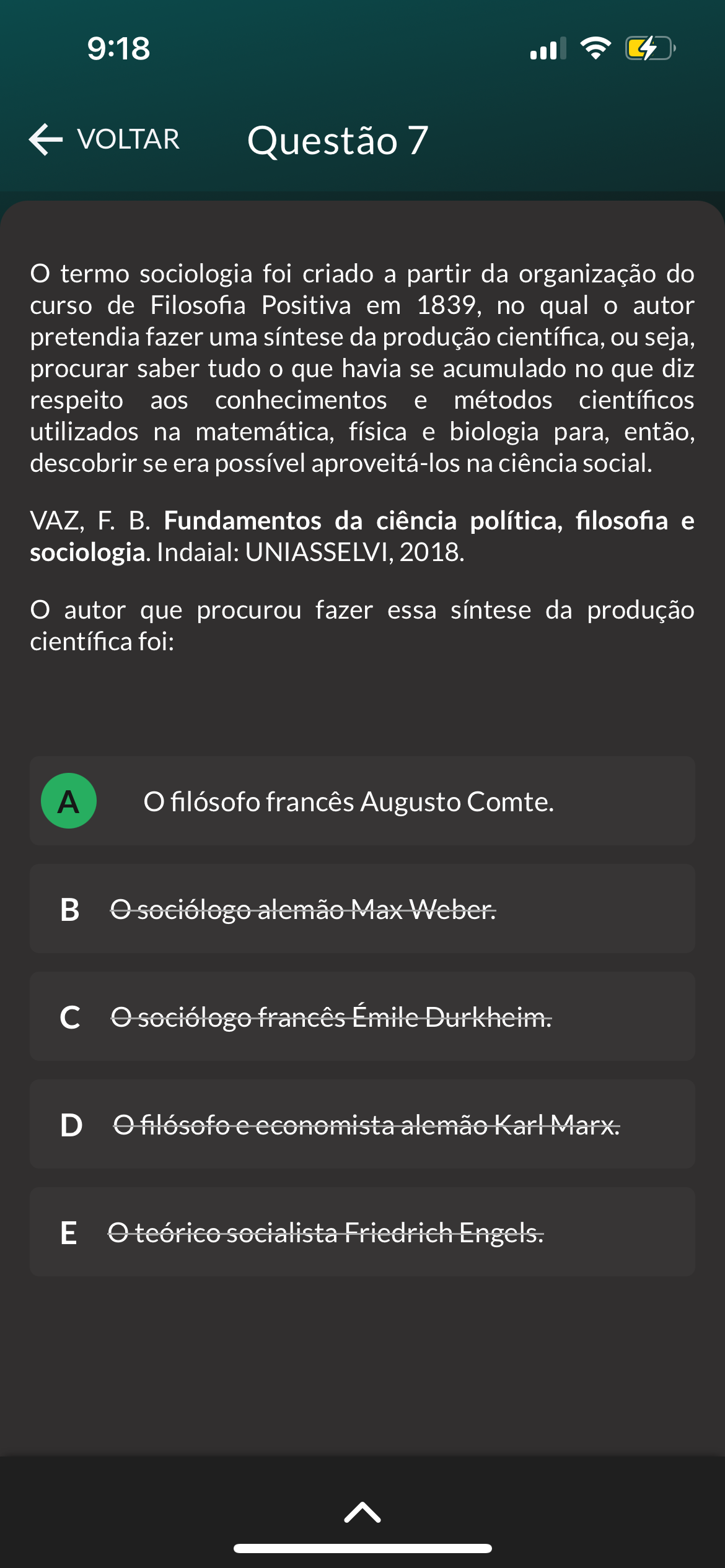 9:18 VOLTAR Questão 7 O termo sociologia foi criado a partir da organização do curso de Filosofia Positiva em 1839, no qual autor pretendia fazer uma síntese da produção científica, ou seja, procurar saber tudo que havia se acumulado no que diz respeito aos conhecimentos e métodos científicos utilizados na matemática, física e biologia para, então, descobrir se era possível aproveitá-los na ciência social. VAZ, F. B. Fundamentos da ciência política, filosofia e sociologia. Indaial: UNIASSELVI, 2018. O autor que procurou fazer essa síntese da produção científica foi: A O filósofo francês Augusto Comte. B sociólogo alemão Max Weber. C sociólogo francês Émile Durkheim. D filósofo e economista alemão Karl Marx. E teórico socialista Friedrich Engels.