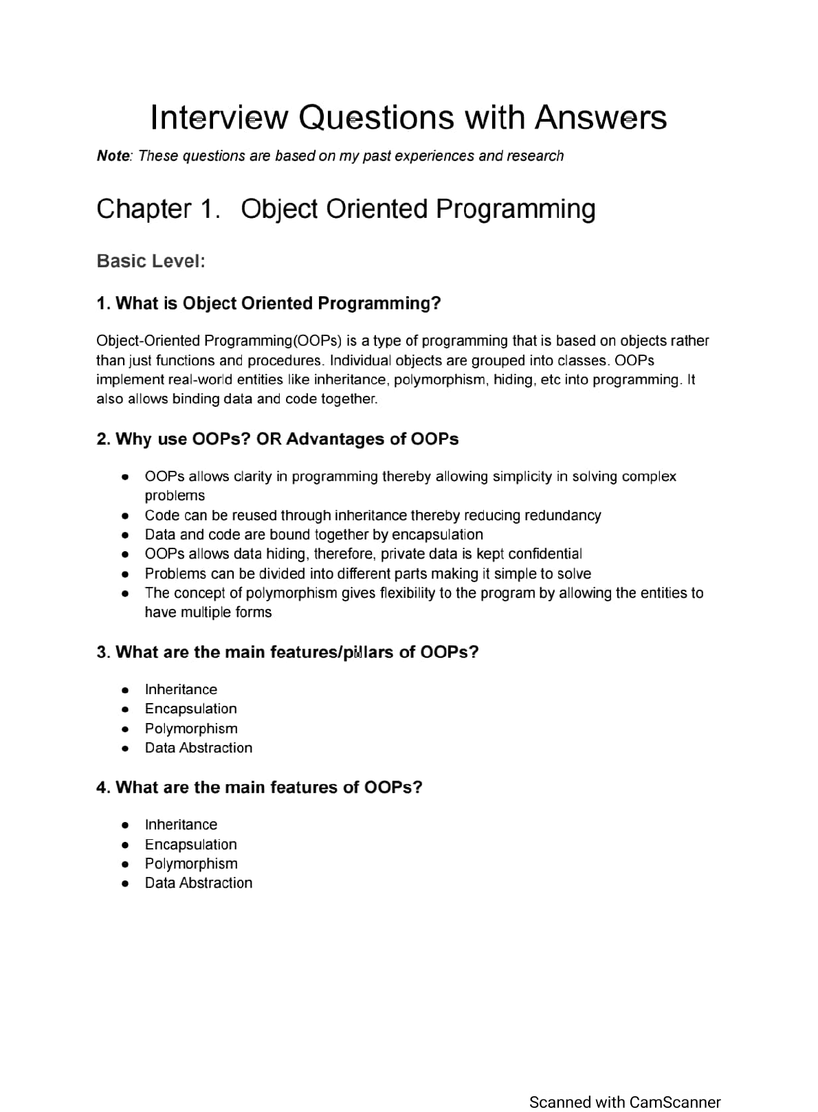 Interview Questions with Answers Note: These questions are based on my past experiences and research Chapter 1. Object Oriented Programming Basic Level: 1. What is Object Oriented Programming? Object-Oriented Programming(OOPs) is a type of programming that is based on objects rather than just functions and procedures. Individual objects are grouped into classes. OOPs implement real-world entities like inheritance, polymorphism, hiding, etc into programming. It also allows binding data and code together. 2. Why use OOPs? OR Advantages of OOPs OOPs allows clarity in programming thereby allowing simplicity in solving complex problems Code can be reused through inheritance thereby reducing redundancy Data and code are bound together by encapsulation OOPs allows data hiding, therefore, private data is kept confidential Problems can be divided into different parts making it simple to solve The concept of polymorphism gives flexibility to the program by allowing the entities to have multiple forms 3. What are the main features/pillars of OOPs? Inheritance Encapsulation Polymorphism Data Abstraction 4. What are the main features of OOPs? Inheritance Encapsulation Polymorphism Data Abstraction Scanned with CamScanner5. What is a class? A class is a prototype that consists of objects in different states and with different behaviors. It has a number of methods that are common to the objects present within that class. 6. What is an object? An object is a real-world entity which is the basic unit of OOPs for example chair, cat, dog, etc. Different objects have different states or attributes, and behaviors. Note: Class is a concept and to map this concept in real life is an object. 7. What is the difference between a class and a structure? Class: User-defined blueprint from which objects are created. It consists of methods or sets of instructions that are to be performed on the objects. Structure: A structure is basically a user-defined collection of variables which are of different data types. 8. Can you call the base class method without creating an instance? Yes, you can call the base class without instantiating it if: It is a static method The base class is inherited by some other subclass Object Class A class is basically a template or a blueprint A real-world entity which is an instance of a class within which objects can be created Binds methods and data together into a single An object acts like a variable of the class unit An object is a physical entity A class is a logical entity Objects take memory space when they are A class does not take memory space when created created Objects can be declared as and when required Classes are declared just once 9. What is inheritance? Inheritance is a feature of OOPs which allows classes to inherit common properties from other classes. For example, if there is a class such as other classes like 'car', 'bike', etc can inherit common properties from the vehicle class. This property helps you get rid of redundant code thereby reducing the overall size of the code. Scanned with CamScanner9. What are the different types of inheritance? Single inheritance Multiple inheritance Multilevel inheritance Hierarchical inheritance Hybrid inheritance 10. What is the difference between multiple and multilevel inheritance? Multiple Inheritance Multilevel Inheritance Multilevel inheritance means a class inherits Multiple inheritance comes into picture when a from another class which itself is a subclass of class inherits more than one base class some other base class Example: A class describing a sports car will Example: A class defining a child inherits from inherit from a base class Car which inturn two base classes Mother and Father inherits another class Vehicle 11. What is hierarchical inheritance? Hierarchical inheritance refers to inheritance where one base class has more than one subclass. For example, the vehicle class can have 'car', 'bike', etc as its subclasses. 12. What are the limitations of inheritance? Increases the time and effort required to execute a program as it requires jumping back and forth between different classes The parent class and the child class get tightly coupled Any modifications to the program would require changes both in the parent as well as the child class Needs careful implementation else would lead to incorrect results. 13. What is a superclass? A superclass or base class is a class that acts as a parent to some other class or classes. For example, the Vehicle class is a superclass of class Car. 14. What is a subclass? A class that inherits from another class is called the subclass. For example, the class Car is a subclass or a derived of Vehicle class. 15. What is polymorphism? Polymorphism refers to the ability to exist in multiple forms. Multiple definitions can be given to a single interface. For example, if you have a class named Vehicle, it can have a method named Scanned with CamScannerspeed but you cannot define it because different vehicles have different speeds. This method will be defined in the subclasses with different definitions for different vehicles. 16. What is static polymorphism? Static polymorphism (static binding) is a kind of polymorphism that occurs at compile time. An example of compile-time polymorphism is method overloading. 17. What is dymamic polymorphism? Runtime polymorphism or dynamic polymorphism (dynamic binding) is a type of polymorphism which is resolved during runtime. An example of runtime polymorphism is method overriding. 18. What is function/method overloading? Method overloading is a feature of OOPs which makes it possible to give the same name to more than one method within a class if the arguments passed differ. 19. What is function/method overriding? Method overriding is a feature of OOPs by which the child class or the subclass can redefine methods present in the base class or parent class. Here, the method that is overridden has the same name as well as the signature meaning the argume