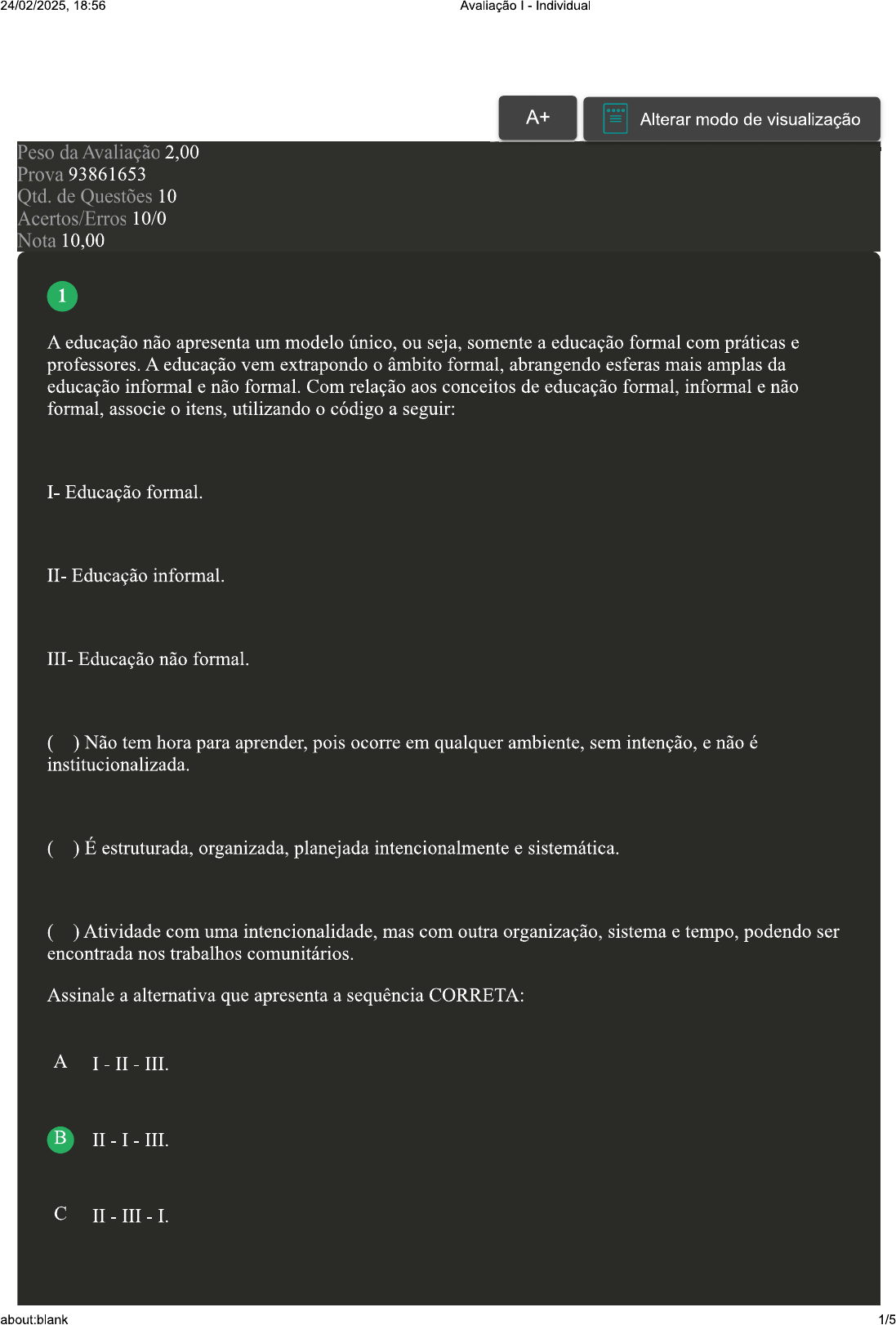 24/02/2025, 18:56 Avaliação Individual A+ Alterar modo de visualização Peso da Avaliação 2,00 Prova 93861653 Qtd. de Questões 10 Acertos/Erros 10/0 Nota 10,00 1 A educação não apresenta um modelo único, ou seja, somente a educação formal com práticas e professores. A educação vem extrapondo âmbito formal, abrangendo esferas mais amplas da educação informal e não formal. Com relação aos conceitos de educação formal, informal e não formal, associe itens, utilizando código a seguir: I- Educação formal. II- Educação informal. III- Educação não formal. ( ) Não tem hora para aprender, pois ocorre em qualquer ambiente, sem intenção, e não é institucionalizada ( ) É estruturada, organizada, planejada intencionalmente e sistemática. ( ) Atividade com uma mas com outra organização, sistema e tempo, podendo ser encontrada nos trabalhos comunitários. Assinale a alternativa que apresenta a sequência CORRETA: A I - II III. B II I - III. C II - III - I. about:blank 1/524/02/2025, 18:56 Avaliação Individual D III I II. 2 Pesquisas na área da educação apontam para a questão do preconceito entre gêneros e raças e sua influência no desempenho escolar, bem como na formação da identidade do aluno. Nesse sentido, é necessário cuidado com as ações do profissional da educação, em especial aquele que está diariamente com aluno, colaborando (positivamente ou não) para a construção de sua identidade. Essa identidade implica uma relação com as diferenças. Com relação às práticas que favorecem a diversidade, classifique V para as sentenças verdadeiras e F para as falsas: ( Práticas que valorizem a diversidade estão pautadas em uma concepção de valores humanos, que primam pela cidadania, em busca do respeito às etnias e suas diferenças culturais. ( ) Falar do respeito à diversidade por si só não resolve, pois as atitudes manifestadas e a forma de agir do professor terão maior influência na formação do aluno. A coerência entre a prática e discurso sobre a valorização da diversidade pouco implicam na formação do aluno. Assinale a alternativa que apresenta a sequência CORRETA: A F F B D 3 A terminologia da palavra aldeia global é um dos problemas da diversidade cultural, pois entende-se que significa juntar ideologias. São interesses fortemente econômicos ao consumo de recursos tecnológicos que vendem a ideia de aproximação, mas que na realidade é uma outra forma de exclusão, uma vez que ainda não é a maioria das pessoas tem acesso limitado à tecnologia. Sobre exposto, assinale a alternativa CORRETA: A Um mercado globalizado, sendo apresentado por diferentes culturas, e as diferenças não são profundas, que vem ao desencontro com as diferenças. B Um mercantilismo assustador no contexto das tecnologias apresentado como capaz de unir, quando na verdade, as diferenças não são profundas. Um mercado avassalador dito global é apresentado como capaz de homogeneizar planeta quando, na verdade, as diferenças locais são aprofundadas. D Há uma busca de uniformidade ao serviço dos atores hegemônicos, mas mundo se torna menos unido. As diferenças não são valorizadas. 4 Um dos desafios da diversidade é de educar aluno na cidadania, em um contexto plural, que é a escola. Nesse sentido, educador deve saber conduzir situações em que não haja espaço para preconceito ou qualquer tipo de discriminação. Para tal, cabe ao professor assumir uma postura condizente a sua formação. Sobre a postura que professor deve ter para colaborar para um ambiente diverso e plural, analise as sentenças a seguir: about:blank 2/524/02/2025, 18:56 Avaliação Individual I- Valorizar a ética e respeito ao próximo. II- Envolver a multiculturalidade na interdependência com meio ambiente e a criação de espaço. III- Estar predisposta a manter distância social de outros grupos. Assinale a alternativa CORRETA: A As sentenças I e III estão corretas. B Somente a sentença III está correta. C Somente a sentença I está correta. D As sentenças I e II estão corretas. 5 Vivemos num país constituído com base na diversidade, contemplada não só na diferença cultural como na própria natureza e clima, que de alguma maneira demonstram uma identidade própria. Podemos, então, compreender a diversidade no seu sentido individual e coletivo. Sobre a diversidade e sua expressão na sociedade, assinale a alternativa CORRETA: A A diversidade é um conjunto de culturas iguais, refletidas no sistema educativo, político e governamental. A B diversidade cultural é reconhecida de acordo com seus significados existentes na cultura, seja por meio da arte e da religião, mas pouco expressa contexto individual. C A diversidade é representada pelas diferenças culturais, características físicas e de valores, porém sujeito pouco sofre influência de sua cultura. D A diversidade expressa de sua maneira a cultura, ou seja, as diferentes formas de ser, de aprender, de representar e de utilizar conhecimento. 6 A educação é a apropriação da cultura, e através da história se torna a construtora do sujeito histórico. Nessa direção, a realização do indivíduo como sujeito histórico distingue sua conexão com a coletividade e seu acordo com a mudança social (HANZE, 2017). Deve-se pensar numa educação centrada no indivíduo e, ao mesmo tempo, levando em consideração as relações e as interconexões recíprocas que ocorrem entre os diferentes sujeitos. Sobre exposto, assinale a alternativa CORRETA: FONTE: HAMZE; Amélia. Sujeito histórico. 2017. Disponível em: Acesso em: 18 out. 2017. A A educação deve envolver sujeito numa dimensão individual, desconsiderando a repercussão da ação coletiva sobre sujeito. B A educação deve decorrer das interações produzidas entre sujeito individual e objeto. A educação deve reconhecer a existência de uma dimensão individual e, ao mesmo tempo, coletiva, dinâmica, sistêmica e aberta entr