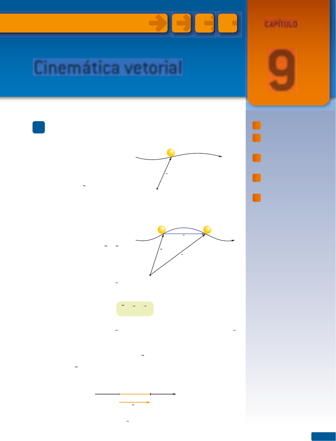 CAPÍTULO 9Cinemática vetorial Cinemática vetorial 161 1. Vetor deslocamento 2. Velocidade vetorial média 3. Velocidade vetorial instantânea 4. Aceleração vetorial média 5. Aceleração vetorial instantânea 1. Vetor deslocamento Consideremos uma partícula mo- vendo-se em uma trajetória qualquer. Na Cinemática escalar determinamos a posição da partícula pela sua abscissa s; na Cinemática vetorial determina- mos a posição da partícula através de seu vetor posição p (fi g. 1). O vetor posição da partícula, em um instante t, é um vetor que tem origem em um ponto O (arbitrariamente escolhido) e extremidade no ponto onde se encon- tra a partícula. Sejam s 1 e s 2 as abscissas da par- tícula nos instantes t 1 e t 2 , respectiva- mente (com t 2 > t 1 ), e sejam p 1 e p 2 os vetores posição da partícula nos mes- mos instantes. Na Cinemática escalar defi nimos a variação de abscissa Δs por Δs = s 2 – s 1 . Na Cinemática vetorial de- fi nimos o vetor deslocamento (d ) da partícula entre os instantes t 1 e t 2 por: d = p 2 – p 1 isto é, o vetor deslocamento é o vetor representado pelo segmento orientado cuja origem é a extremidade do vetor p 1 e cuja extremidade é a extremidade do vetor p 2 (fi g. 2). Observando a fi gura 2, percebemos que: |Δs| ⩾ |d| O caso |Δs| = |d| ocorre quando a trajetória é retilínea (fi g. 3) ou quando Δs = 0. p O s t Figura 1. d Δs p 1 p 2 O s 1 t 1 t 2 s 2 Figura 2. d s 1 s 2 Δs Figura 3. Quando a trajetória é retilínea, temos |Δs| = |d|. IL u ST R A ç õ eS : ZA PT Capítulo 9162 2. Velocidade vetorial média Na Cinemática escalar, definimos a velocidade escalar média v m por: v m = Δs Δt Na Cinemática vetorial, definimos a velocidade vetorial média v m por: v m = d Δt Como Δt > 0, o vetor v m deve ter a mesma direção e o mesmo sentido de d (fig. 4), desde que d ≠ 0. Vimos no item anterior que: |Δs| ⩾ |d| Dividindo os dois membros por Δt, obtemos: |Δs| Δt ⩾ |d| Δt ou: |v m | ⩾ |v m | isto é: O módulo da velocidade escalar média é maior ou igual ao módulo da velocidade vetorial média, num mesmo intervalo de tempo. v m d Figura 4. Exercícios de Aplicação 1. Uma partícula move-se sobre uma superfície plana horizontal. Ela parte de um ponto A, move- se 3,0 m para o norte, em trajetória retilínea, e, em seguida, move-se 4,0 m para o leste, também em trajetória retilínea, gastando 10 segundos nessa viagem. Calcule os módulos: a) da distância percorrida; b) do vetor deslocamento; c) da velocidade escalar média; d) da velocidade vetorial média. Resolu•‹o: a) A partícula sai do ponto A (veja a figura) e move-se 3,0 m para o norte, atingindo o ponto B. A seguir move-se 4,0 m para o leste, atingindo o ponto C. B A C 4,0 m 3,0 m v m d LO N S |Δs| = 3,0 + 4,0 |Δs| = 7,0 m b) |d|2 = (3,0)2 + (4,0)2 = 25 |d| = 5,0 m c) |v m | = |Δs| Δt = 7,0 10 |v m | = 0,70 m/s d) |v m | = |d| Δt = 5,0 10 |v m | = 0,50 m/s 2. Uma partícula move-se em linha reta com veloci- dade escalar constante e igual a 5,0 m/s. Para um intervalo de tempo Δt = 4,0 segundos, calcule os módulos: Cinemática vetorial 163 a) da distância percorrida; b) do vetor deslocamento; c) da velocidade escalar média; d) da velocidade vetorial média. 3. Uma partícula move-se com velocidade escalar constante sobre uma circunferência de raio R = 20 m, gastando 12 segundos para completar uma volta. Para um intervalo de tempo Δt = 2,0 s, calcule os módulos: a) da distância percorrida; b) do vetor deslocamento; c) da velocidade escalar média; d) da velocidade vetorial média. Exercícios de Reforço 4. (UF-MA) Partindo de um ponto A (figura a seguir) um menino anda, passando pelos pontos B, C, D, B e E, onde para. C 20 m 20 m 40 m40 m 30 m 30 m D E B A O caminho percorrido e o módulo do vetor deslo- camento são, respectivamente, iguais a: a) 150 m e 30 m d) 160 m e 30 m b) 150 m e 20 m e) 180 m e 20 m c) 160 m e 20 m 5. Uma partícula tem trajetória circular de raio R = 2,0 m. Num certo intervalo de tempo Δt, a partícula executa um quarto de volta. Para esse intervalo de tempo calcule o módulo do vetor deslocamento. 6. Uma partícula percorreu em dois segundos a tra- jetória ABCD da figura a seguir. 1 cm C D BA 1 cm Para esse percurso calcule os módulos da: a) velocidade escalar média; b) velocidade vetorial média. 7. Uma pedra é lançada verticalmente para cima, a partir do solo, com velocidade ini- cial 40 m/s, num local onde g = 10 m/s2. Calcule o módulo da velocidade vetorial média da pedra para o intervalo de tempo que vai do instante de lançamento até o instante em que a pedra volta ao solo. 3. Velocidade vetorial instantânea Na Cinemática escalar definimos a velocidade escalar instantânea (v) por: v = lim Δt→0 Δs Δt Agora definiremos a velocidade vetorial instant‰nea (v) por: v = lim Δt→0 d Δt Assim, se quisermos calcular a velocidade vetorial instantânea de uma partícula quando esta passa por um ponto P, devemos tomar outro ponto Q da trajetória, de- Capítulo 9164 v 2 v 1 |v 1 | = |v 2 |, mas v 1 ≠ v 2 Figura 8. terminar o deslocamento entre P e Q e fazer Q tender a P. Mas é fácil perceber que quando isso ocorre (fig. 5) a direção de d aproxima-se da direção da reta tangente à trajetória no ponto P. Portanto, a direção da velocidade vetorial instantânea é a da tangente à trajetória no ponto considerado (fig. 6). O sentido será o mesmo do movimento. Outro fato importante é que, para Δt → 0, teremos |Δs| → |d|. Assim: lim Δt→0 |Δs| Δt = lim Δt→0 |d| Δt ou |v| = |v|, isto é: O módulo da velocidade vetorial instantânea é igual ao módulo da velocidade escalar instantânea. Lembremos que para as velocidades médias a conclusão é diferente (como vimos no item anterior): |v m | ⩾ |v m | Resumindo: A velocidade vetorial instantânea tem as seguintes características: • direção: a reta tangente à trajetória no ponto considerado; • sent