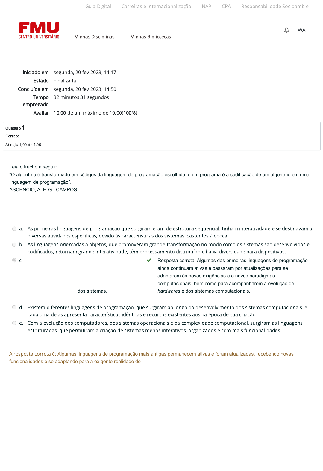 Iniciado em segunda, 20 fev 2023, 14:17 Estado Finalizada Concluída em segunda, 20 fev 2023, 14:50 Tempo empregado 32 minutos 31 segundos Avaliar 10,00 de um máximo de 10,00(100%) Questão 1 Correto Atingiu 1,00 de 1,00 Leia o trecho a seguir: “O algoritmo é transformado em códigos da linguagem de programação escolhida, e um programa é a codificação de um algoritmo em uma linguagem de programação”. ASCENCIO, A. F. G.; CAMPOS, E. A. V. Fundamentos da Programação de Computadores: algoritmos, Pascal, C/C++ (padrão ANSI) e Java. 3. ed. São Paulo: Person Education do Brasil, 2012. p. 1. Considerando as informações apresentadas e o conteúdo estudado, assinale a alternativa correta no que se refere à linguagem de programação. a. As primeiras linguagens de programação que surgiram eram de estrutura sequencial, tinham interatividade e se destinavam a diversas atividades específicas, devido às características dos sistemas existentes à época. b. As linguagens orientadas a objetos, que promoveram grande transformação no modo como os sistemas são desenvolvidos e codificados, retornam grande interatividade, têm processamento distribuído e baixa diversidade para dispositivos. c. Algumas linguagens de programação mais antigas permanecem ativas e foram atualizadas, recebendo novas funcionalidades e se adaptando para a exigente realidade de avanços no desempenho de hardware e exigências dos sistemas. Resposta correta. Algumas das primeiras linguagens de programação ainda continuam ativas e passaram por atualizações para se adaptarem às novas exigências e a novos paradigmas computacionais, bem como para acompanharem a evolução de hardwares e dos sistemas computacionais. d. Existem diferentes linguagens de programação, que surgiram ao longo do desenvolvimento dos sistemas computacionais, e cada uma delas apresenta características idênticas e recursos existentes aos da época de sua criação. e. Com a evolução dos computadores, dos sistemas operacionais e da complexidade computacional, surgiram as linguagens estruturadas, que permitiram a criação de sistemas menos interativos, organizados e com mais funcionalidades. A resposta correta é: Algumas linguagens de programação mais antigas permanecem ativas e foram atualizadas, recebendo novas funcionalidades e se adaptando para a exigente realidade de avanços no desempenho de hardware e exigências dos sistemas. Guia Digital Carreiras e Internacionalização NAP CPA Responsabilidade Socioambiental Minhas Disciplinas Minhas Bibliotecas WA 26/02/25, 14:22 Atividade 2 (A2): Revisão da tentativa https://ambienteacademico.com.br/mod/quiz/review.php?attempt=1768336&cmid=756258 1/9 https://codely-fmu-content.s3.amazonaws.com/Moodle/GuiaDigital/Guia+digital/index.html https://carreiras.fmu.br/ https://codely-fmu-content.s3.amazonaws.com/Moodle/NAP/inicial/nap/fmu/index.html https://codely-fmu-content.s3.amazonaws.com/Moodle/CPA/landing_CPA/index.html https://portal.fmu.br/sustentabilidade https://ambienteacademico.com.br/ https://ambienteacademico.com.br/ https://ambienteacademico.com.br/course/view.php?id=236 Questão 2 Correto Atingiu 1,00 de 1,00 Leia o trecho a seguir: “Os tipos primitivos básicos que são utilizados na construção de algoritmos são quatro”. FORBELLONE, A. L. V. Lógica de Programação: a construção de algoritmos e estruturas de dados. 3. ed. São Paulo: Prentice Hall, 2005. p. 14. Considerando as informações apresentadas e os conteúdos estudados, assinale a alternativa que apresenta os quatro tipos primitivos básicos utilizados na construção do algoritmo. a. Caractere, real, inteiro e byte. b. Real, caractere, lógico e booleano. c. Inteiro, real, byte e lógico. d. Inteiro, real, caractere e lógico. Resposta correta. Os quatro tipos primitivos básicos utilizados na construção de algoritmos são: inteiro, real, caractere e lógico. e. Booleano, fracionário, byte e inteiro. A resposta correta é: Inteiro, real, caractere e lógico. Guia Digital Carreiras e Internacionalização NAP CPA Responsabilidade Socioambiental Minhas Disciplinas Minhas Bibliotecas WA 26/02/25, 14:22 Atividade 2 (A2): Revisão da tentativa https://ambienteacademico.com.br/mod/quiz/review.php?attempt=1768336&cmid=756258 2/9 https://codely-fmu-content.s3.amazonaws.com/Moodle/GuiaDigital/Guia+digital/index.html https://carreiras.fmu.br/ https://codely-fmu-content.s3.amazonaws.com/Moodle/NAP/inicial/nap/fmu/index.html https://codely-fmu-content.s3.amazonaws.com/Moodle/CPA/landing_CPA/index.html https://portal.fmu.br/sustentabilidade https://ambienteacademico.com.br/ https://ambienteacademico.com.br/ https://ambienteacademico.com.br/course/view.php?id=236 Questão 3 Correto Atingiu 1,00 de 1,00 Leia o trecho a seguir: “A tabela verdade é o conjunto de todas as possibilidades combinatórias entre os valores de diversas variáveis ou expressões lógicas em função do operador lógico utilizado que se encontram em duas possíveis situações, verdadeiro ou falso sendo uma ferramenta muito utilizada para facilitar a análise da combinação de expressões e variáveis”. FORBELLONE, A. L. V. Lógica de Programação: a construção de algoritmos e estruturas de dados. 3. ed. São Paulo: Prentice Hall, 2005. p. 23. Considere a tabela verdade apresentada a seguir e assinale a sequência correta que corresponde à tabela com os valores verdade de x, y, z e t. Conceitue que V é utilizado para proposição verdadeira e F para proposição falsa. A B não A ou B V V x V F y F V z F F t Fonte: Elaborada pelo autor. a. V, F, F, F. b. F, V, V, V. c. V, F, V, V. Resposta correta. A (V) e B (V), não A ou B fica falso ou verdadeiro que resulta em verdadeiro. A (F) e B (V), não A ou B fica verdadeiro ou verdadeiro que resulta em verdadeiro. A (F) e B (F), não A ou B fica verdadeiro ou falso que prevalece verdadeiro. d. F, V, F, F. e. F, V, V, F. A resposta correta é: V, F, V, V. Guia Digital Carreiras e In