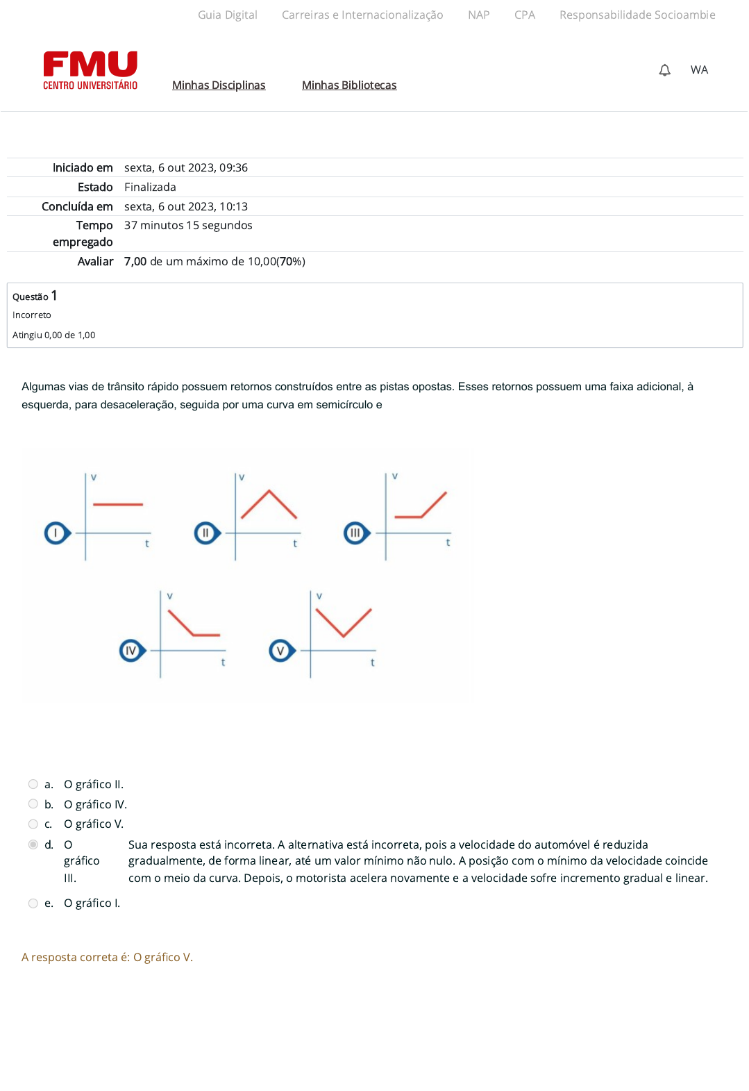Iniciado em sexta, 6 out 2023, 09:36 Estado Finalizada Concluída em sexta, 6 out 2023, 10:13 Tempo empregado 37 minutos 15 segundos Avaliar 7,00 de um máximo de 10,00(70%) Questão 1 Incorreto Atingiu 0,00 de 1,00 Algumas vias de trânsito rápido possuem retornos construídos entre as pistas opostas. Esses retornos possuem uma faixa adicional, à esquerda, para desaceleração, seguida por uma curva em semicírculo e, após, uma faixa de aceleração antes que os motoristas retornem à via na pista oposta. Considere que um motorista imprima somente aceleração ou desaceleração de módulo constante durante o retorno e analise os gráficos a seguir: Fonte: O autor O gráfico que melhor representa a velocidade que o automóvel produz durante a passagem pelo retorno é: a. O gráfico II. b. O gráfico IV. c. O gráfico V. d. O gráfico III. Sua resposta está incorreta. A alternativa está incorreta, pois a velocidade do automóvel é reduzida gradualmente, de forma linear, até um valor mínimo não nulo. A posição com o mínimo da velocidade coincide com o meio da curva. Depois, o motorista acelera novamente e a velocidade sofre incremento gradual e linear. e. O gráfico I. A resposta correta é: O gráfico V. Guia Digital Carreiras e Internacionalização NAP CPA Responsabilidade Socioambiental Minhas Disciplinas Minhas Bibliotecas WA 26/02/25, 14:55 N2 (A5): Revisão da tentativa https://ambienteacademico.com.br/mod/quiz/review.php?attempt=3026610&cmid=1071880 1/10 https://codely-fmu-content.s3.amazonaws.com/Moodle/GuiaDigital/Guia+digital/index.html https://carreiras.fmu.br/ https://codely-fmu-content.s3.amazonaws.com/Moodle/NAP/inicial/nap/fmu/index.html https://codely-fmu-content.s3.amazonaws.com/Moodle/CPA/landing_CPA/index.html https://portal.fmu.br/sustentabilidade https://ambienteacademico.com.br/ https://ambienteacademico.com.br/ https://ambienteacademico.com.br/course/view.php?id=236 Questão 2 Incorreto Atingiu 0,00 de 1,00 Psicólogos criaram o conceito "Curva de Aprendizagem”. Essa curva é descrita como uma relação que determina o rendimento crescente de um indivíduo em uma determinada atividade em função do seu tempo em treinamento ou experiência. A expressão matemática desse conceito é do tipo , em que A e k são valores constantes. A curva da função Q(t) possui a forma gráfica evidenciada na seguinte figura: Fonte: Elaborada pelo autor. A partir do exposto, analise as asserções a seguir e a relação proposta entre elas. I. O valor de k reflete a eficiência da aprendizagem/experiência. Porque: II. O valor de A possui relação com a complexidade da tarefa. A seguir, assinale a alternativa correta. a. As asserções I e II são proposições verdadeiras, e a II é uma justificativa correta da I. Sua resposta está incorreta. A alternativa está incorreta, pois o valor de k implica a velocidade de aproximação da curva em relação ao rendimento máximo e, portanto, a eficiência do treinamento ou a habilidade de aprendizagem da pessoa. Se , isso implica diferenças no rendimento do indivíduo no início da atividade e, portanto, da complexidade inerente à tarefa. Apesar de os valores A e k serem expressos no mesmo termo da função, eles não possuem dependência ou relação entre si. b. A asserção I é uma proposição verdadeira, e a asserção II é uma proposição falsa. c. A asserção I é uma proposição falsa, e a II é uma proposição verdadeira. d. As asserções I e II são proposições falsas. e. As asserções I e II são proposições verdadeiras, mas a II não é uma justificativa correta da I. A resposta correta é: As asserções I e II são proposições verdadeiras, mas a II não é uma justificativa correta da I. Guia Digital Carreiras e Internacionalização NAP CPA Responsabilidade Socioambiental Minhas Disciplinas Minhas Bibliotecas WA 26/02/25, 14:55 N2 (A5): Revisão da tentativa https://ambienteacademico.com.br/mod/quiz/review.php?attempt=3026610&cmid=1071880 2/10 https://codely-fmu-content.s3.amazonaws.com/Moodle/GuiaDigital/Guia+digital/index.html https://carreiras.fmu.br/ https://codely-fmu-content.s3.amazonaws.com/Moodle/NAP/inicial/nap/fmu/index.html https://codely-fmu-content.s3.amazonaws.com/Moodle/CPA/landing_CPA/index.html https://portal.fmu.br/sustentabilidade https://ambienteacademico.com.br/ https://ambienteacademico.com.br/ https://ambienteacademico.com.br/course/view.php?id=236 Questão 3 Correto Atingiu 1,00 de 1,00 Normalmente, consideramos o valor da aceleração da gravidade g = 10 m/s uma boa aproximação. O valor real, entretanto, não é constante na superfície da Terra e varia conforme as coordenadas geográficas. Medidas cuidadosas são necessárias para se determinar a aceleração da gravidade com grande precisão. Em algumas cidades mineiras, g possui os seguintes valores: Cidade g(m/s ) Uberaba 9,78345660 Araxá 9,78311385 Campos Altos 9,78314805 Pará de Minas 9,78386829 Belo Horizonte 9,78368540 Lafaiete 9,78400094 Barbacena 9,78394664 Santos Dumont 9,78485086 Caxambú 9,78484602 Fonte: Disponível em: . Acesso em: 04 fev. 2020. Nesse sentido, assinale a alternativa que indique, respectivamente, a maior altura em qual cidade esferas lançadas verticalmente à velocidade inicial v atingirão e, onde será atingido mais rapidamente esse marco: a. Araxá e Araxá. b. Santos Dumont e Araxá. c. Araxá e Santos Dumont. Resposta correta. A alternativa está correta, pois a partir das funções horárias dos espaços e da velocidade de um MUV, e , tem-se que é a altura máxima de um corpo em lançamento vertical em um campo de gravidade constante g. Essa altura é atingida no intervalo de tempo . Portanto, quanto menor a aceleração g maior a altura atingida pela esfera e quanto maior a aceleração g menos tempo a esfera demora para retroceder o movimento. d. Santos Dumont e Santos Dumont. e. Caxambú e Campos Altos. 2 2 0 A resposta correta é: Araxá e Santos Dumont. Guia Digital Carr