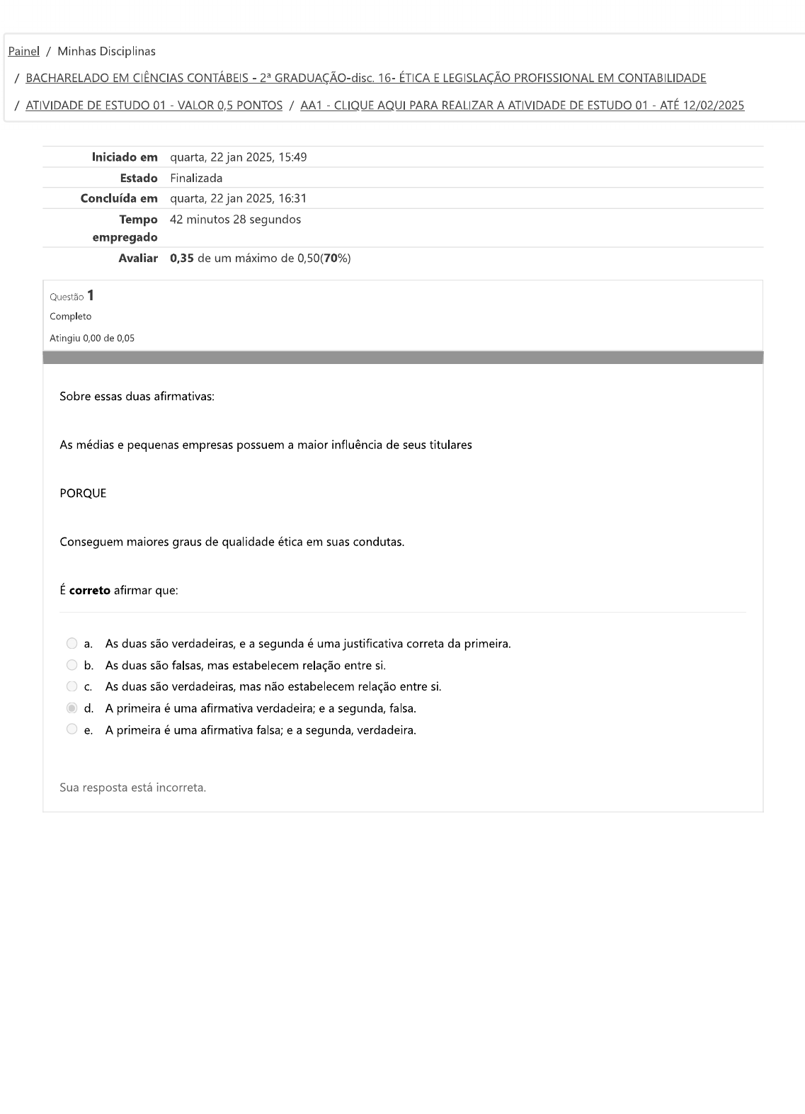 Painel / Minhas Disciplinas / BACHARELADO EM CIÊNCIAS CONTÁBEIS - GRADUAÇÃO-disc. 16- ÉTICA E LEGISLAÇÃO PROFISSIONAL EM CONTABILIDADE / ATIVIDADE DE ESTUDO 01 - VALOR 0,5 PONTOS / AA1 CLIQUE AQUI PARA REALIZAR A ATIVIDADE DE ESTUDO 01 - ATÉ 12/02/2025 Iniciado em quarta, 22 jan 2025, 15:49 Estado Finalizada Concluída em quarta, 22 jan 2025, 16:31 Tempo 42 minutos 28 segundos empregado Avaliar 0,35 de um máximo de 0,50(70%) Questão 1 Completo Atingiu 0,00 de 0,05 Sobre essas duas afirmativas: As médias e pequenas empresas possuem a maior influência de seus titulares PORQUE Conseguem maiores graus de qualidade ética em suas condutas. É correto afirmar que: a. As duas são verdadeiras, e a segunda é uma justificativa correta da primeira. b. As duas são falsas, mas estabelecem relação entre si. C. As duas são verdadeiras, mas não estabelecem relação entre si. d. A primeira é uma afirmativa verdadeira; e a segunda, falsa. e. A primeira é uma afirmativa falsa; e a segunda, verdadeira. Sua resposta está incorreta.Questão 2 Completo Atingiu 0,05 de 0,05 A ética é de grande importância no meio econômico e profissional, desde os atos simples de zelo e pontualidade, até os mais complexos, como o sigilo. Atitudes essas que tomam grande proporção no dia a dia e que, com o crescimento das empresas, nem sempre está presente, dando espaço para: a. A corrupção, negligências, egoísmo entre tantas outras ações antiéticas que conhecemos. b. Prejuízos e demissões. C. Descontroles emocionais e desmotivações. d. Roubo, furtos e fofocas. e. Desentendimentos, atitudes impensadas e grosserias no ambiente corporativo. Sua resposta está correta. Questão 3 Completo Atingiu 0,05 de 0,05 Estudamos que a Ética é um ato evolutivo, que se desenvolve ao longo do tempo e em conjunto com a evolução da sociedade. Pois nem tudo o que é visto com bons olhos hoje, foi assim no passado, não é mesmo? Um exemplo claro disso foi: Assinale V(verdadeiro) ou F(falso): ( ) na época da caça às bruxas, em que queimavam as mulheres vivas, por simplesmente acharem serem bruxas. ( ) na época da caça às bruxas, em que queimavam as mulheres vivas, por saber que eram bruxas. ( ) na época da caça às bruxas, em que violentavam as mulheres, por simplesmente acharem serem bruxas. ( ) na época da caça às bruxas, em que temiam e reprimiam as mulheres, por simplesmente acharem serem bruxas. a. b. V, V, F, V. C. F, V, F, F. d. V, F, F, F. e. F, V, F, V. Sua resposta está correta.Questão 4 Completo Atingiu 0,00 de 0,05 Comparato (2006) explica que a partir do ocaso da Idade Média, no século XIV, o exercício do poder político foi aos poucos se desvinculando dos velhos costumes éticos, e tendendo a ser visto como uma atividade livre de toda injunção moral ou obediência religiosa. Ou seja: Assinale a alternativa correta. a. Uma das características da modernidade é que, nunca, foram afastados os velhos costumes éticos, morais, religiosos e políticos da antiguidade, da era moderna. b. A principal e mais importante das características da modernidade é que, nunca, foram afastados os velhos costumes éticos, morais, religiosos e políticos da antiguidade, da era moderna. C. Uma das características da modernidade é que, aos poucos, foram afastados os velhos costumes éticos, morais, religiosos e políticos da antiguidade, da era moderna. d. Não temos entre as características da modernidade, o afastamento dos velhos costumes éticos, morais, religiosos e políticos da antiguidade, da era moderna. e. Uma das características da modernidade é que, jamais, foram afastados os velhos costumes éticos, morais, religiosos e políticos da antiguidade, da era moderna. Sua resposta está incorreta. Questão 5 Completo Atingiu 0,05 de 0,05 Sobre essas duas afirmativas: Dentro das organizações, a ética é um fator primordial. PORQUE Ela consegue melhorar os valores e conduta dos seres humanos. É correto afirmar que: a. As duas são verdadeiras, e a segunda é uma justificativa correta da primeira. b. A primeira é uma afirmativa falsa; e a segunda, verdadeira. C. As duas são falsas, mas estabelecem relação entre d. A primeira é uma afirmativa verdadeira; e a segunda, falsa. e. As duas são verdadeiras, mas não estabelecem relação entre si. Sua resposta está correta.Questão 6 Completo Atingiu 0,05 de 0,05 Nos dias de hoje, muito se fala a respeito de responsabilidade social, mas você sabe o que é isso? Assinale a alternativa correta: a. As empresas têm a obrigação de agir no melhor interesse da sociedade, apesar de sua existência não depender de autorização da sociedade. b. A doutrina da responsabilidade social tem sua origem na opinião de que as empresas nem sempre têm a obrigação de agir no melhor interesse da sociedade, apesar delas existirem com a autorização da sociedade. C. A doutrina da responsabilidade social tem sua origem na opinião de que as empresas têm a obrigação de agir no melhor interesse da sociedade, pois elas existem com a autorização da sociedade. d. As empresas não têm a obrigação de agir no melhor interesse da sociedade, apesar de sua existência depender de autorização da mesma. e. Apesar de sua existência depender de autorização da sociedade, as empresas não costumam dar a mínima para as necessidades dela. Sua resposta está correta. Questão 7 Completo Atingiu 0,00 de 0,05 Somos seres racionais, dotados de sentimentos, vontades e possuímos livre arbítrio. Mas por que alguns fazem coisas horríveis e outros não? Mesmo fazendo parte de um mesmo grupo, convivendo juntos, que nos faz ser tão diferentes uns dos outros? Escolha apenas uma alternativa, baseada nos conteúdos de nossa apostila: a. Ética não é um juízo de valores, como virtude, justiça, felicidade, e um julgamento da realidade. b. Pelo fato de que a ética analisa o que o homem faz, diferente da psicologia e a sociologia, que analisam o que ele deveri