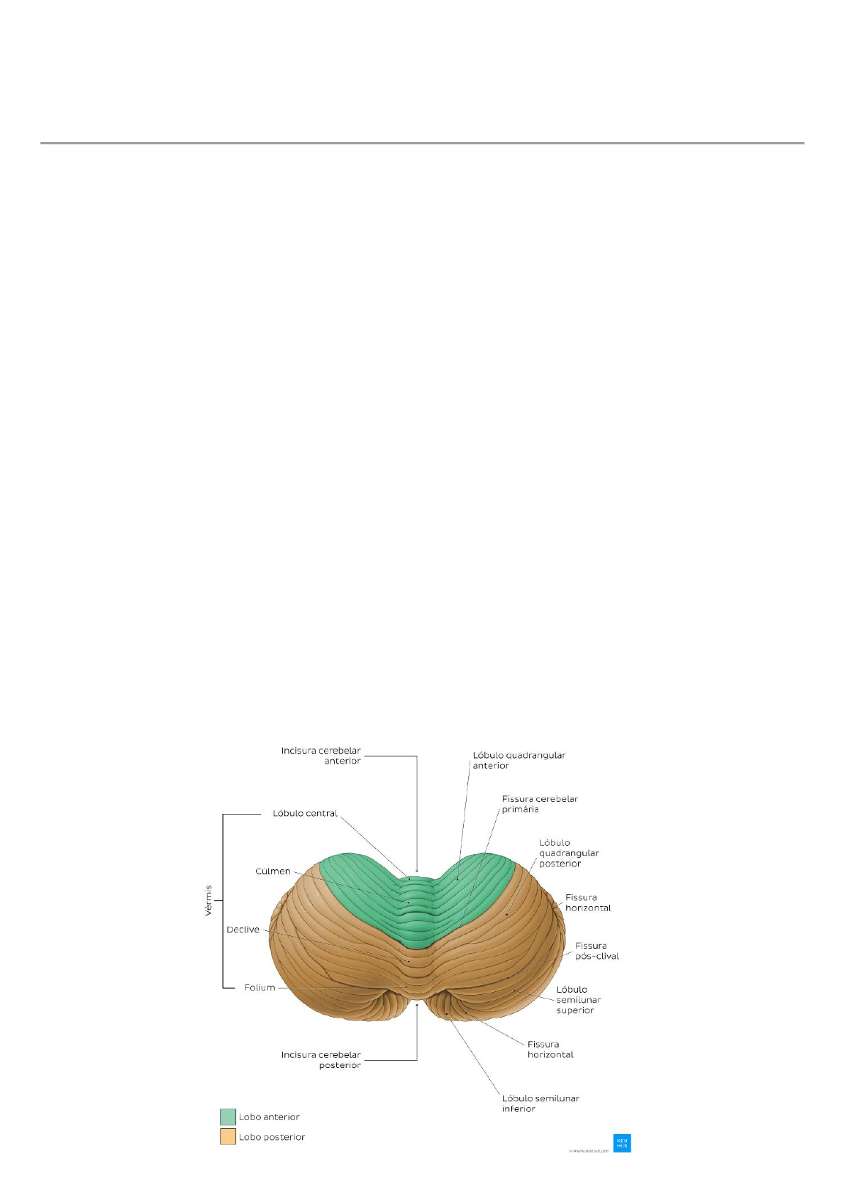 LUYZA VITÓRIA MATOS - 2° PERÍODO DE MEDICINA CEREBELO memória cerebelar → relacionada ao controle motor junto com o cérebro, é um órgão segmentar, ou seja, é todo compartimentado → órgão supra-segmentar ● os segmentos do cerebelo formam as folhas ● os segmentos do cérebro formam os giros o cerebelo faz conexão com a ponte e o bulbo por meio dos pedúnculos; está localizado na parte dorsal do mesencéfalo; protegido pelo osso occipital (fossa cerebelar); ele auxilia na formação do IV ventrículo ● OBS: o cerebelo e a fossa cerebelar não estão em contato, pois uma prega da dura-máter faz essa separação → tenda do cerebelo ponte e cerebelo controlam os movimentos finos TUMOR NO CEREBELO: geralmente é letal, pois se o tumor cresce em direção ao IV ventrículo ocorre uma obstrução deste ventrículo, logo não ocorre a circulação do LCR. Pode ocorre pressão no bulbo, e o paciente para de respirar se comunica com o encéfalo através dos pedúnculos, que são locais de inserção do cerebelo com a ponte e bulbo, e também são locais de comunicação ● PEDÚNCULO DO MESENCÉFALO: comunica medula, bulbo, ponte com o cérebro ● PEDÚNCULO CEREBELAR: comunica ponte e bulbo com o cerebelo ● o pedúnculo é dividido em 3 regiões: ○ PEDÚNCULO CEREBELAR SUPERIOR: conexão do cerebelo com o mesencéfalo ○ PEDÚNCULO CEREBELAR MÉDIO:conexão do cerebelo com o mesencéfalo ○ PEDÚNCULO CEREBELAR INFERIOR: conexão do bulbo e medula ao cerebelo ■ trato espinocerebelar chega até esse pedúnculo → adentra no cerebelo LUYZA VITÓRIA MATOS - 2° PERÍODO DE MEDICINA ANATOMIA DO CEREBELO: ● uma boa parte do cerebelo está sendo tampada pelo cérebro, o lóbulo quadrangular posterior fica visível ● fissura horizontal → primeira a ser formada ● fissura primária → segunda a ser formada ● o cerebelo possui lóbulos (faz parte dos lobos) e fissuras (que irão separar os lóbulos) ● a fissura primária divide o cerebelo em dois lobos → anterior e posterior ● no meio existe uma estrutura chamada de vermis, que é responsável por ligar hemisfério direito com o esquerdo ● NOS HEMISFÉRIOS: ○ acima da fissura prima → lóbulo quadrangular anterior do cerebelo ○ abaixo da fissura prima → lóbulo quadrangular posterior do cerebelo ○ fissura pós clival divide o lóbulo quadrangular posterior do lóbulo semilunar superior ○ abaixo da fissura horizontal → lóbulo semilunar inferior ● NO VERMIS: ○ o primeiro lóbulo do vermis é bem fino, e é chamado de lingula → está logo acima da ponte ○ acima da língula está o lóbulo central LUYZA VITÓRIA MATOS - 2° PERÍODO DE MEDICINA ○ separando a língula do lóbulo central está a fissura pré central ○ depois do lóbulo central está o cúmen → faz parte do lobo anterior ○ a fissura prima separa o cúmen do declive → faz parte do lobo posterior ○ depois do declive está o folium, e o que serpa essas regiões é a fissura pós clival ○ depois do folium, indo para a região ventral do cerebelo está o túber, e o que separa folium de tuber é a fissura horizontal ○ depois do túber existe a fissura pré piramidal e logo acima da fissura está a pirâmide ○ depois da pirâmide existe a fissura pós piramidal, e logo acima dela está a úvula ○ depois da úvula existe a fissura póstero lateral, e acima dela está o nódulo ■ nódulo + flóculo = nodulo flocular → equilíbrio ● a região de flóculo está na vista ventral e abaixo do pedúnculo ● abaixo do flóculo está a tonsila ● substância branca que une os dois pedúnculos superiormente é o véu medular superior, e inferiormente existe o véu medular inferior ● o espaço entre os véus observa-se o IV ventrículo DIVISÃO FUNCIONAL DO CEREBELO: ● funcionalmente o cerebelo é dividido em 3 regiões ○ VESTIBULOCEREBELO ■ região flóculo nodular ■ local onde é processado as informações de equilibrio ■ os núcleos vestibulares da ponte se conectam direto nesta região ○ ESPINOCEREBELO ■ região do vermis, e um pouco dos lóbulos quadrangulares ■ faz conexão com a medula ■ controle de musculatura esquelética ○ CEREBROCEREBELO ■ porções laterais do lóbulo quadrangular e semilunar LUYZA VITÓRIA MATOS - 2° PERÍODO DE MEDICINA ■ é o mapa motor → região do plano motor da execução do movimento CONEXÕES DO CEREBELO: estão vindo da medula ● CONEXÕES AFERENTE: ○ O espinocerebelo: recebe informações dos tratos espinocerebelar anterior e posterior (propriocepção dos músculos): zona medial e intermédia. ○ O pontocerebelo: recebe fibras aferentes do cérebro através dos núcleos pontinos, que se acredita estar envolvido no planejamento e iniciação de movimentos voluntários. ■ são as vias aferentes que conectam ponte e cerebelo ○ O vestibulocerebelo: origem de núcleos vestibulares; reflexos de equilíbrio/reflexos vestibulares e dos movimentos oculares. ■ nódulo e flóculo recebem informação do trato vestibular da medula e do trato teto espinal da medula ● CONEXÕES EFERENTES: ○ Espinocerebelar: influencia a atividade dos neurônios das vias rubroespinal e corticoespinal. Determinando a atividade dos neurônios motores da medula. ○ Pontocerebelar: responsável pelo plano motor do movimento, desce pela via dento-tálamo-cortical. ○ Vestibulocerebelar: modula o trato vestibuloespinal lateral e medial (músculos axiais), também influencia o trato tetoespinal