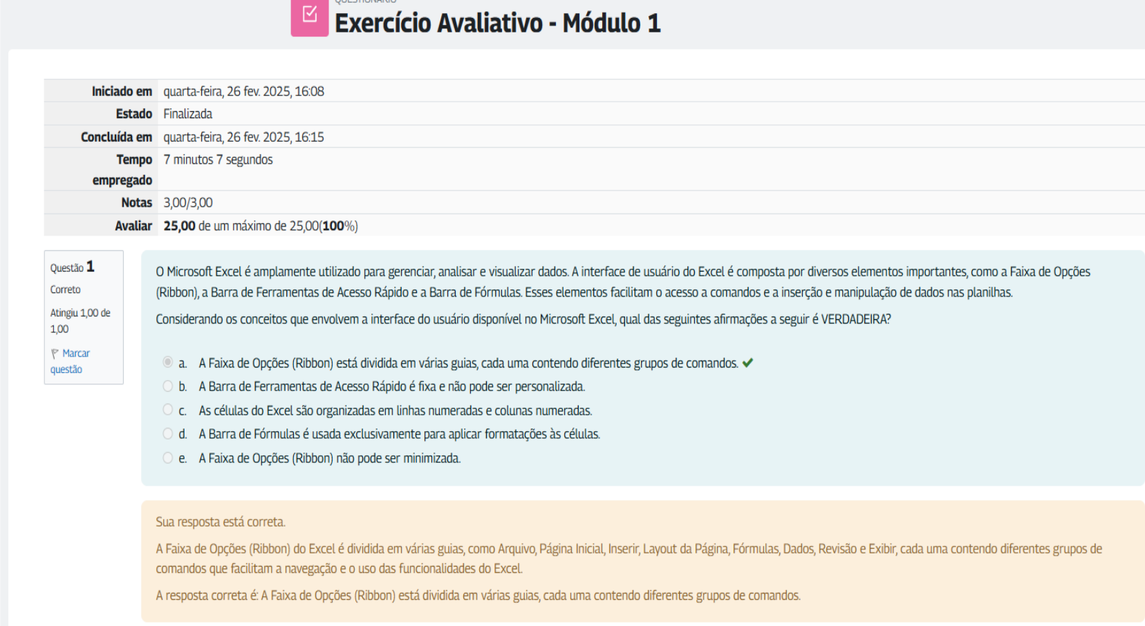 Exercício Avaliativo - Módulo 1 Iniciado em quarta-feira, 26 fev. 2025, 16:08 Estado Finalizada Concluída em quarta-feira, 26 fev. 2025, 16:15 Tempo 7 minutos 7 segundos empregado Notas 3,00/3,00 Avaliar 25,00 de um máximo de 25,00(100%) Questão 1 0 Microsoft Excel é amplamente utilizado para gerenciar, analisar e visualizar dados. A interface de usuário do Excel é composta por diversos elementos importantes, como a Faixa de Opções Correto (Ribbon), a Barra de Ferramentas de Acesso Rápido e a Barra de Fórmulas. Esses elementos facilitam acesso a comandos e a inserção e manipulação de dados nas planilhas. Atingiu 1,00 de Considerando os conceitos que envolvem a interface do usuário disponível no Microsoft Excel, qual das seguintes afirmações a seguir é VERDADEIRA? 1,00 P Marcar questão a. A Faixa de Opções (Ribbon) está dividida em várias guias, cada uma contendo diferentes grupos de comandos. b. A Barra de Ferramentas de Acesso Rápido é fixa e não pode ser personalizada. C. As células do Excel são organizadas em linhas numeradas e colunas numeradas. d. A Barra de Fórmulas é usada exclusivamente para aplicar formatações às células. e. A Faixa de Opções (Ribbon) não pode ser minimizada. Sua resposta está correta. A Faixa de Opções (Ribbon) do Excel é dividida em várias guias, como Arquivo, Página Inicial, Inserir Layout da Página, Fórmulas, Dados Revisão e Exibir, cada uma contendo diferentes grupos de comandos que facilitam a navegação e 0 uso das funcionalidades do Excel. A resposta correta A Faixa de Opções (Ribbon) está dividida em várias guias, cada uma contendo diferentes grupos de comandos.Questão 2 No Excel, uma pasta de trabalho é um arquivo que pode múltiplas planilhas, cada uma representando uma página separada para inserção, organização e análise de dados. Além das planilhas Correto em branco, o Excel oferece modelos pré-configurados para facilitar a criação de documentos comuns, como calendários, boletins e relatórios. Atingiu 1,00 de Considerando os conceitos que envolvem as pastas de trabalho no Microsoft Excel, qual das seguintes afirmações a seguir é VERDADEIRA? 1,00 Marcar a. questão As pastas de trabalho podem conter várias planilhas, acessíveis através de abas na parte inferior da interface do Excel. b. As pastas de trabalho no Excel só podem conter uma única planilha. C. Os modelos de pasta de trabalho no Excel não podem ser personalizados. d. As pastas de trabalho no Excel não suportam o uso de fórmulas. e. As pastas de trabalho são salvas apenas com a extensão .docx. Sua resposta está correta. As pastas de trabalho no Excel podem conter várias planilhas, que são acessíveis através de abas localizadas na parte inferior da interface do Excel. Isso permite organizar diferentes categorias ou tópicos de dados dentro de um único arquivo. A resposta correta é: As pastas de trabalho podem conter várias planilhas, acessíveis através de abas na parte inferior da interface do Excel. Questão 3 Excel é utilizado para organizar, analisar e visualizar dados. Antes de explorar os recursos avançados, é fundamental entender a estrutura básica e os modelos de pasta de trabalho que ele oferece. Correto Considerando os conceitos que envolvem os modelos de pastas de trabalho, assinale a alternativa que indica CORRETAMENTE a função dos modelos de pasta de trabalho no Excel. Atingiu 1,00 de 1,00 a. Modelos de pasta de trabalho fornecem estruturas predefinidas que facilitam a criação de novas planilhas com layout, formatação e fórmulas já configurados. Marcar questão b. Modelos de pasta de trabalho são utilizados para protegen planilhas contra alterações indesejadas. C. Modelos de pasta de trabalho servem exclusivamente para criar gráficos a partir de dados existentes. d. Modelos de pasta de trabalho são utilizados apenas para dados de outras fontes externas. e. Modelos de pasta de trabalho são arquivos que só podem ser utilizados uma vez e não podem ser modificados. Sua resposta está correta. Modelos de pasta de trabalho no Excel fornecem uma base estruturada que inclui layouts, formatação e fórmulas pré-configuradas, permitindo que usuário crie novas planilhas de maneira mais eficiente. A resposta correta Modelos de pasta de trabalho fornecem estruturas predefinidas que facilitam a criação de novas planilhas com layout, formatação e fórmulas já configurados.