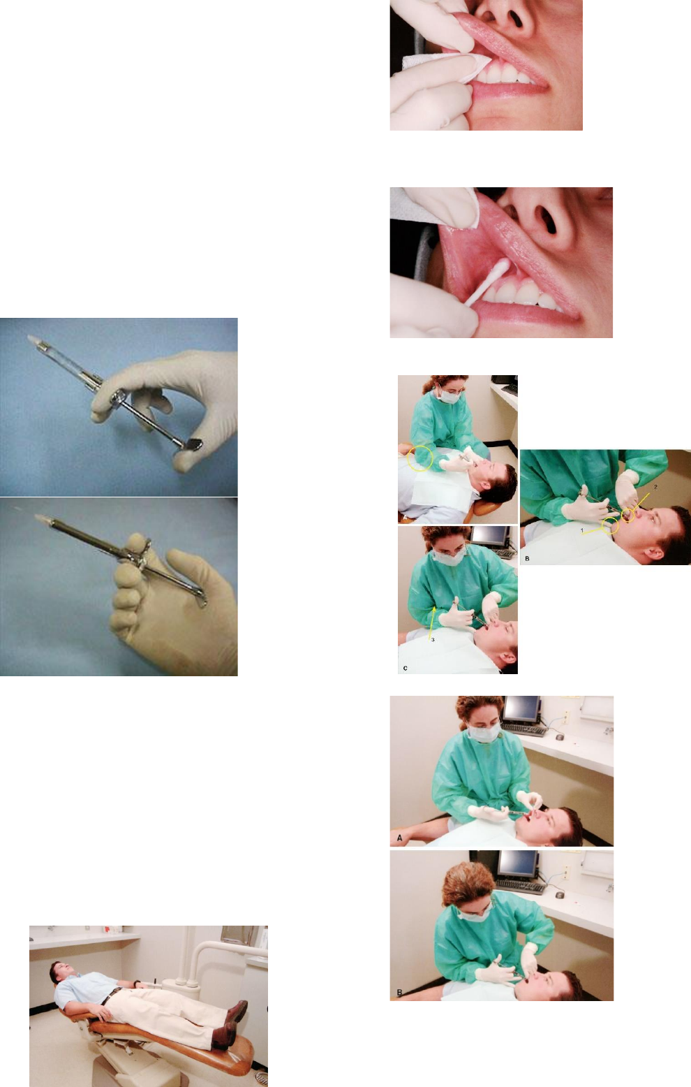 ANESTESIA LOCAL Deve ser absolutamente profunda para eliminar a sensação pulpar, do ligamento periodontal e dos tecidos moles adjacentes; Uma anestesia profunda resulta na perda da todas as sensações de dor. temperatura e toque, mas não anestesia as fibras proprioceptivas dos nervos envolvidos. O paciente sofre pressão. *O cirurgião deve lembrar que o paciente terá que distinguir entre a dor aguda e a sensação de pressão profunda, para se determinar a eficácia da anestesia. É essencial que o cirurgião lembre-se da inervação precisa de todos os dentes e dos tecidos adjacentes *EMPUNHADURA Técnica básica de injeção 1. Use uma agulha pontiaguda estetizada 2. Verifique o fluxo da solução anestésica local 3. Cartuchos armazenados em refrigeradores ou outras áreas frias devem estar na temperatura ambiente antes do uso 4. Posicione o paciente (decúbito dorsal - cabeça e coração paralelos ao solo, com os pés ligeiramente elevados) 5. Seque o tecido 6. Aplique um anestésico tópico 7. Estabeleça um apoio firme para a mão *MANEIRA INCORRETA 8. Mantenha a seringa fora da linha de visão do paciente 9. Deixe o tecido bem esticado 10. Introduza a agulha na mucosa 11. Observe o paciente e se comunique com ele 12. Injete algumas gotas da solução anestésica/Faça a agulha avançar lentamente até o alvo 13. Deposite algumas gotas do anestésico local antes de tocar o periósteo 14. Aspire 15. Deposite lentamente a solução anestésica local 16. Retire lentamente a seringa 17. Observe o paciente Anestesia- Tipos de Anestesia: • Infiltração Local • Bloqueio de campo • Bloqueio de Nervo Infiltração Local Bloqueio do campo Bloqueio do nervo Tipos de Anestesias: • anestesia terminal A. tópica B. infiltrativa ▪ Anestesia por bloqueio A. bloqueio regional B. bloqueio troncular ANESTESIA LOCAL/ BLOQUEIO NERVO ALVEOLAR INFERIOR E BLOQUEIO DO NERVO BUCAL Bloqueio nervo mentual e nervo incisivo A inervação da gengiva vestibular inferior na região anterior é variável: ela pode ser inervada pelo n. mentual ou pelos ramos incisivos. Parece que ambos o fazem, contudo o n. mentual Inerva mais próximo à região mucogengival e lábio Inferior, e os ramos incisivos, mais próximo à gengiva inserida. Mandíbula = Pontos de referência para as Técnicas A. Canal e forame mandibular B. Canal e forame mentual C. Fossa refromolar D. Linha obliqua E. Trigono retromolar F. Borda anterior do ramo da mandibula G. Linha milo-hididea h) Forame mentual Mandíbula • Bloquelo Regional Mandibular • Técnica anestésica NERVO ALVEOLAR INFERIOR -indireta Técnica direta BLOQUEIO DO NERVO BUCAL Molares inferiores- troncular • Bloquelo Regional Mentoniano • Nervos anestesiados: Nervo mentoniano. • Região anestesiado • Técnica Mandíbula Incisivos e Caninos Inferiores • Nervo anestesiado: ramos terminais do nervo alveolar inferior. • Região anestesiada • Técnica Maxila -Bloqueio do nervo infra-orbitário Emite os seguintes ramos: -Principals • Alveolar superior anterior • Alveolar superior médio -Terminais • Ramo Palpebral Inferior • Ramo Nasal Lateral • Ramo Labial Superior Bloqueio nervo alveolar superior posterios Bloqueio do nervo alveolar superior anterior Bloqueio nervo alveolar superior anterior Conduzem sensibilidade dos caninos e dos incisivos superiores, periodonto, gengiva vestibular dessa região, tecido ósseo da maxila e parte da mucosa do seio maxilar. Bloqueio nervo alveolar superior medio Conduzem sensibilidade da raiz mésio-vestibular do 1' molar superior, dos pré-molares superiores, periodonto, gengiva vestibular dessa área, tecido ósseo da maxila e parte da mucosa do selo maxilar. Bloqueio nervo alveolar superior posterior Conduzem fibras sensitivas dos dentes molares superiores, exceto da raiz mésio-vestibular do 1° molar; períodonto, gengiva vestibular na reglão desses molares, tecido ósseo da maxila dessa reglão, mucosa do selo maxilar e parte da mucosa da bochecha. Maxila- bloqueio do nervo alveolar superoposterior • Áreas Anestesiadas • Polpas do terceiro, segundo e primeiro molares superiores • Obs: raiz mésiovestibular do primeiro molar superior não é anestesiada = 28% • Tecido periodontal vestibulor e osso sobrejacente a estes dentes Técnica Bloqueio do nervo alveolar superoposterior • Técnica Profundidade desejado em adultos (agulha curta - aproximadamente 4 mm devem permanecer visiveis) • ½ a 1 tubete Nervo palatino É a continuação do nervo pterigopalatino. Dentro do canal palatino ele se divide em: Nervo Palatino Maior e Nervo Palatino Menor. Nervo nasopalatino Ramo do nervo esfenopalatino, originado do gânglio pterigopalatino. Dá sensibilidade à mucosa do septo e do palato, na região de canino a canino. Maxila Pontos de referência para as técnicas anestésicas: a) Canal e forame infra-orbital b) Canais e foraminas alveolares c) Canal e forame incisivo d) Canal e forame palatino maior e) Canal e forame palatino menor 1) Crista infrazigomática g) Face posterior da maxila (túber da maxila) h) Hámulo pterigóideo Supraperiosteal Incicações • Anestesia pulpar dos dentes → quando o tratamento é limitado a um ou dois dentes • Anestesia dos tecidos moles Contraindicações • Infecção ou inflamação aguda na área da injeção • Osso denso recobrindo os ópices dentários Vantagens • Alta taxa de sucesso (≥95%) • Injeção tecnicamente fácil • Em geral é atraumática Desvantagens • Não recomendada para grandes áreas → Necessidade de multiplas introduções da agulhas → Administração de maior volume anestésico Supraperiosteal Vantagens • Alta taxa de sucesso • Injeção tecnicamente fácil • Em geral é atraumatica Desvantagens • Não recomendada para grandes areas, pois -necessita de múltiplas introduções de agulha -Administração do maior volume Anestésico - Supraperiosteal (Infiltração Técnica • Calibre da agulha. • Área de intro