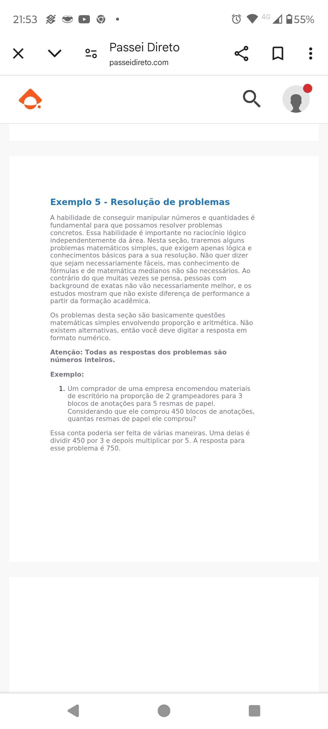 21:53 4G 55% Passei Direto X passeidireto.com Exemplo 5 Resolução de problemas A habilidade de conseguir manipular números e quantidades é fundamental para que possamos resolver problemas concretos. Essa habilidade é importante no raciocínio lógico independentemente da área. Nesta seção, traremos alguns problemas matemáticos simples, que exigem apenas lógica e conhecimentos básicos para a sua resolução. Não quer dizer que sejam necessariamente fáceis, mas conhecimento de fórmulas e de matemática medianos não são necessários. Ao contrário do que muitas vezes se pensa, pessoas com background de exatas não vão necessariamente melhor, e os estudos mostram que não existe diferença de performance a partir da formação acadêmica. Os problemas desta seção são basicamente questões matemáticas simples envolvendo proporção e aritmética. Não existem alternativas, então você deve digitar a resposta em formato Atenção: Todas as respostas dos problemas são números Exemplo: 1. Um comprador de uma empresa encomendou materiais de escritório na proporção de 2 grampeadores para 3 blocos de anotações para 5 resmas de papel. Considerando que ele comprou 450 blocos de anotações, quantas resmas de papel ele comprou? Essa conta poderia ser feita de várias maneiras. Uma delas é dividir 450 por 3 e depois multiplicar por 5. A resposta para esse problema é 750.