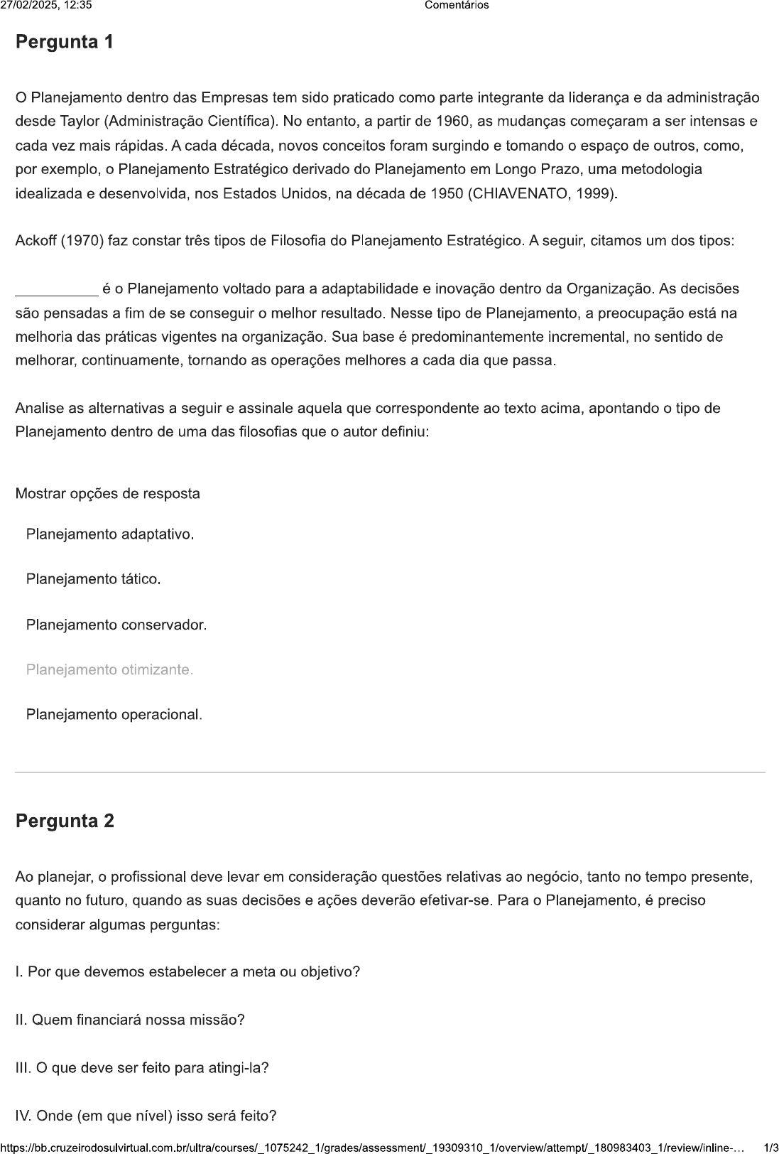 27/02/2025, 12:35 Comentários Pergunta 1 O Planejamento dentro das Empresas tem sido praticado como parte integrante da liderança e da administração desde Taylor (Administração Científica). No entanto, a partir de 1960, as mudanças começaram a ser intensas e cada vez mais rápidas. A cada década, novos conceitos foram surgindo e tomando o espaço de outros, como, por exemplo, o Planejamento Estratégico derivado do Planejamento em Longo Prazo uma metodologia idealizada e desenvolvida, nos Estados Unidos, na década de 1950 (CHIAVENATO, 1999). Ackoff (1970) faz constar três tipos de Filosofia do Planejamento Estratégico. A seguir, citamos um dos tipos: é o Planejamento voltado para a adaptabilidade e inovação dentro da Organização. As decisões são pensadas a fim de se conseguir o melhor resultado. Nesse tipo de Planejamento, a preocupação está na melhoria das práticas vigentes na organização. Sua base é predominantemente incremental, no sentido de melhorar, continuamente, tornando as operações melhores a cada dia que passa. Analise as alternativas a seguir e assinale aquela que correspondente ao texto acima, apontando o tipo de Planejamento dentro de uma das filosofias que o autor definiu: Mostrar opções de resposta Planejamento adaptativo. Planejamento tático. Planejamento conservador. Planejamento otimizante. Planejamento operacional. Pergunta 2 Ao planejar, o profissional deve levar em consideração questões relativas ao negócio, tanto no tempo presente, quanto no futuro, quando as suas decisões e ações deverão efetivar-se. Para o Planejamento, é preciso considerar algumas perguntas: I. Por que devemos estabelecer a meta ou objetivo? II. Quem financiará nossa missão? III. que deve ser feito para atingi-la? IV. Onde (em que nível) isso será feito? 1/327/02/2025, 12:35 Comentários V. Quando isso será feito? Qual é sua programação no tempo? VI. Como será feito? VII. Quem vai fazer? VIII. Quanto custa? As características elencadas acima são, RESPECTIVAMENTE: Mostrar opções de resposta V, V, V, V, V, V, V. V, V, V, V, V, V, V, V. V, F, V, V, F, V, V, V. V, V, V, V, F, V, V, F. V, F, V, V, V, V, V, V. Pergunta 3 Os Planejamentos Estratégico, Tático e Operacional devem ser trabalhados em conjunto. De modo geral, o Planejamento estratégico está ligado aos objetivos de longo prazo e com estratégias e ações que afetam a Empresa como um todo. Os Planejamentos tático e operacional relacionam-se a objetivos de médio e curto prazo e com estratégias e ações que, normalmente, afetam parte da Empresa. Leia o trecho a seguir a fim de identificar a qual Planejamento estamos nos referindo: "[...]. criação de objetivos e estratégias destinados a alcançar metas de departamentos específicos ao longo de um intervalo de tempo médio" (CHURCHILL, 2000, p. 86). Analise as alternativas a seguir e assinale a CORRETA em relação ao tipo de Planejamento a que se refere o texto: Mostrar opções de resposta Planejamento 2/312:35 Comentários Planejamento adaptativo. Planejamento estratégico. Planejamento conversador. Planejamento otimizante. Pergunta 4 Oliveira (2015) destaca três tipos de Planejamento, considerando os níveis hierárquicos numa pirâmide organizacional. Leia o trecho a seguir a fim de identificar o tipo de Planejamento a que estamos nos referindo: [...] criam condições para a adequada realização dos trabalhos diários da Empresa. Ele é pensado no curto prazo e abarca cada uma das tarefas e metas da Empresa. Por ser a última etapa de Planejamento, deve ser um plano mais delineado, tentando explicar cada tarefa isoladamente. Analise as alternativas a seguir e assinale a CORRETA em relação ao tipo de Planejamento a que se refere o texto: Mostrar opções de resposta Planejamento estático. Planejamento operacional. Planejamento conservador. Planejamento estratégico. Planejamento tático.