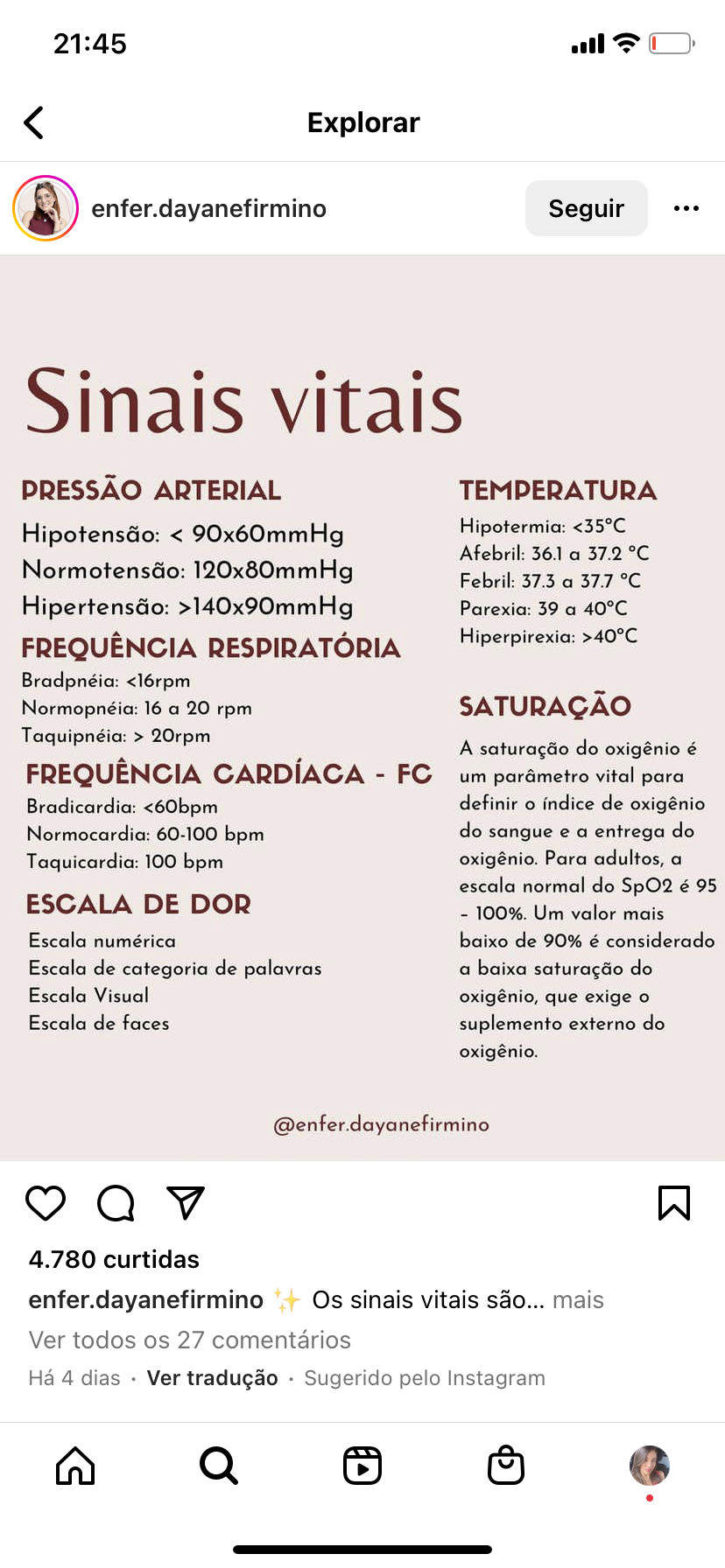 21:45 Explorar enfer.dayanefirmino Seguir Sinais vitais PRESSÃO ARTERIAL TEMPERATURA Hipotensão: 140x90mmHg Parexia: 39 a 40°C FREQUÊNCIA RESPIRATÓRIA Hiperpirexia: >40°C Bradpnéia: 20rpm A saturação do oxigênio é FREQUÊNCIA CARDÍACA - FC um parâmetro vital para Bradicardia: