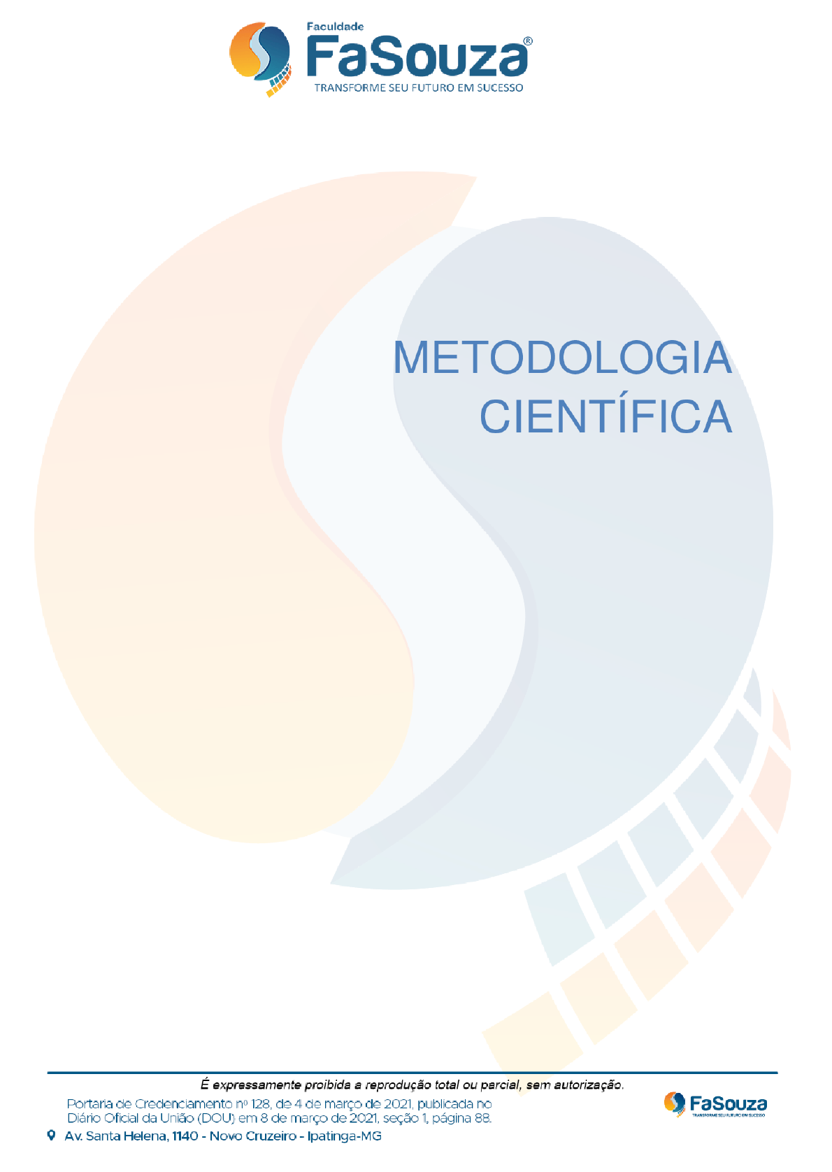 Faculdade R TRANSFORME SEU FUTURO EM SUCESSO METODOLOGIA CIENTÍFICA É expressamente proibida a reprodução total ou parcial, sem autorização. Portaria de Credenciamento n° 128, de 4 de março de 2021, publicada no FaSouza Diário Oficial da União (DOU) em 8 de março de 2021, seção 1, página 88. Av. Santa Helena, 1140 - Novo Cruzeiro - Ipatinga-MGFaculdade R TRANSFORME SEU FUTURO EM SUCESSO Página 1 de 94 METODOLOGIA GISELE BISCHOFF Apresentação Caros alunos, bem-vindos à disciplina de Metodologia científica da Faculdade Souza. Esta disciplina é importantíssima, pois seus fundamentos servirão de base para toda sua vida acadêmica. Além disso, os conceitos aqui apresentados também auxiliam em sua atuação profissional como pedagogo. A base da Metodologia científica é desenvolver a análise crítica e reflexiva acerca do mundo, bem como fornece as ferramentas para o desenvolvimento da pesquisa e do trabalho acadêmico. Trata-se, então, de um conteúdo organizado para facilitar a pesquisa e a produção de trabalhos conforme as normas científicas. Assim, pense nessa disciplina como algo complementar às demais, afinal, os instrumentos aqui aprendidos auxiliarão na produção de todas as atividades de sua formação. O conteúdo de Metodologia científica pode, então, servir de apoio para consultas e esclarecimentos quanto às normas científicas, desenvolvimento de trabalhos e pesquisas. Esta apostila foi dividida em cinco unidades, visando uma aprendizagem autônoma, com conteúdo cuidadosamente selecionados para facilitar o estudo à distância. Mas lembre-se de que você não está sozinho, podendo sempre contar com o auxílio do professor-tutor. Bons estudos! Muito sucesso nesta disciplina e em todo curso! 1 Este material trata-se da compilação de alguns textos que versam sobre a METODOLOGIA A organizadora deste material selecionou os trabalhos e salientou alguns recortes para enriquecer a temática desta apostila. Assim, os créditos autorais dos estudos selecionados estão devidamente referenciados nas figuras ilustrativas e nas referências bibliográficas. 2 Pós-doutora em Educação pela UNICAMP. Doutora em História Social pela PUC-SP. Professora do ensino básico e superior. É expressamente proibida a reprodução total ou parcial, sem autorização. Portaria de Credenciamento n° 128, de 4 de março de 2021, publicada no FaSouza Diário Oficial da União (DOU) em 8 de março de 2021, seção 1, página 88. Av. Santa Helena, 1140 Novo Cruzeiro Ipatinga-MGFaculdade R TRANSFORME SEU FUTURO EM SUCESSO Página 2 de 94 Sumário Unidade 1 - Ciência e conhecimento científico 1.1 - que é ciência 1.2 - Tipos de conhecimento 1.3 - A origem dos tipos de conhecimento Unidade 2 - Leitura, documentação e estudo no Ensino Superior 2.1 - Participação nas aulas 2.2 - Aproveitamento da leitura 2.3 - Registros e documentação 2.4 - Mapa conceitual Unidade 3 - Normatização dos trabalhos acadêmicos - parte I 3.1 - ABNT 3.2 - Métodos de pesquisa 3.3 - Modalidades de pesquisa Unidade 4 - Normatização dos trabalhos acadêmicos - parte II 4.1 - Técnicas de pesquisa 4.2 - Estudo de caso (ou métodos monográficos) Unidade 5 - Modalidades dos trabalhos científicos-acadêmicos 5.1 - Tipos de documentos científicos 5.2 - Projeto de pesquisa 5.3 - Trabalho de conclusão de curso (TCC) Unidade 6 - Formatação dos trabalhos acadêmicos 6.1 - Normas gerais para a formatação dos trabalhos científicos 6.2 - Citações 6.3 - Referências bibliográficas Conclusão Referências bibliográficas É expressamente proibida a reprodução total ou parcial, sem autorização. Portaria de Credenciamento 128, de 4 de março de 2021, publicada no FaSouza Diário Oficial da União (DOU) em 8 de março de 2021, seção 1, página 88. SEU Av. Santa Helena, 1140 - Novo Cruzeiro Ipatinga-MGFaculdade R TRANSFORME SEU FUTURO EM SUCESSO Página 3 de 94 Unidade 1 - Ciência e conhecimento científico Metodologia Científica é a disciplina que "estuda os caminhos do saber", entendendo que "método" representa caminho, "logia" significa estudo e "ciência", saber e conhecimento. O objetivo desta primeira unidade é analisar o conhecimento científico, como um instrumento que ajuda a compreender a explicar os fenômenos que ocorrem à nossa volta. Todo o conhecimento acumulado até hoje é resultado das experiências científicas. À medida que se descobrem as respostas para as indagações que inquietavam o passado, novos questionamentos vão surgindo e novas experiências vão ocorrendo. Exemplo disso, são os mais variados tipos de remédios que existem no mercado e a cura doenças, que no início do século XX eram fatais. Se pensarmos no desenvolvimento da tecnologia, confirmaremos ainda mais na evolução do conhecimento e na necessidade da cientificidade. Mas, nem todos os tipos de conhecimento pertencem à ciência, como o conhecimento do senso comum entre outros. É importante saber identificá-los e reconhecê-los. 1.1 - o que é a ciência Desde a sua origem, o ser humano interage com a natureza e os objetos ao seu alcance, observando as relações sociais e culturais no meio em que vive. Através dessa observação e da sua interação com as pessoas e os objetos, que o homem adquire conhecimento. O conhecimento pode ser adquirido de diversas formas: sensação, percepção, imaginação, memória, linguagem, raciocínio e intuição. Assim, o ato de conhecer significa adquirir um conceito novo sobre um fenômeno, fato ou situação, o qual pode nascer da experiência acumulada em nosso dia-a-dia. A ciência é uma forma de conhecimento desenvolvida pelo ser humano. A palavra ciência vem do latim scientia, que significa e da palavra scire, que significa ou 'saber'. Segundo Marconi e Lakatos (2008, p. 22), a ciência "é um conjunto de atitudes e atividades racionais, dirigidas ao sistemático conhecimento com objeto limitado, capaz de ser submetido à verificação". Iss