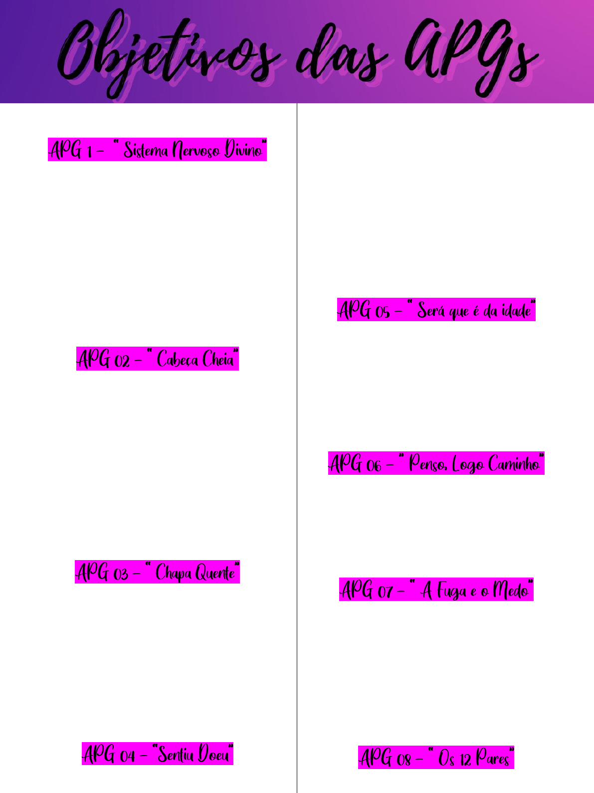 Entender a anatomia e histologia do Sistema Nervoso (SNC e SNP); Compreender a anatomia e histologia dos neurônios e células da glia e os tipos de neurônios; Compreender a importância do potencial de ação para a neurotransmissão e a fisiologia das sinapses; Identificar os neurotransmissores e explicar suas funções; Compreender a embriologia do Sistema Nervoso; Conhecer a anatomia das meninges e suas funções; Compreender a localização, importância e histologia do plexo coroide, das meninges e do canal ependimário; Estudar a função do líquor, sua produção, circulação e reabsorção; Conhecer os ventrículos e cavidades do encéfalo; Estudar a anatomia e fisiologia da medula espinhal; Estudar a anatomia, fisiologia e embriologia dos nervos espinhais; Compreender como ocorrem as ações do arco reflexo; Estudar a anatomia e fisiologia da coluna vertebral; Compreender a histologia da pele; Entender a fisiologia e anatomia dos receptores sensoriais da pele; Compreender a fisiologia das vias aferentes (sensitivas); Estudar as principais estruturas do telencéfalo que recebem e processam os estímulos somatossensoriais; Entender o que são e quais são os dermátomos do corpo humano; Compreender a anatomia e fisiologia do telencéfalo e diencéfalo; Analisar as áreas de Browdman; Explicar e compreender os homúnculos; Entender como o envelhecimento impacta na situação social dos idosos; Estudar a morfofisiologia dos núcleos da base cerebelo e córtex cerebral; Entender a fisiologia do sistema motor (vias eferentes); Estudar a morfofisiologia do sistema límbico e sistema nervoso autônomo; Compreender os mecanismos que motivam as reações e emoções do corpo; Explicar o sistema autônomo; Explicar os receptores do sistema autônomo (muscarínicos e nicotínicos); Entender a anatomia e fisiologia dos 12 pares de nervos cranianos; Explicar a morfologia do tronco encefálico; Estudar a embriologia do sistema auditivo; Compreender a anatomia do sistema auditivo; Entender a histologia do sistema auditivo; Estudar a fisiologia da audição e vias; Compreender a anatomia da região oral e nariz; Entender a anatomia dos receptores e vias olfatórias; Estudar a anatomia do sistema gustatório; Compreender a histologia da cavidade nasal e faringe e do sistema gustatório; Entender a fisiologia da olfação e da gustação; Compreender a anatomia, histologia e embriologia do sistema visual; Entender a fisiologia da visão; Estudar a histologia do sistema muscular; Compreender a anatomia dos membros inferiores (ossos, músculos e articulações); Entender a fisiologia da contração muscular esquelética e o processo de acoplamento- excitação-contração; Entender o funcionamento da placa motora e junção neuromuscular; Compreender a histologia do tecido ósseo; Compreender a fisiologia do metabolismo do cálcio; Estudar sobre a histogênese (processos de ossificação); Ressaltar as diferenças anatômicas de uma pelve masculina e feminina; Falar das medidas de prevenção contra a queda do idoso; Compreender a histologia do tecido cartilaginoso; Entender o processo de reparo e remodelação óssea; Compreender a anatomia dos membros superiores (ossos, músculos e articulações) e a biomecânica do ombro; Estudar a embriologia da hipófise e hipotálamo; Compreender a anatomia e histologia do eixo e citar as glândulas periféricas; Explicar a fisiologia do eixo hipotálamo- hipófise; Explicar a fisiologia do hormônio do crescimento e citar as fases do crescimento; Entender a anatomia e histologia do pâncreas; Explicar a fisiologia dos hormônios pancreáticos insulina e glucagon; Compreender a embriologia da tireoide e paratireoide; Estudar a anatomia e histologia das glândulas tireoide e paratireoide; Compreender a fisiologia dos hormônios produzidos por essas glândulas e o eixo hipotálamo-hipófise-tireoide; Citar os tipos de erros médicos (Negligência, Imprudência e Imperícia); Compreender a embriologia das glândulas suprarrenais; Estudar a morfologia das suprarrenais e compreender o eixo hipotálamo-hipófise- adrenal; Compreender a relação de glicorticóide no organismo com a obesidade; Entender a relação do eixo hipotálamo hipófise e adrenal com a resposta imune; Compreender a embriologia do sistema reprodutor feminino e masculino; Estudar a anatomia e histologia do sistema reprodutor feminino e masculino; Explicar o processo de gametogênese; Entender como ocorre o processo de fecundação e nidação; Compreender o ciclo de desenvolvimento embrionário e fetal; Entender as mudanças físicas e hormonais que ocorrem durante a gestação; Diferenciar idade embrionária e gestacional; Compreender a anatomia e histologia das mamas; Explicar como ocorre o processo de contração da musculatura lisa; Entender a fisiologia da lactação; Compreender as fases e os hormônios envolvidos no ciclo menstrual; Depreender sobre a fisiologia do parto; Compreender a função das células- tronco; Estudar a embriologia do sistema urinário; Entender a anatomia renal (topografia, estrutura, vascularização e segmentação renal); Compreender a fisiologia do sistema urinário (filtração, reabsorção e excreção do sistema renal); Estudar a histologia do sistema renal; Explicar a fisiologia da micção; Estudar como os mecanismos renais auxiliam na regulação da pressão arterial (regulação renal/ sistema renina angiotensina - aldosterona); Descrever a regulação ácido - base no sangue e urina;