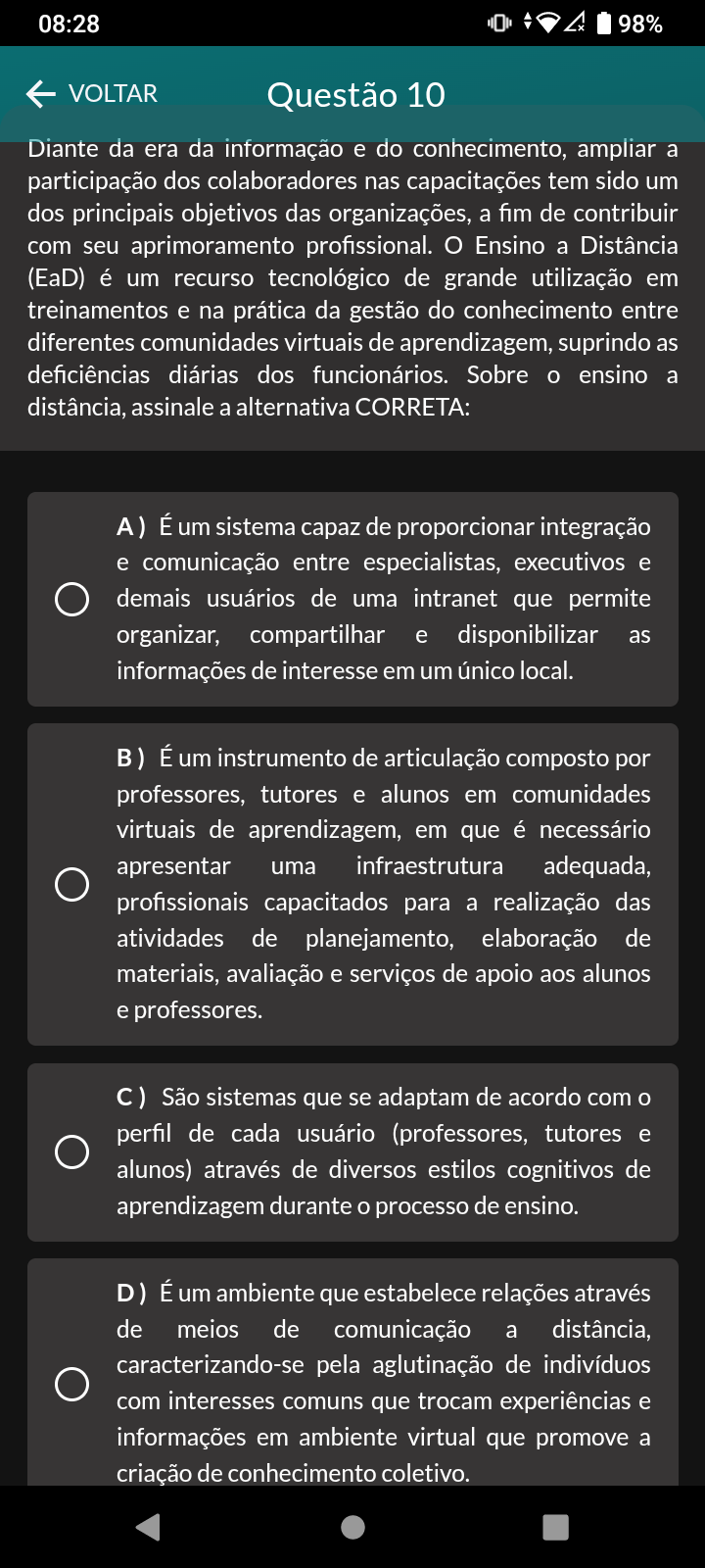 08:28 98% VOLTAR Questão 10 Diante da era da informação e do conhecimento, ampliar a participação dos colaboradores nas capacitações tem sido um dos principais objetivos das organizações, a fim de contribuir com seu aprimoramento profissional. O Ensino a Distância (EaD) é um recurso tecnológico de grande utilização em treinamentos e na prática da gestão do conhecimento entre diferentes comunidades virtuais de aprendizagem, suprindo as deficiências diárias dos funcionários. Sobre ensino a distância, assinale a alternativa CORRETA: A) É um sistema capaz de proporcionar integração e comunicação entre especialistas, executivos e demais usuários de uma intranet que permite organizar, compartilhar e disponibilizar as informações de interesse em um único local. B) É um instrumento de articulação composto por professores, tutores e alunos em comunidades virtuais de aprendizagem, em que é necessário apresentar uma infraestrutura adequada, profissionais capacitados para a realização das atividades de planejamento, elaboração de materiais, avaliação e serviços de apoio aos alunos e professores. C) São sistemas que se adaptam de acordo com perfil de cada usuário (professores, tutores e alunos) através de diversos estilos cognitivos de aprendizagem durante processo de ensino. D) É um ambiente que estabelece relações através de meios de comunicação a distância, caracterizando-se pela aglutinação de indivíduos com interesses comuns que trocam experiências e informações em ambiente virtual que promove a criação de conhecimento coletivo.